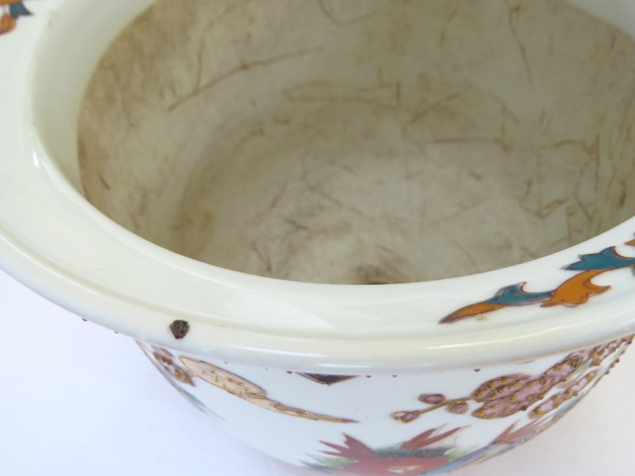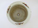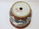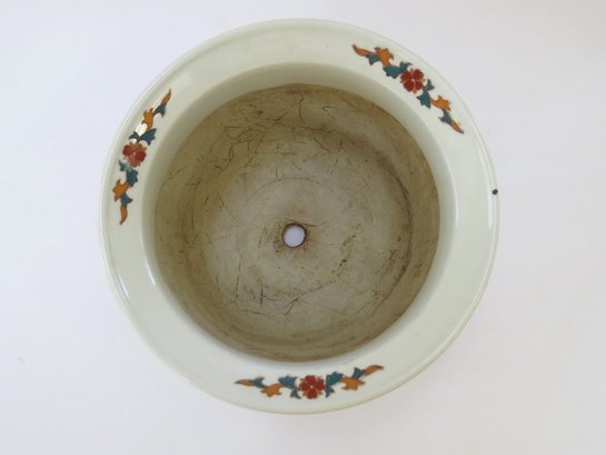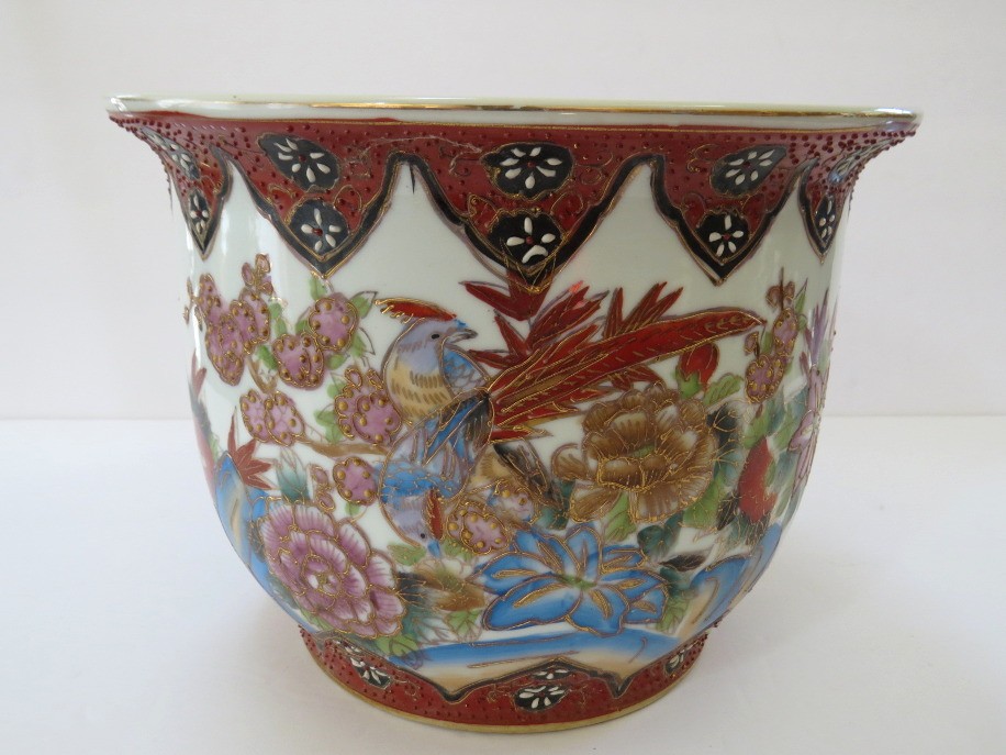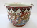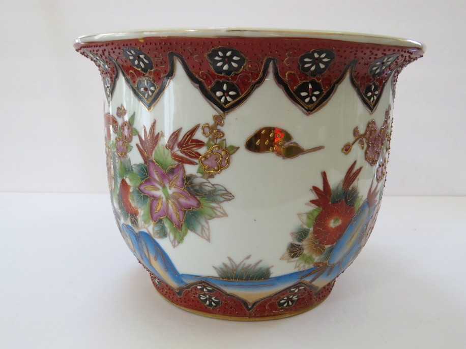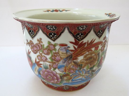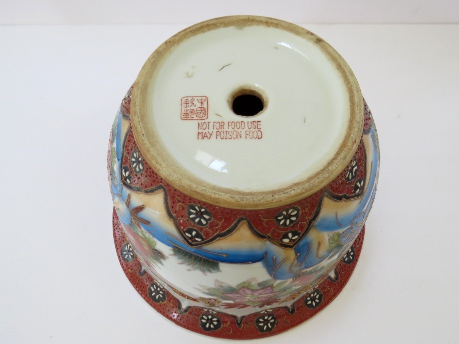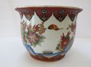 A true work of art that blends elegance, symbolism, and craftsmanship. The cachepot measures 6 3/4" tall with a 9"diameter and features vibrant hand-painted elements rich with meaning all accented with touches of shimmering gold in the Moriage style. This cachepot appears to have a small nick on the rim and does not have an underplate. The rim design matches the lot of 2 Chinese planters in this auction.