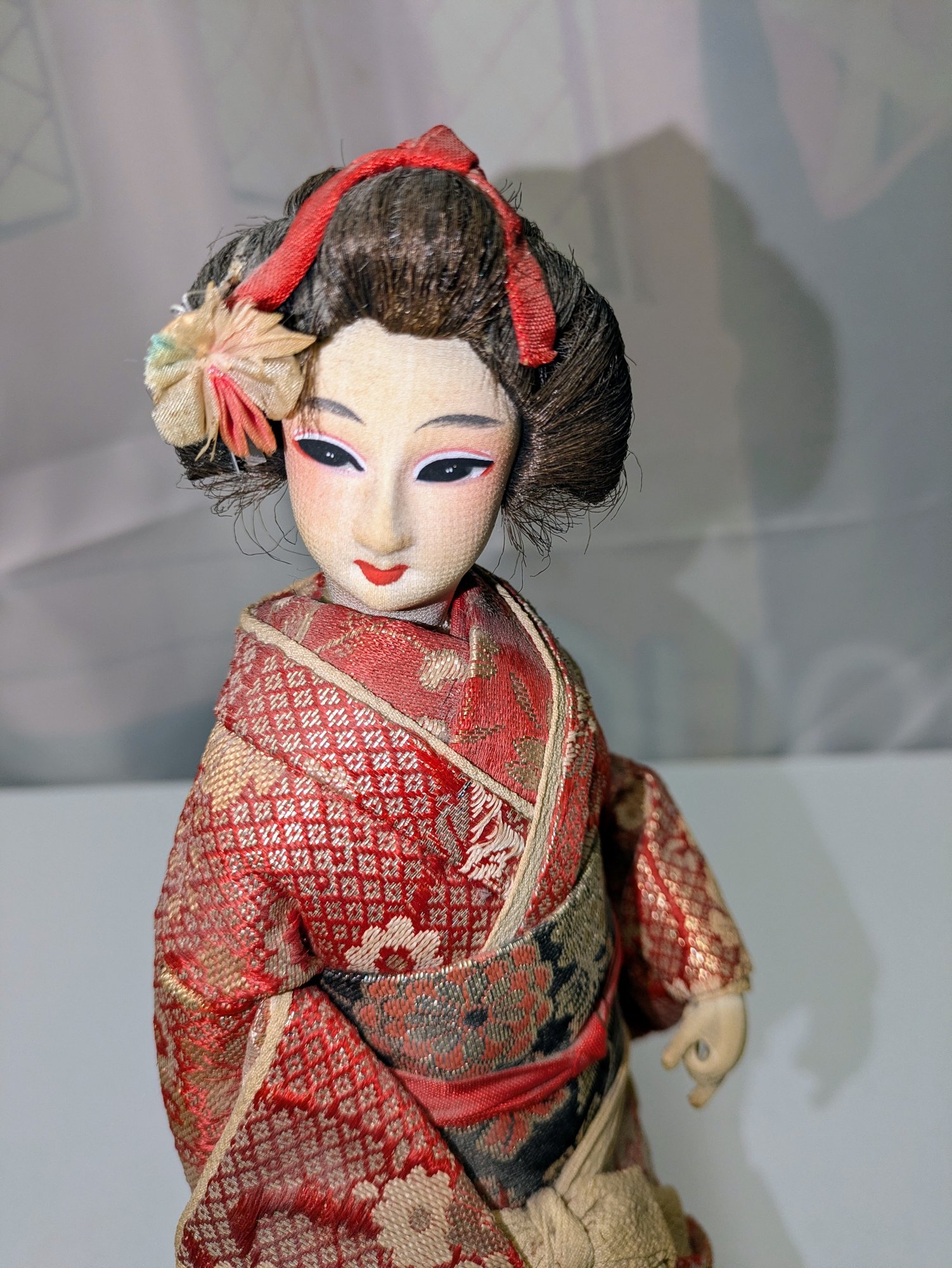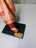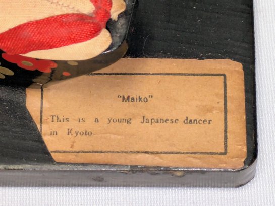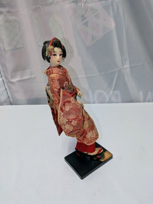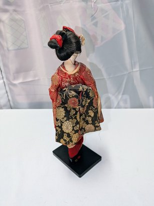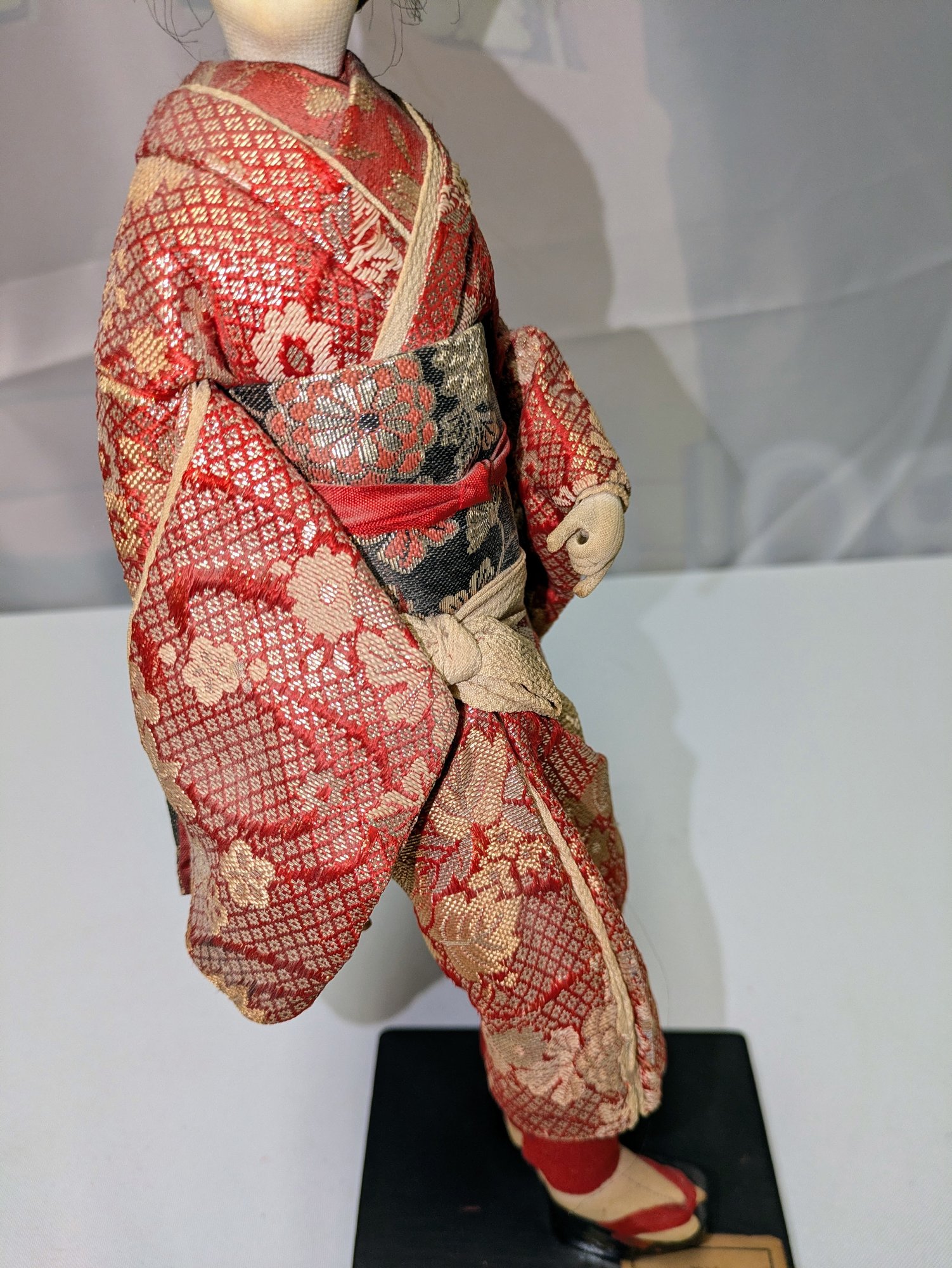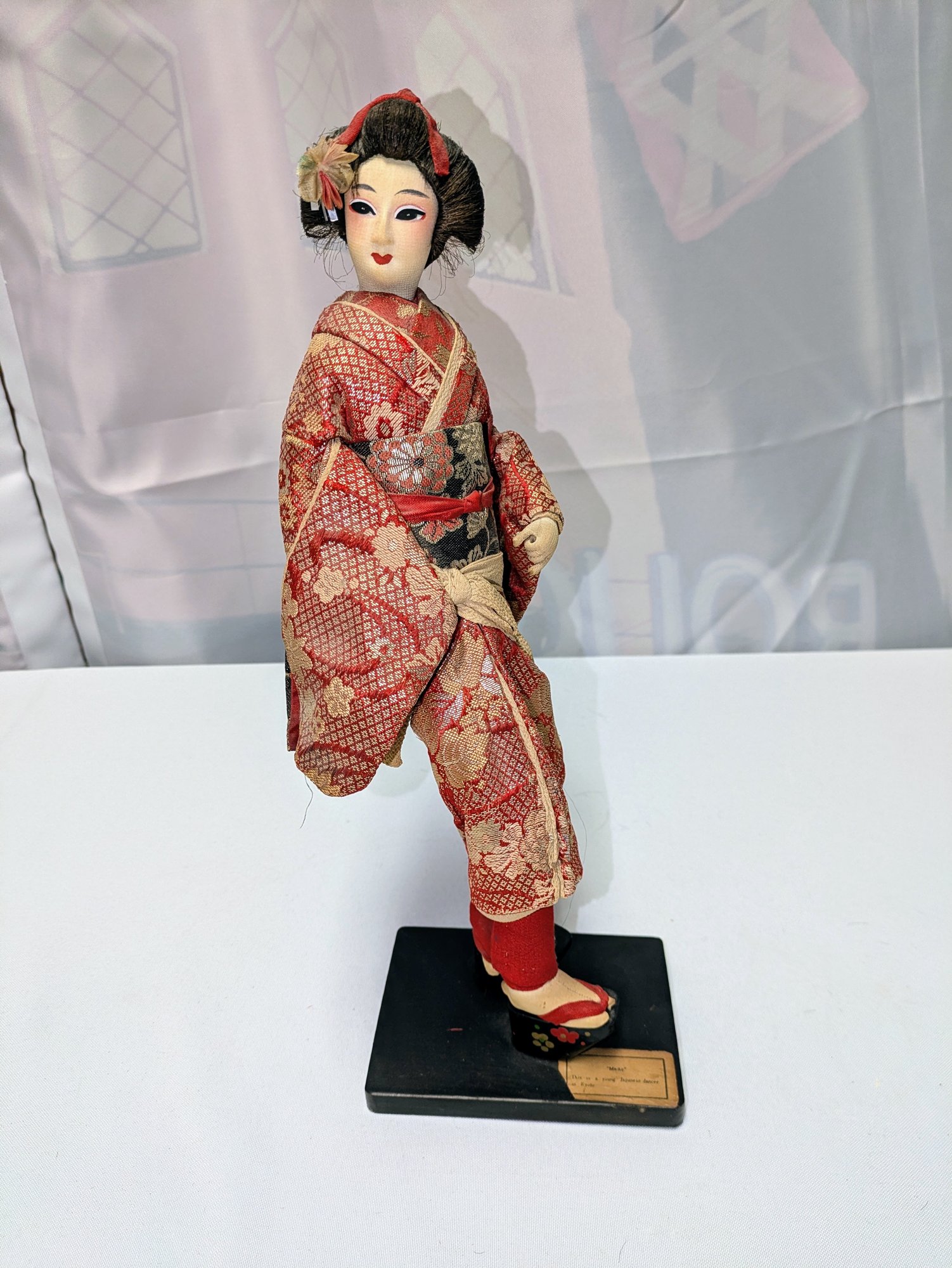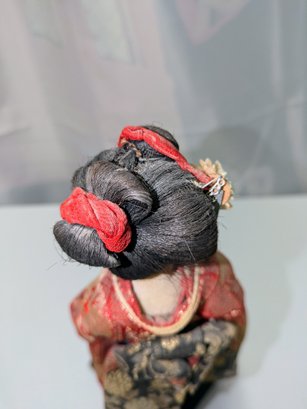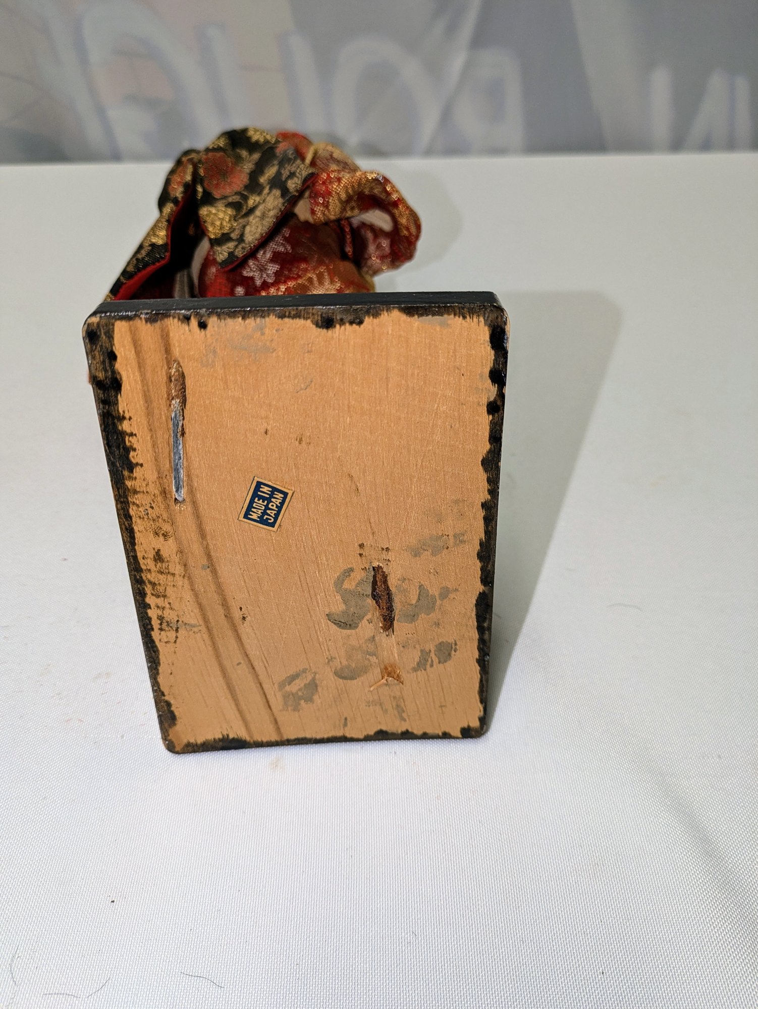 Stunning Detailing and Design. Made of Fabric, Featuring Beautiful traditional attire. Needs some dusting off. Some light marks consistent with age and use. Overall, Very Good Vintage Condition. Please see all photos as part of the description and condition. 14"H x 3.5" x 5" Base