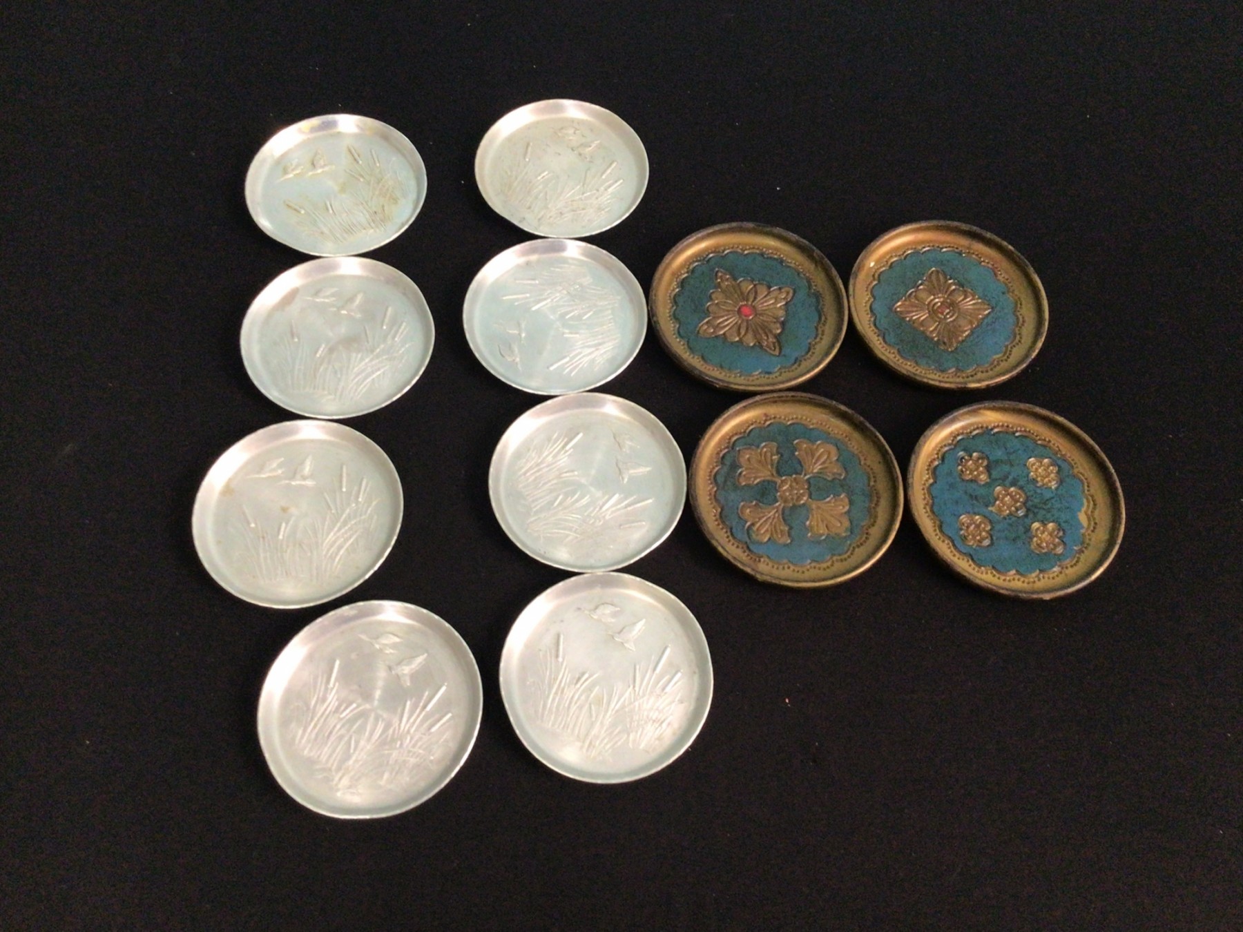 4 Florentine style coasters and eight aluminum duck themed coasters