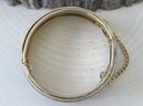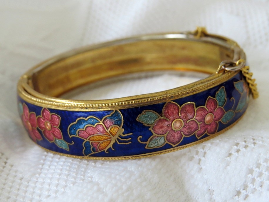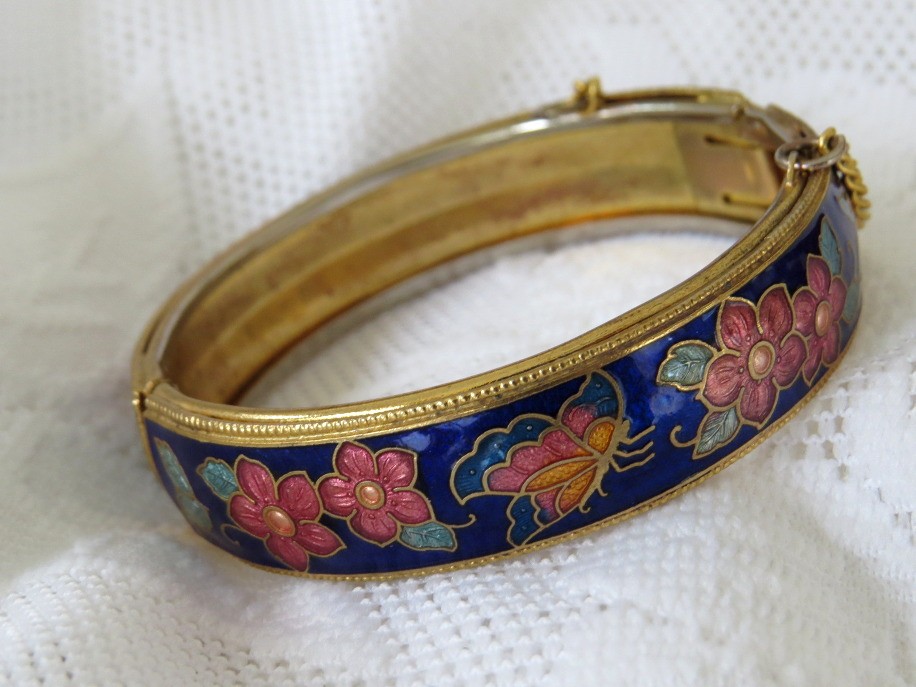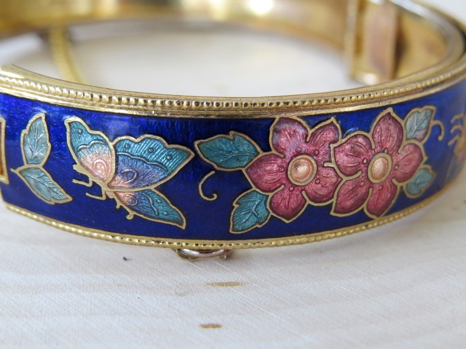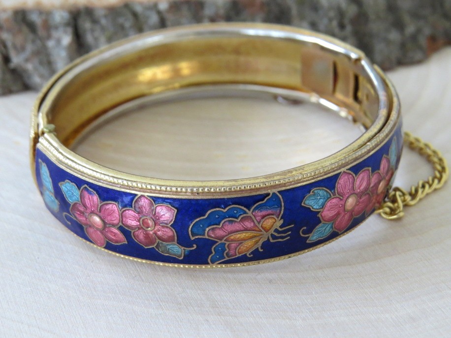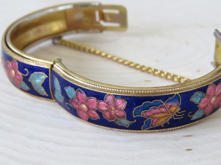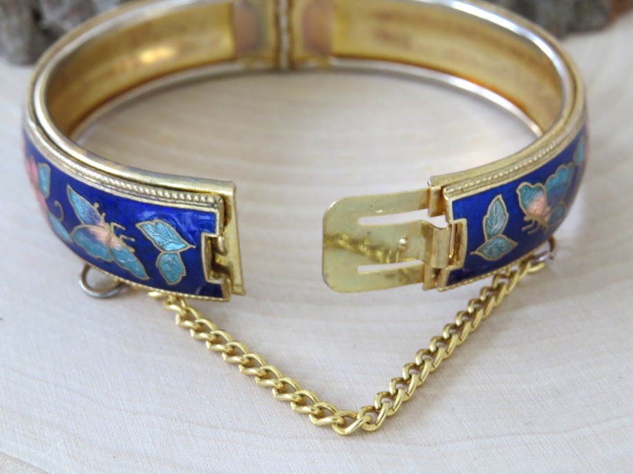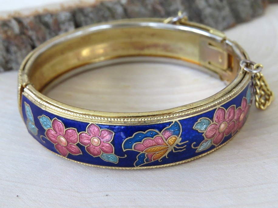 Beautiful vintage cobalt blue cloisonne floral and butterfly design hinged bangle bracelet. Bracelet has a safety chain and working clasp. Bracelet has 2 1/4" interior diameter and a height of slightly over 1/2". Top and bottom edges have a beaded design.