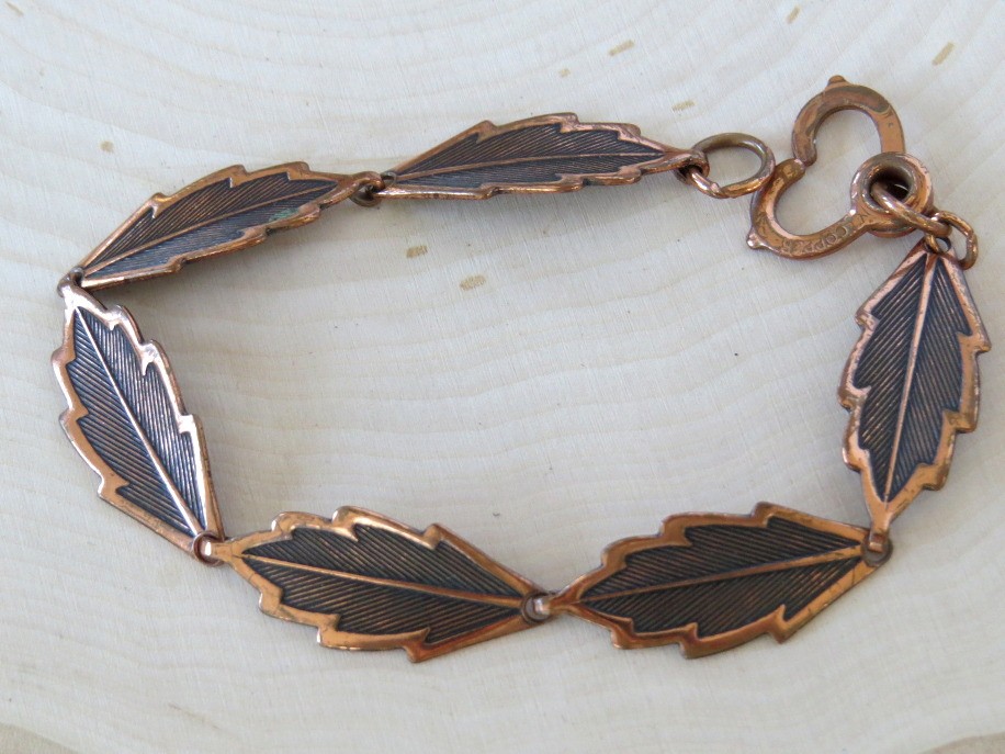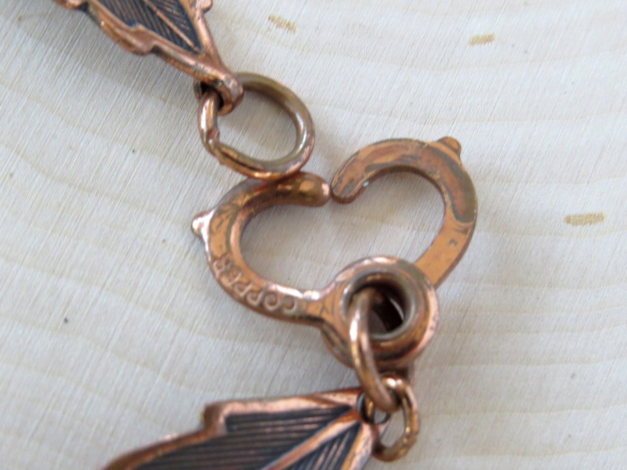 Nature inspired vintage copper leaf link bracelet. Measures 7 1/2" in length with each textured leaf being approximately 1" long. Bracelet is marked copper and has a unique heart design clasp which pinches closed.