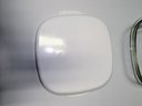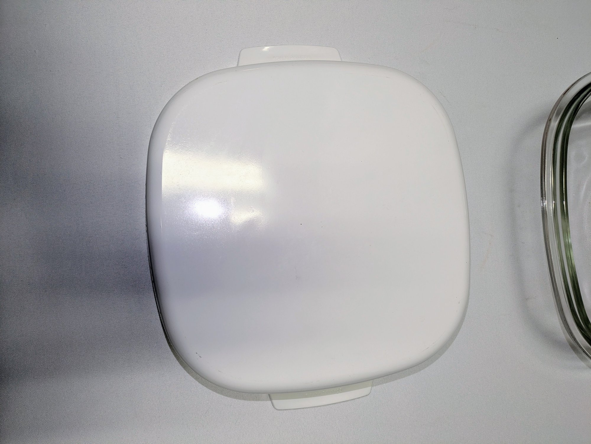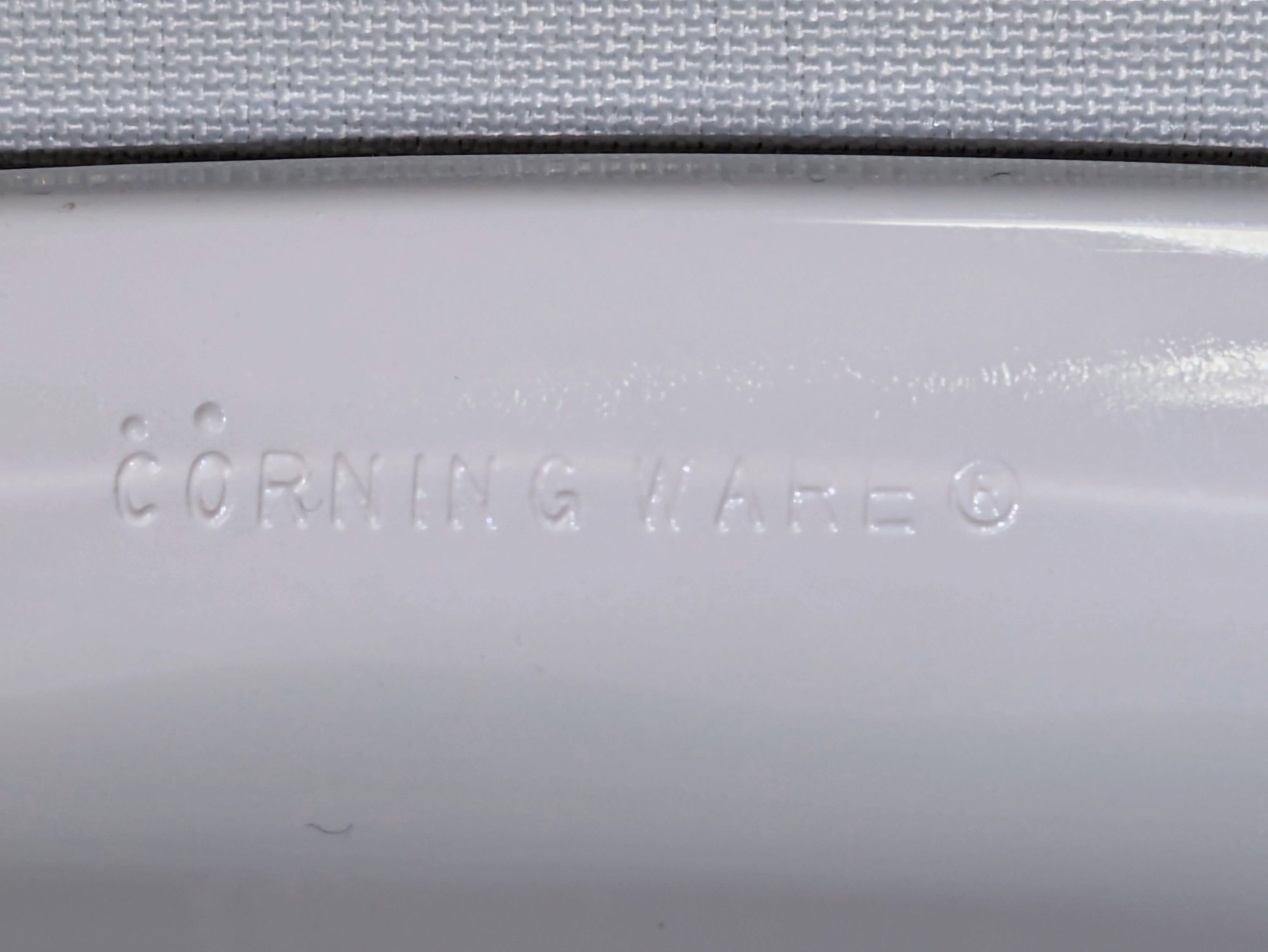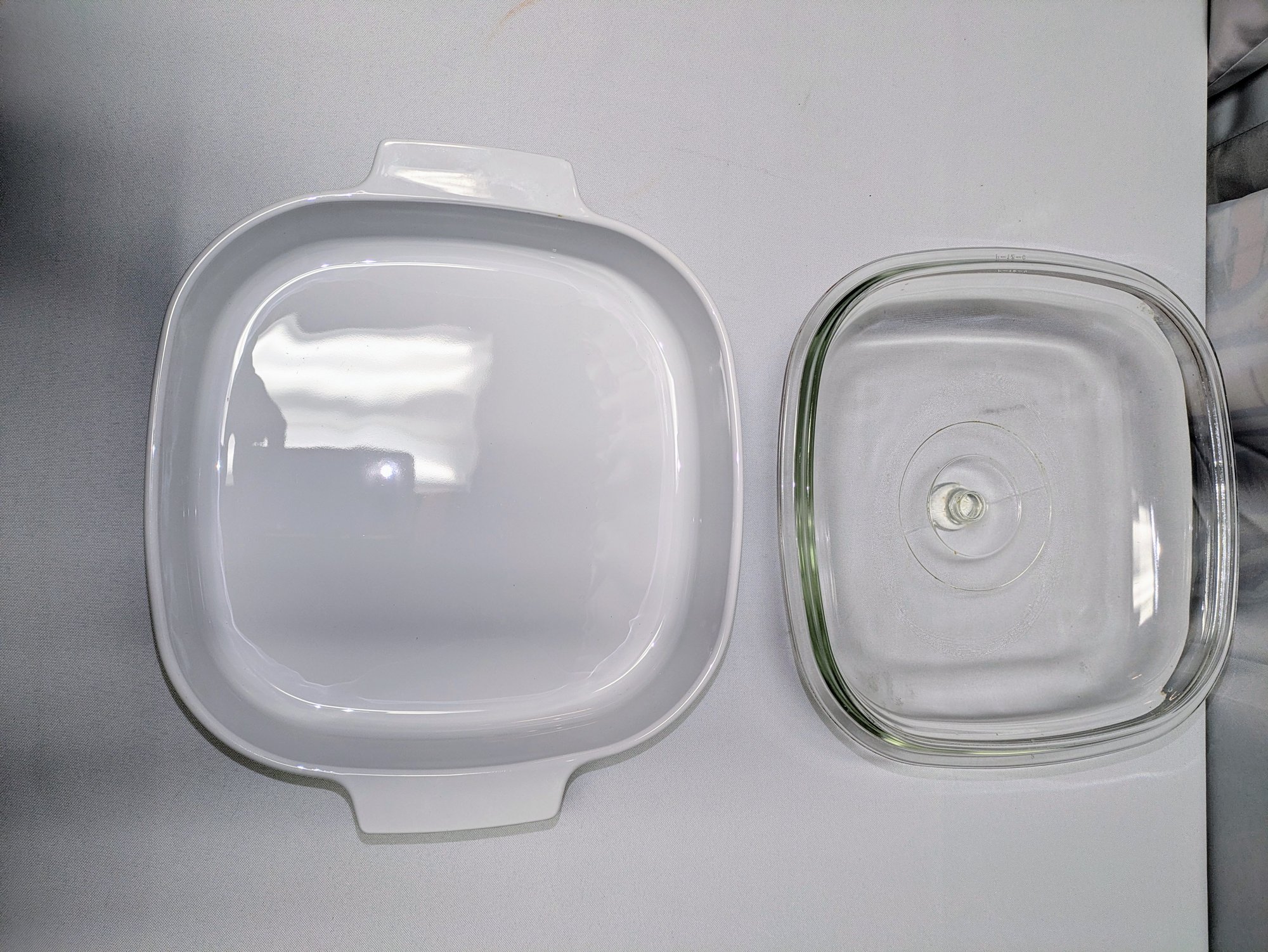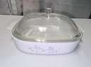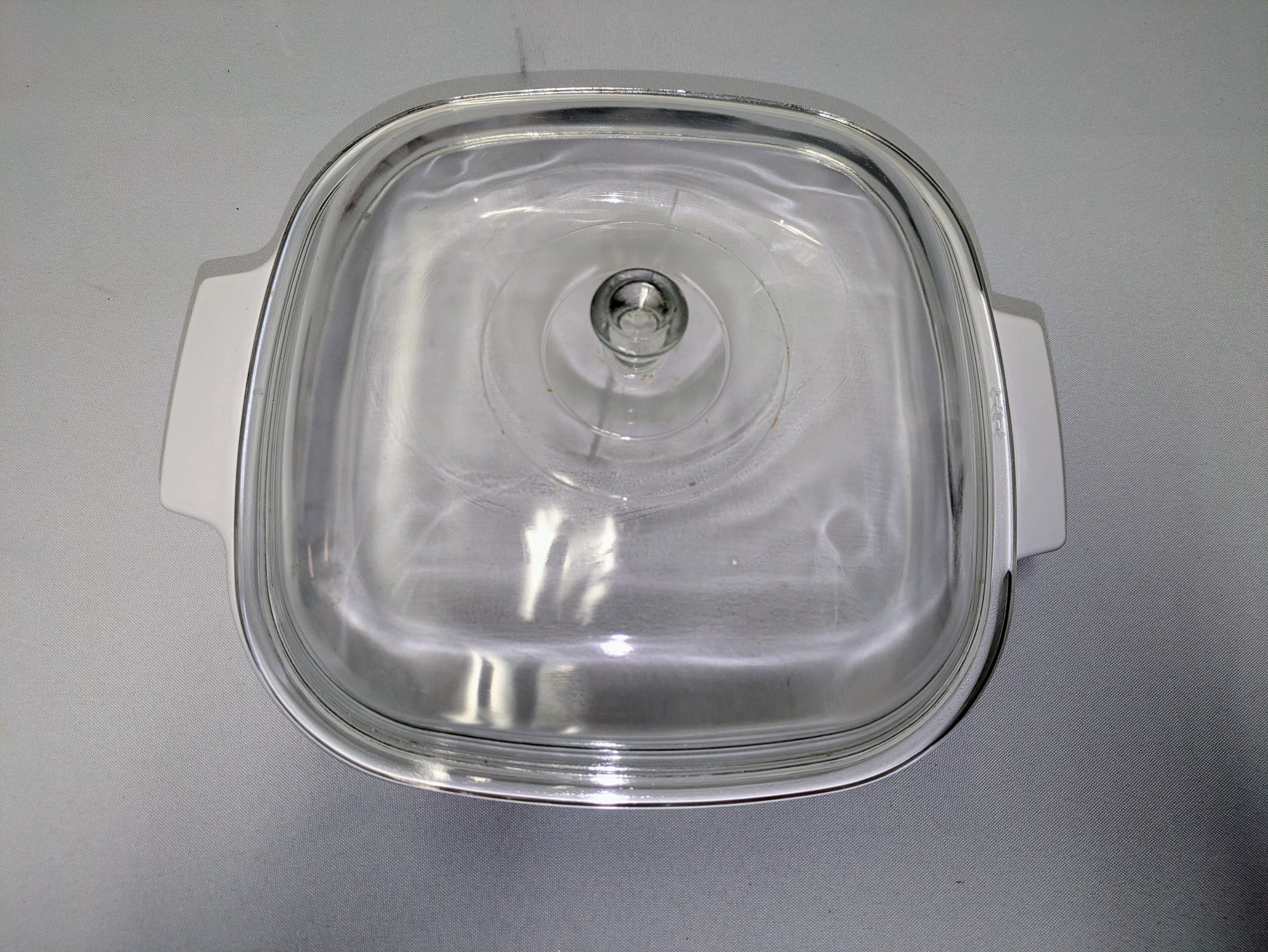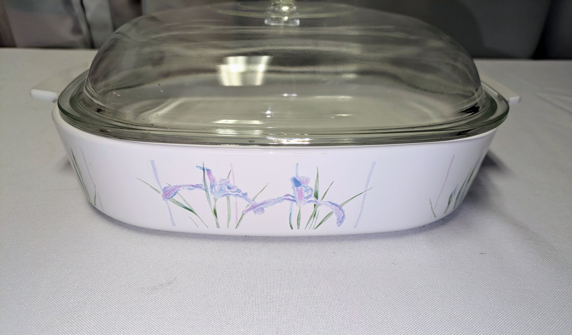 Beautiful design and pattern. Some light marks, consistent with age and use. No chips or cracks in the pan or glass lid. Overall, Very Good Vintage Condition. Please see all photos as part of the description and condition. 5.5"H (with lid) 2.25"H (without lid) x 10.25" x 12" (handle to handle)