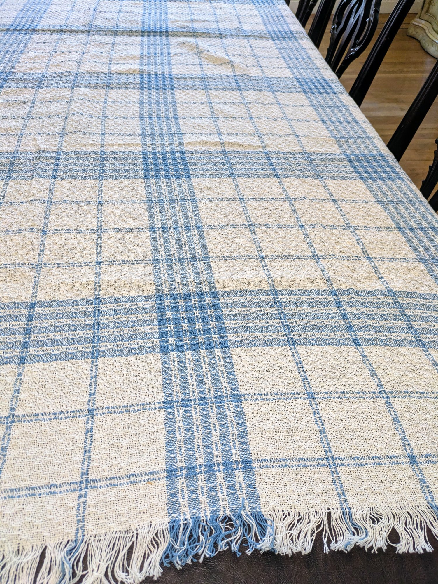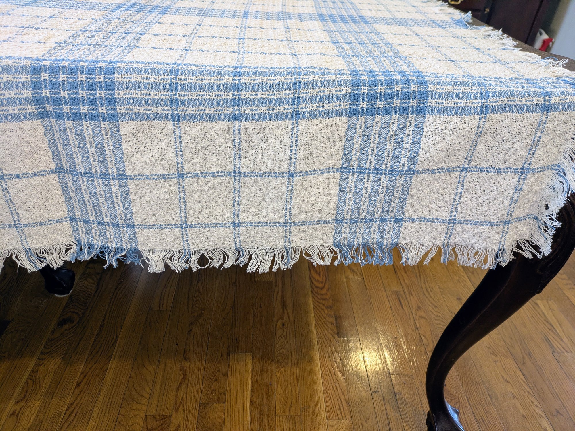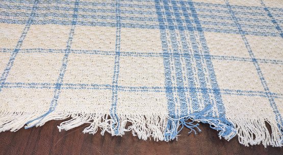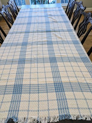 Vintage Cotton/Linen Frayed Edged Blue & White Stripe Rectangular Tablecloth. Excellent Vintage Condition. Please see all photos as part of the description and condition. 99" x 61"