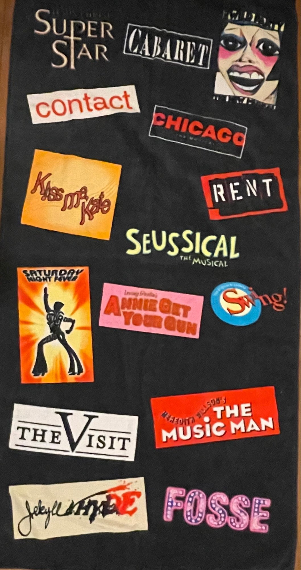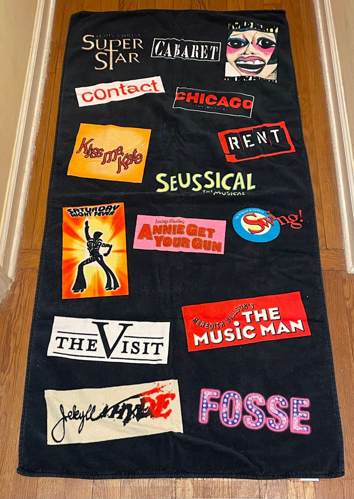 Great fun towel for the theater goer. It's 26 1/2" long and in good condition.