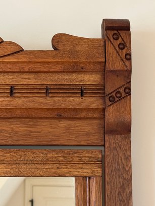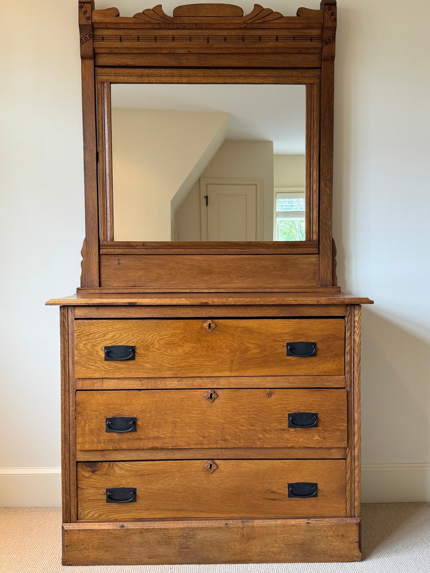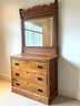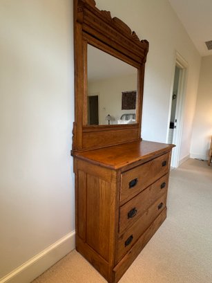Sweet vintage oak dresser with three storage drawers and pull out top vanity mirror. In two parts for easy moving.