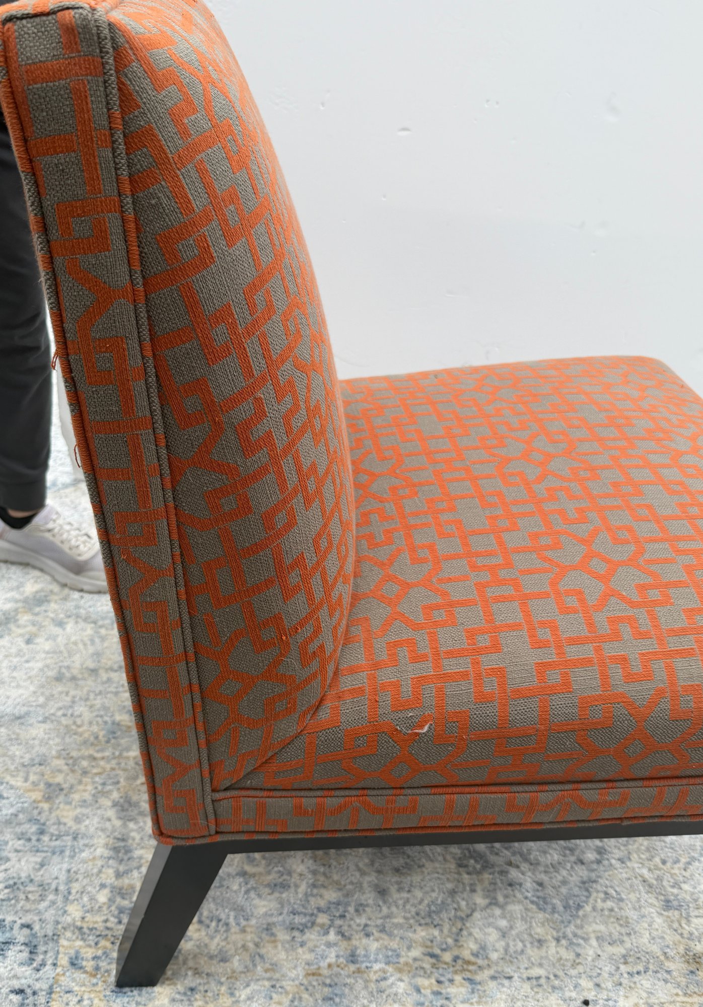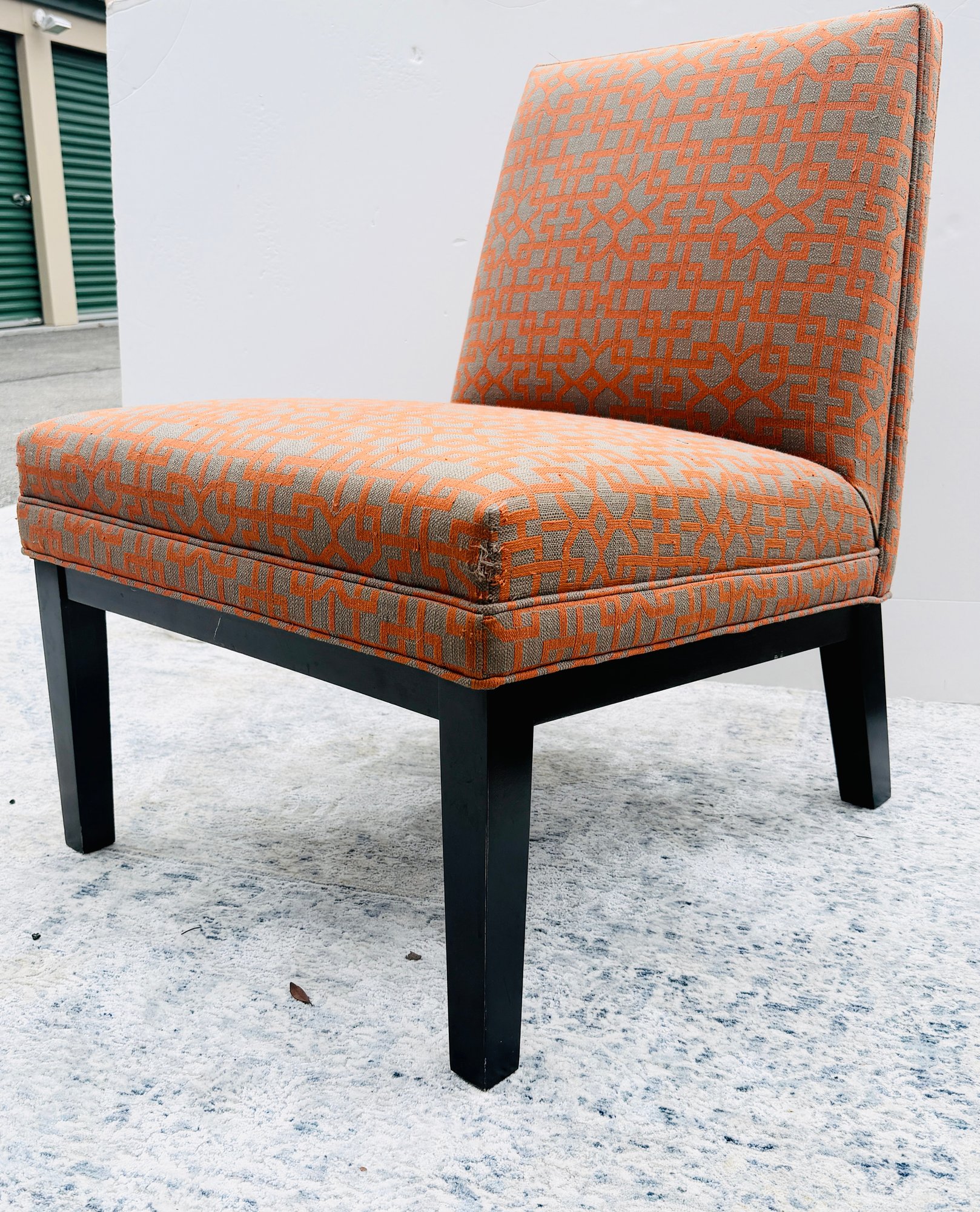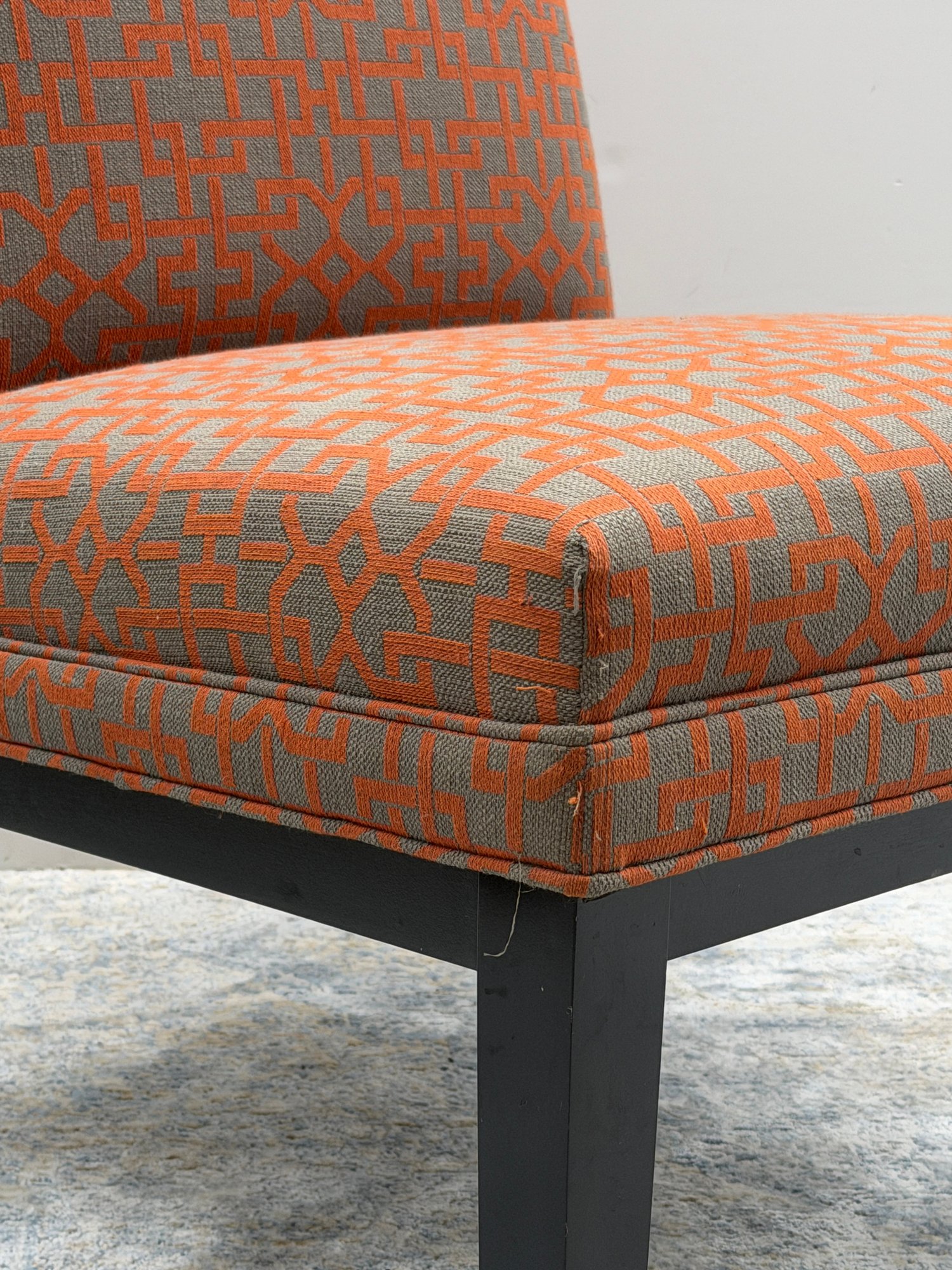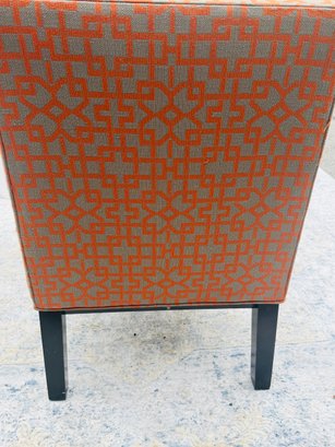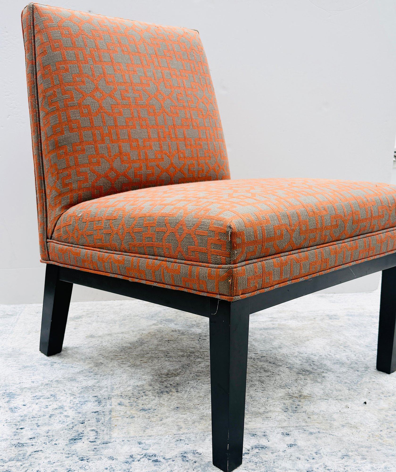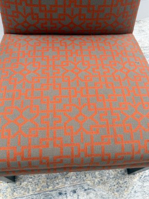 Crate & Barrel Slipper chair in gray and orange geometric print with sinuous spring cushions and hardwood legs finished in an dark ebony stain.