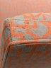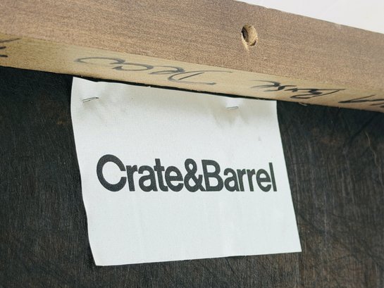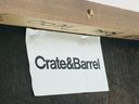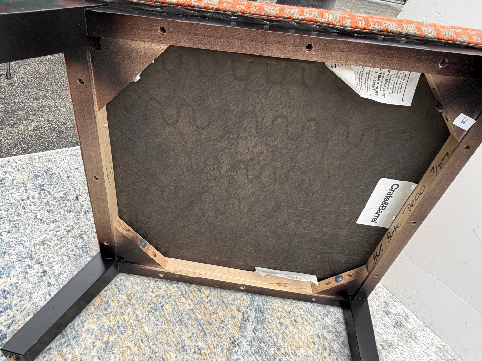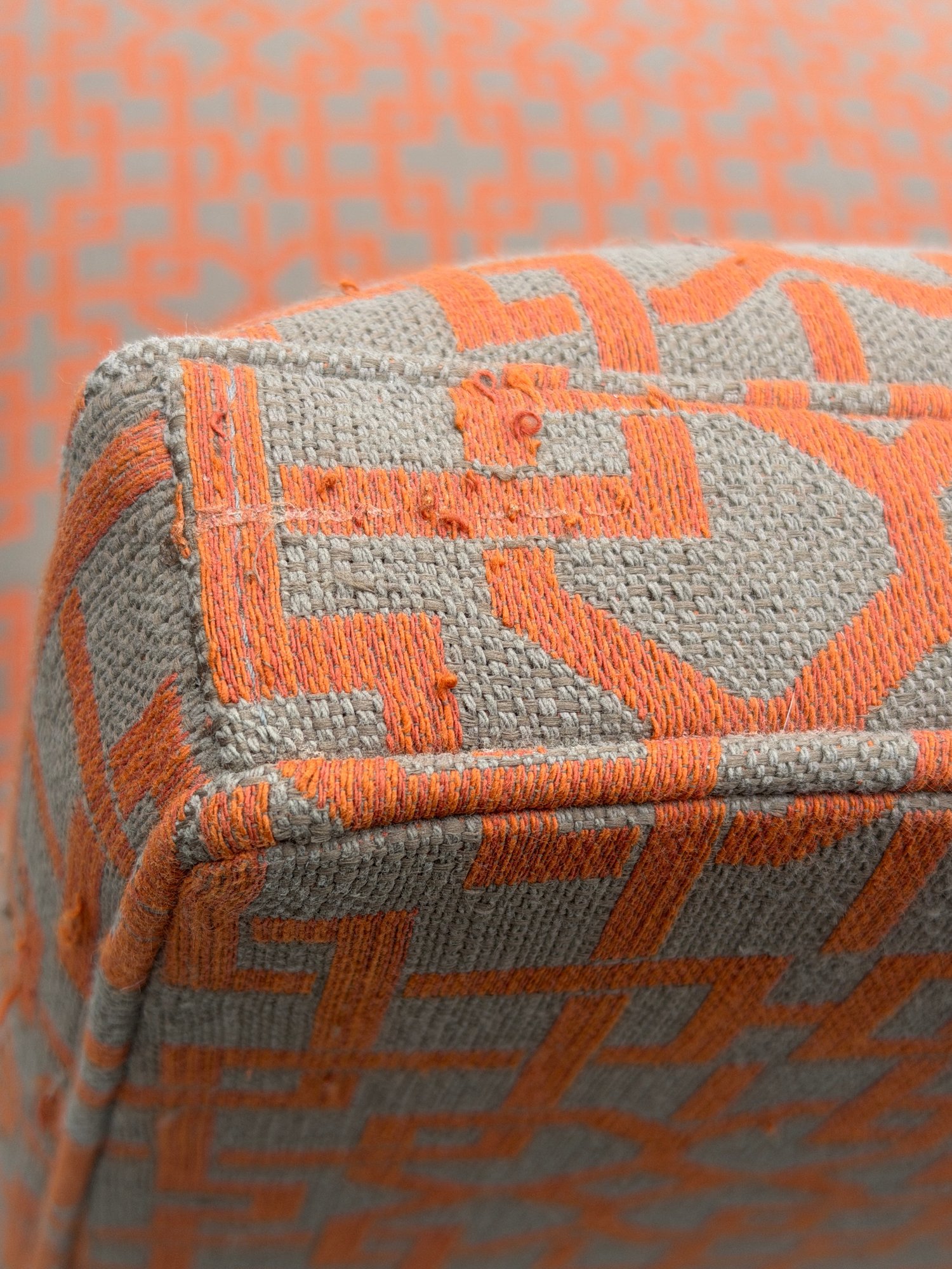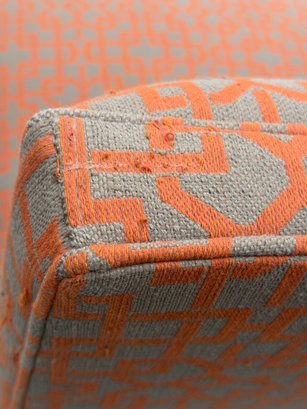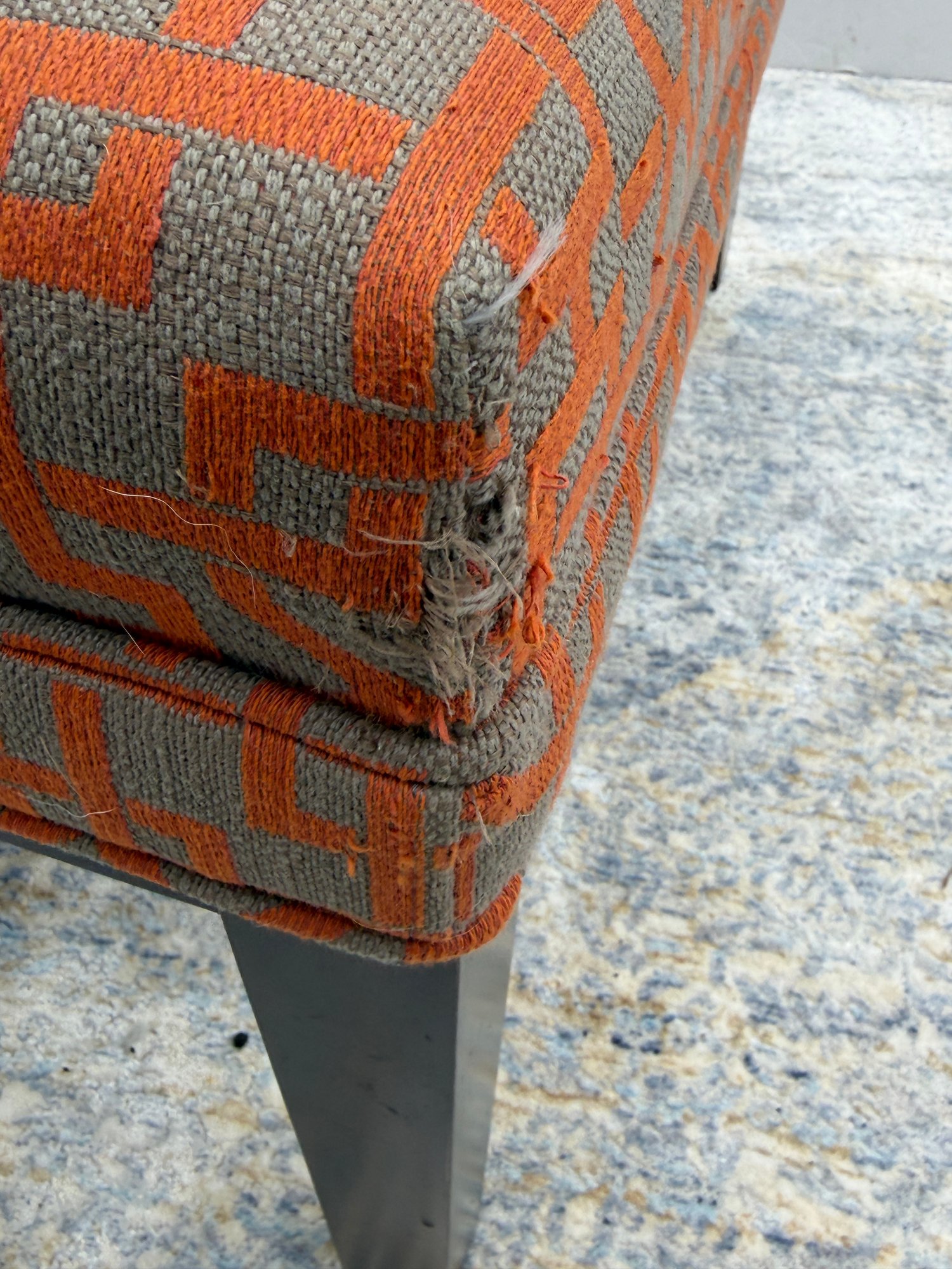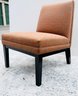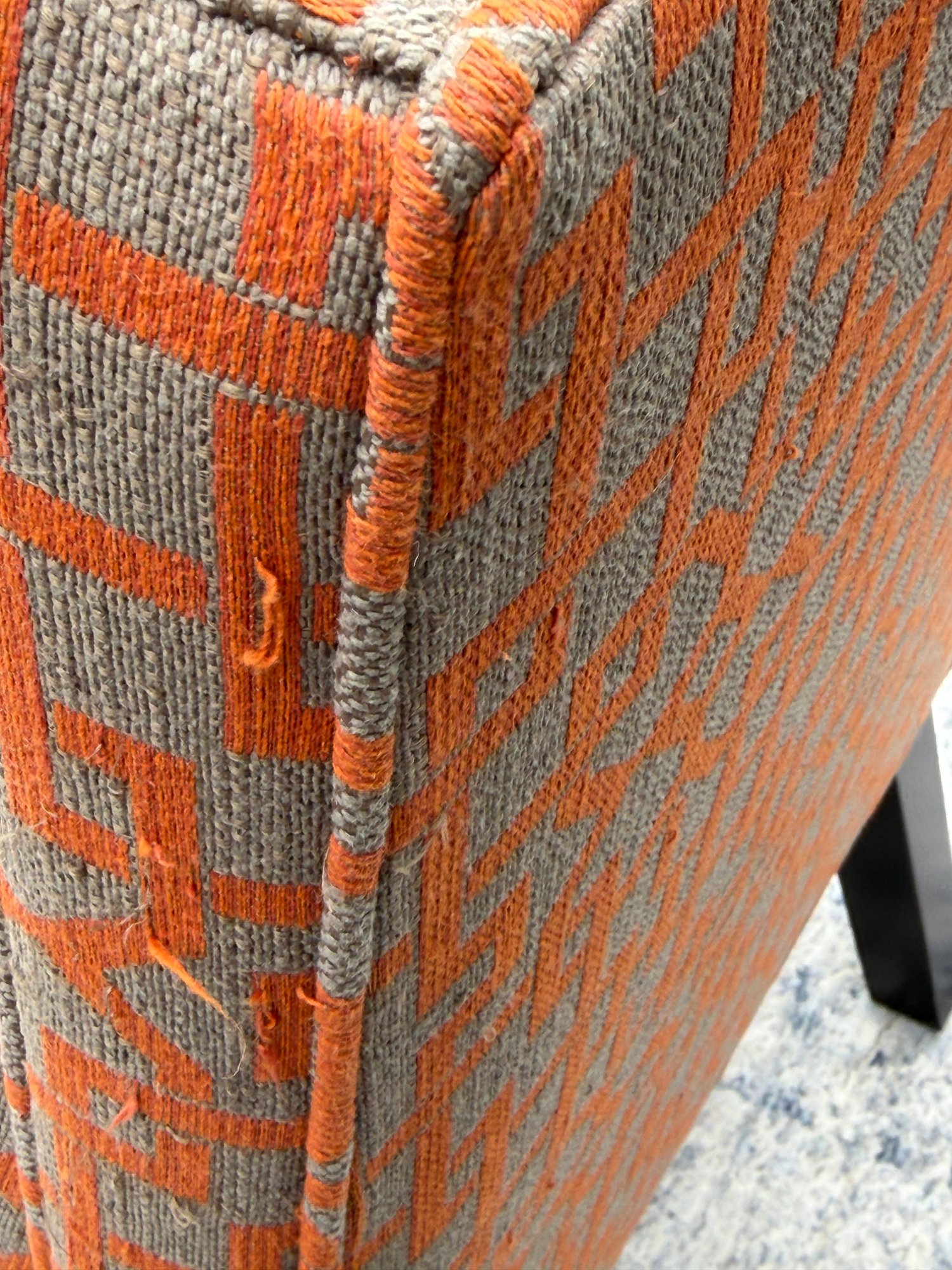 Crate & Barrel Slipper chair in gray and orange geometric print with sinuous spring cushions and hardwood legs finished in an dark ebony stain.