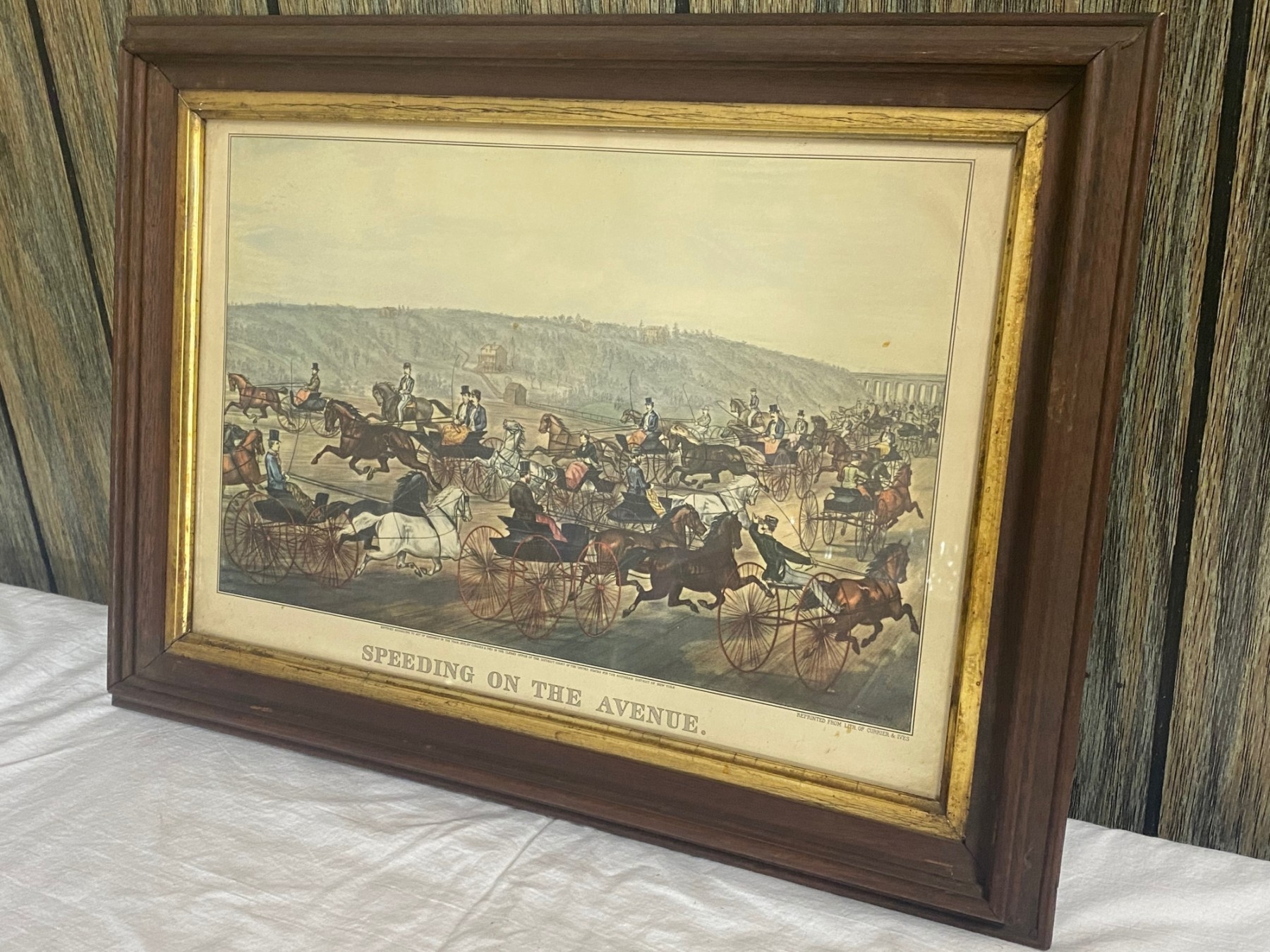 Good condition for age, minor scratches on frame, minor fading on print.