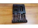 10 piece cutco knife set. 9 knives all with good sharp edges. 2 knives do have damage to the blades, one has knicks the other a broken tip. Lot includes a storage block and a cutco sharpener.