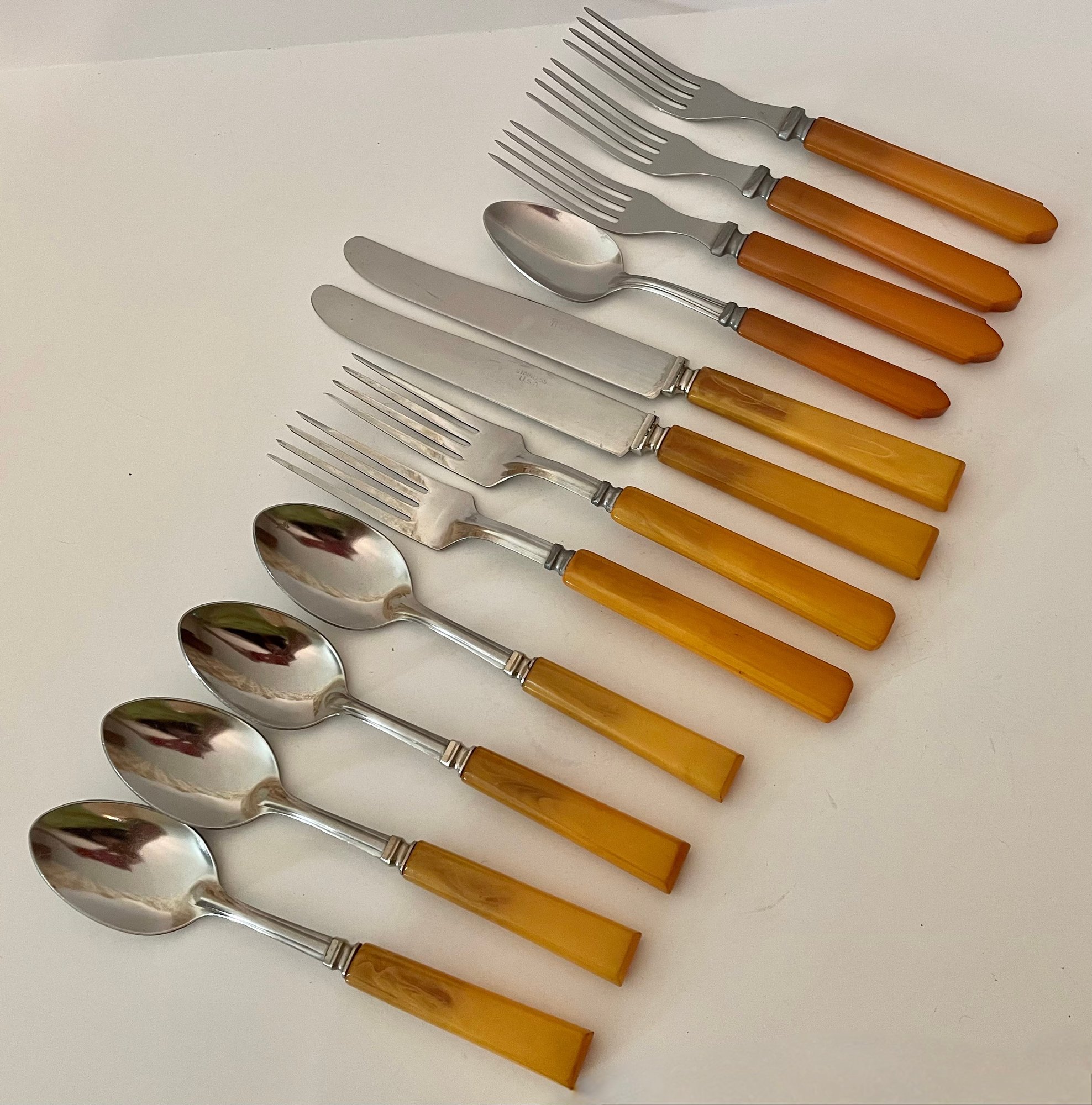 A really nice group of 12 butterscotch bakelite handled pieces of cutlery. They are from 2 different patterns. They were made in the 1930's to 1950's. Some say R.K. Co on the back. They are in very good condition. The knives are around 9" long.