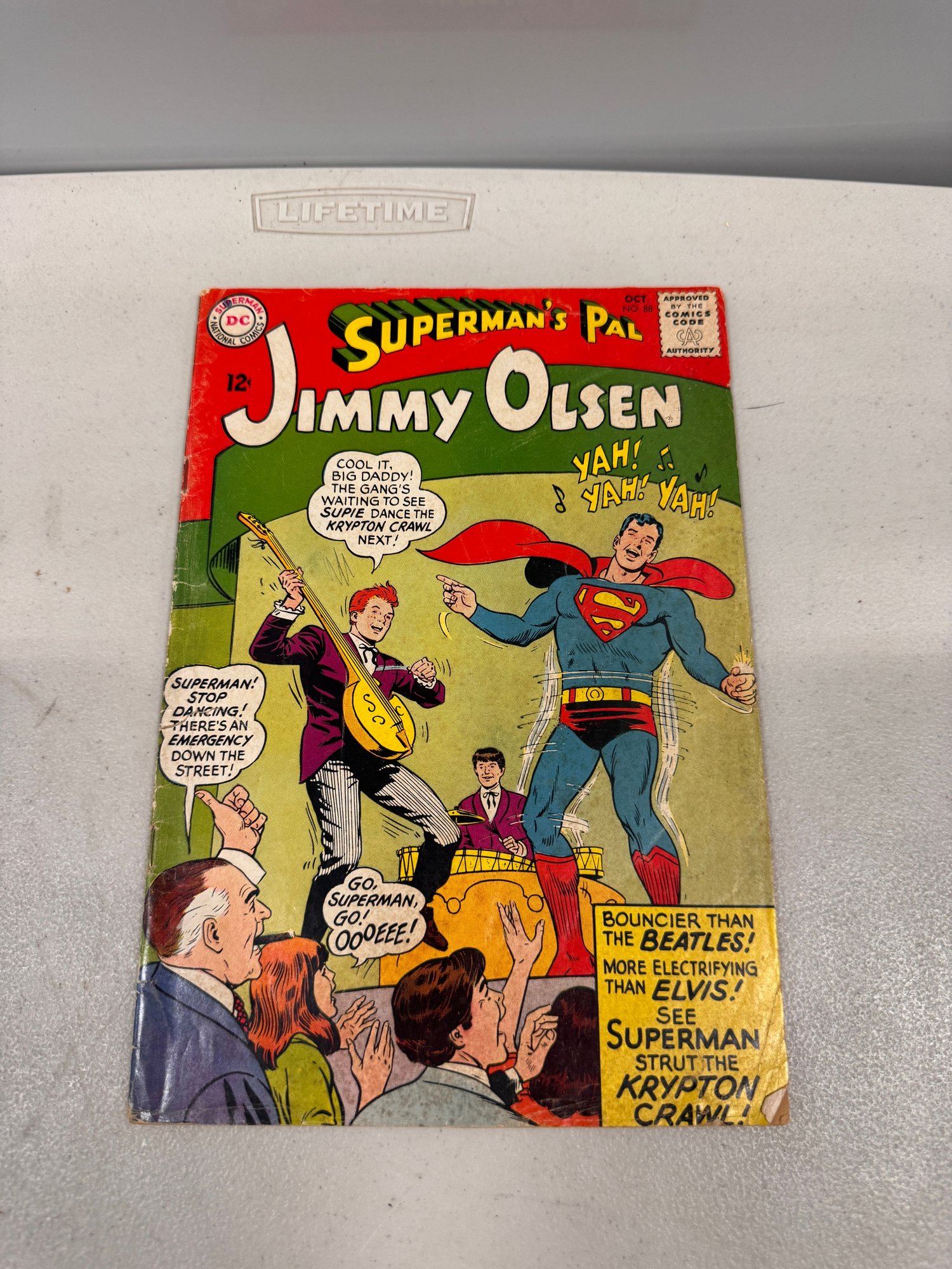Vintage DC comic Superman’s Pal Jimmy Olsen #88 (1965). Classic Silver Age issue featuring period ads and artwork. Shows age-related wear including edge wear, creasing, and discoloration. Complete but condition is consistent with a well-read copy. Sold as found; please review photos carefully.