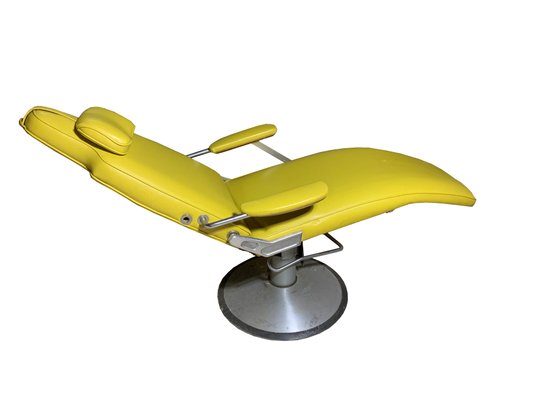 This is a fabulous vintage dentist chair, adjustable height with working hydraulic foot pump to raise and lower, attached pillow and armrests. Needs one bolt to secure the arm rest support. Such a cool and unique item with an MCM vibe. Appears to be in overall good condition - has one small tear and needs a good cleaning from long term basement storage. This will be an amazing accent/conversation piece!