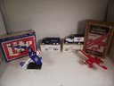 VINTAGE DIECAST TRUCKS AND PLANE COIN BANKS IN BOX. PLEASE SEE PHOTOS FOR CONDITION AND VARIETY.