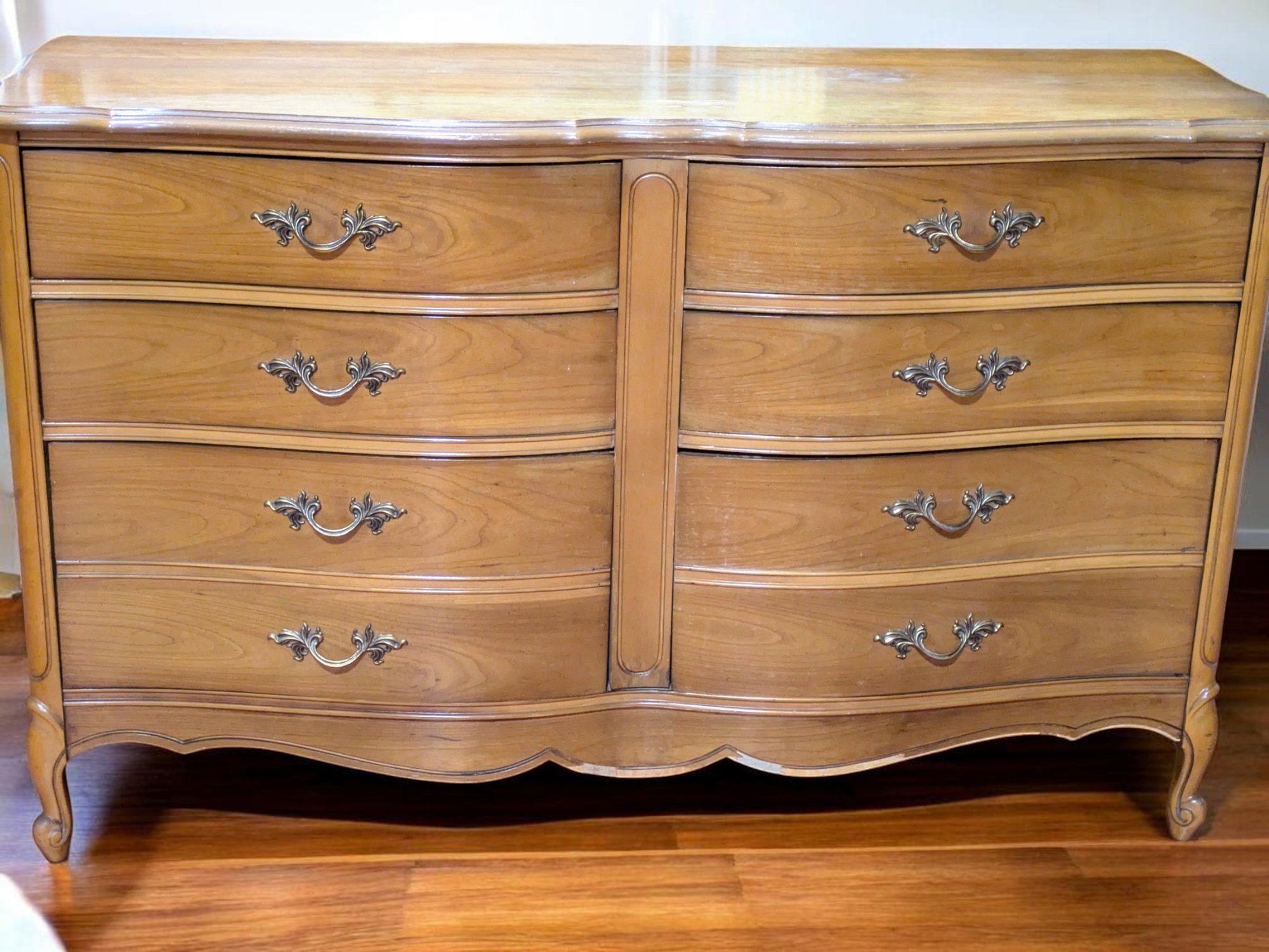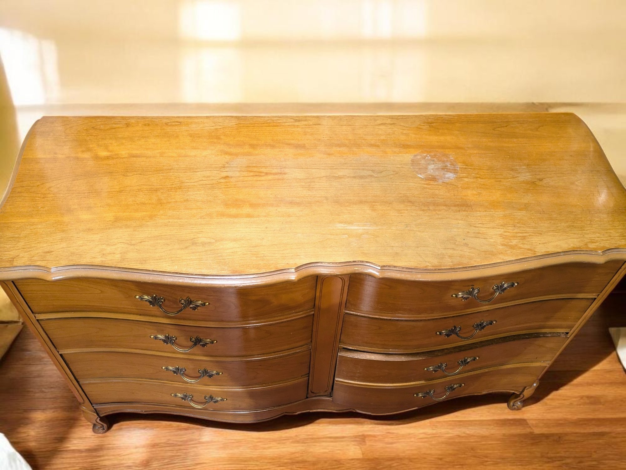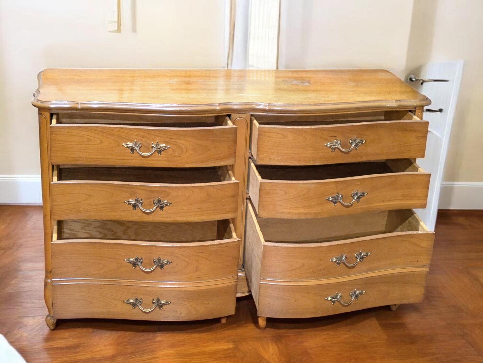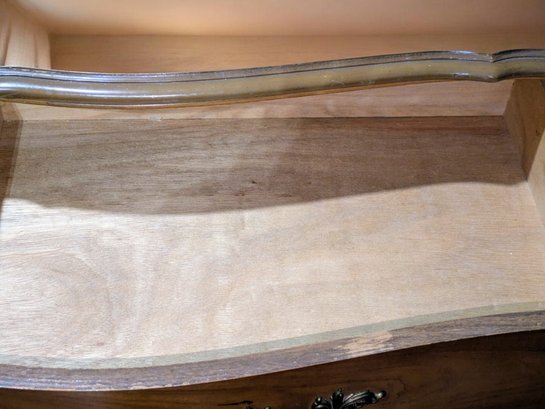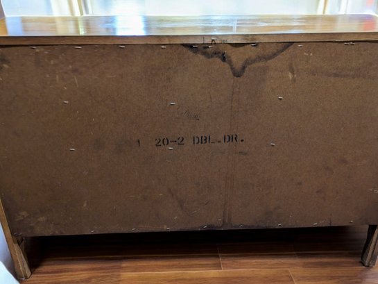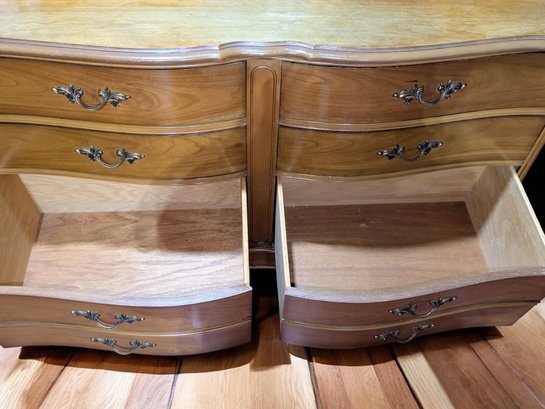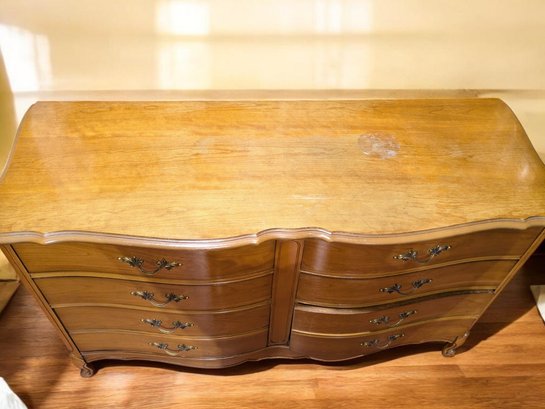 Vintage Dixie Furniture, French Provincial Style 6 Drawer Double Dresser. Beautiful Solid Wood Dresser, Appears to be made of Walnut. Features 6 Spacious Drawers with the Original Brass Drawer Pulls. The top shows signs of wear, and there is some missing veneer at the bottom as well as other marks, including on the back, all consistent with age and use, most fillable with stain renew. Overall, Very Good Vintage Condition. Please see all photos as part of the description and condition. 52"W x 32" H x 19"D