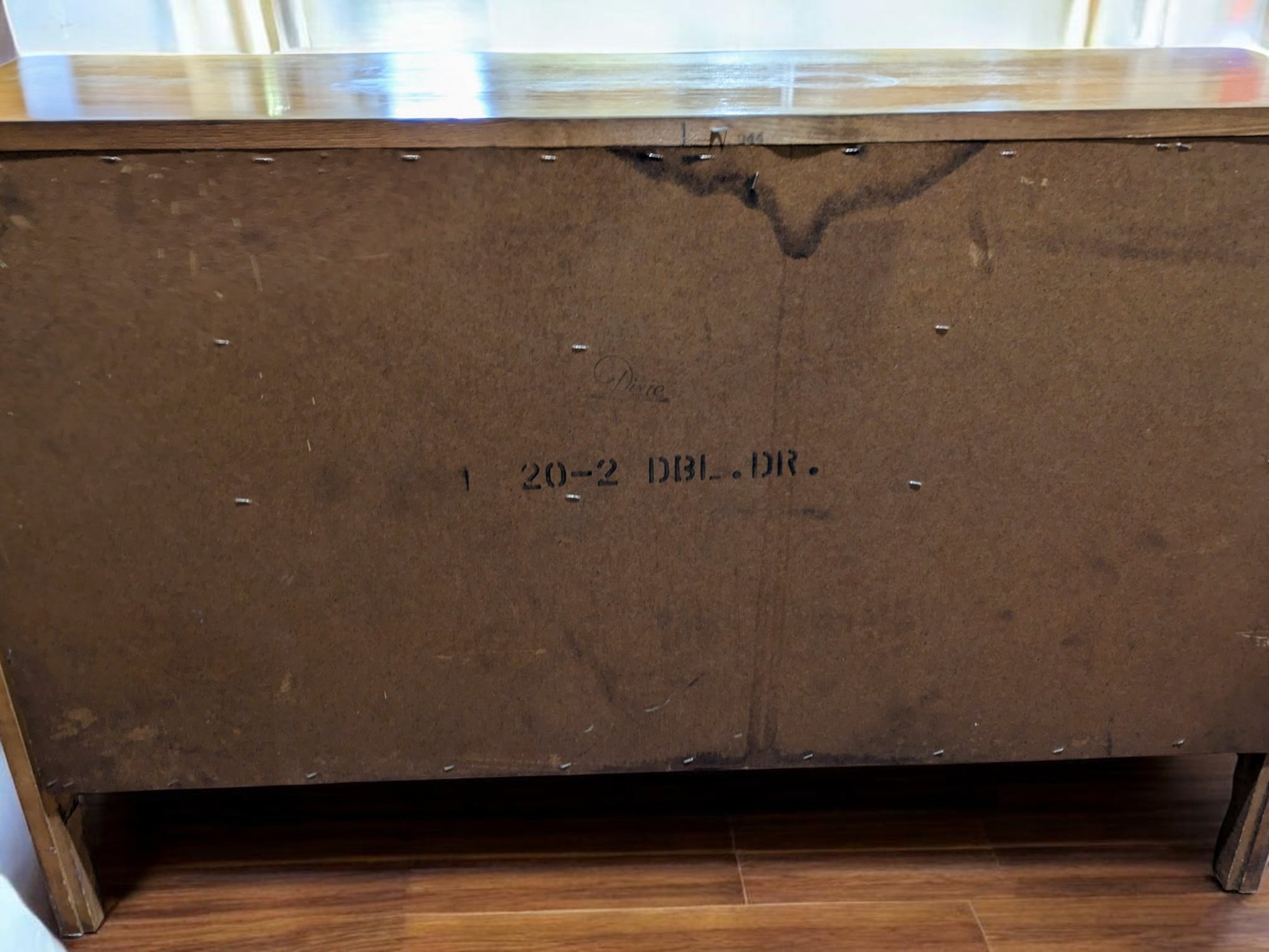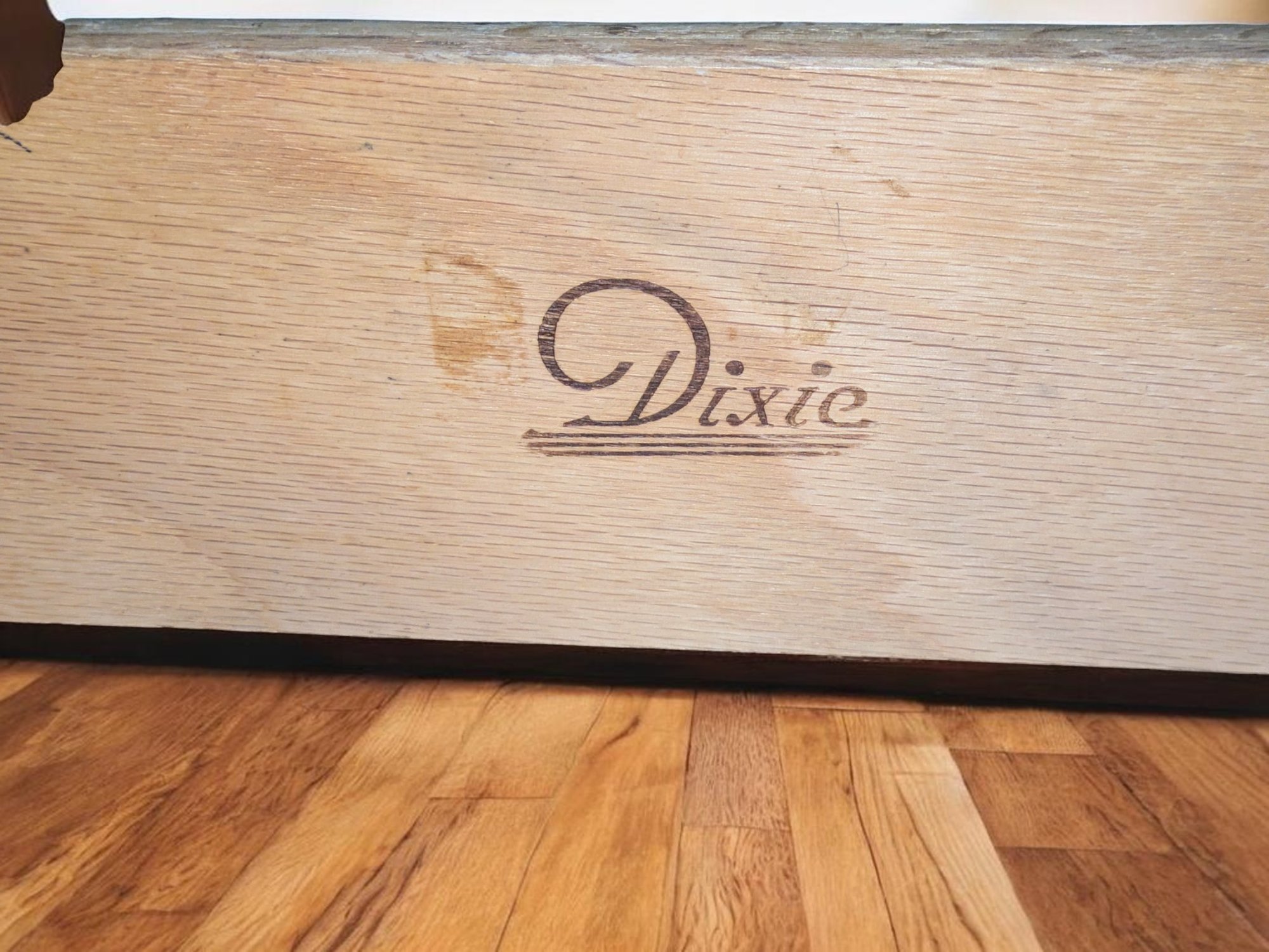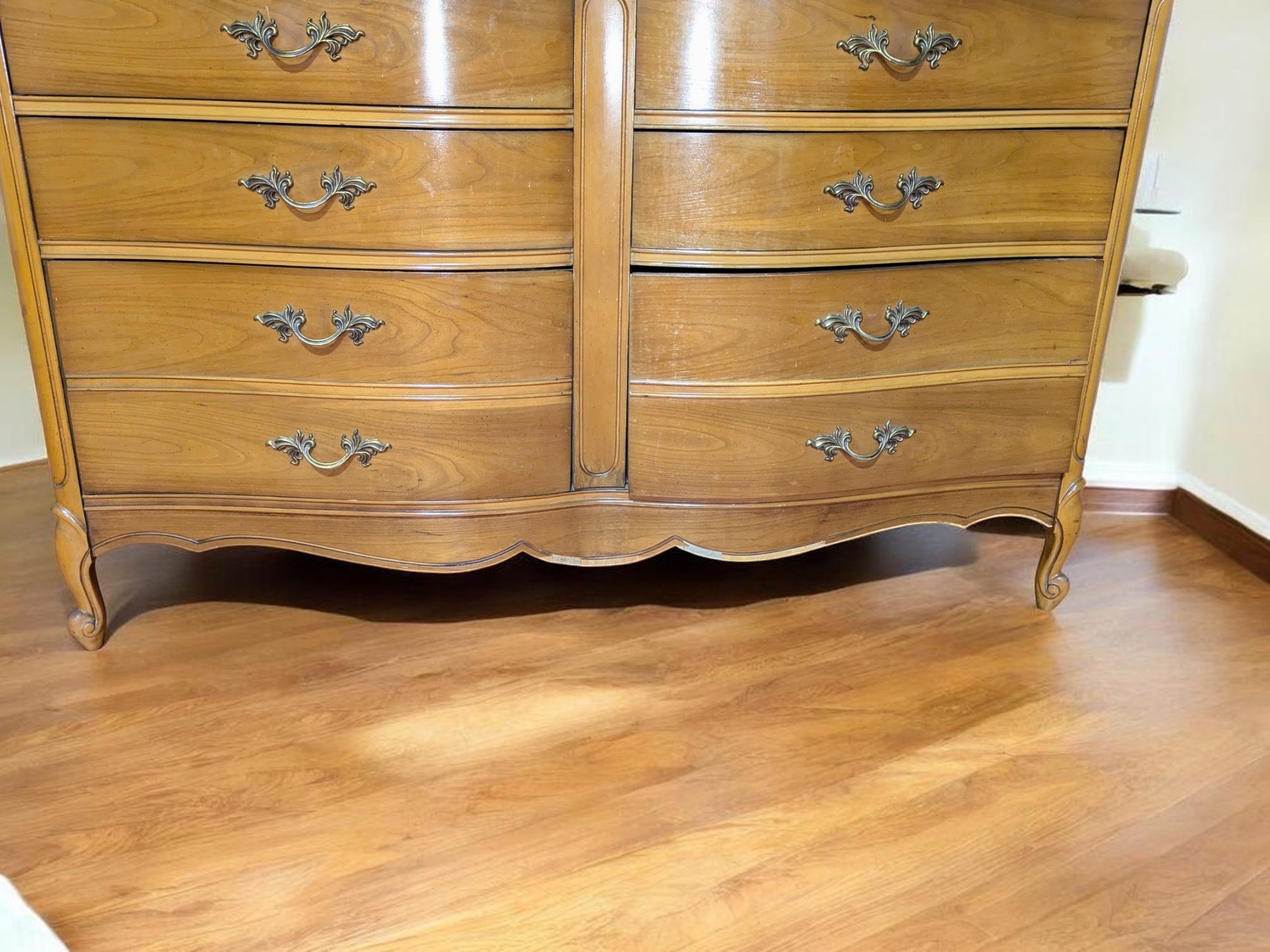 Vintage Dixie Furniture, French Provincial Style 6 Drawer Double Dresser. Beautiful Solid Wood Dresser, Appears to be made of Walnut. Features 6 Spacious Drawers with the Original Brass Drawer Pulls. The top shows signs of wear, and there is some missing veneer at the bottom as well as other marks, including on the back, all consistent with age and use, most fillable with stain renew. Overall, Very Good Vintage Condition. Please see all photos as part of the description and condition. 52"W x 32" H x 19"D