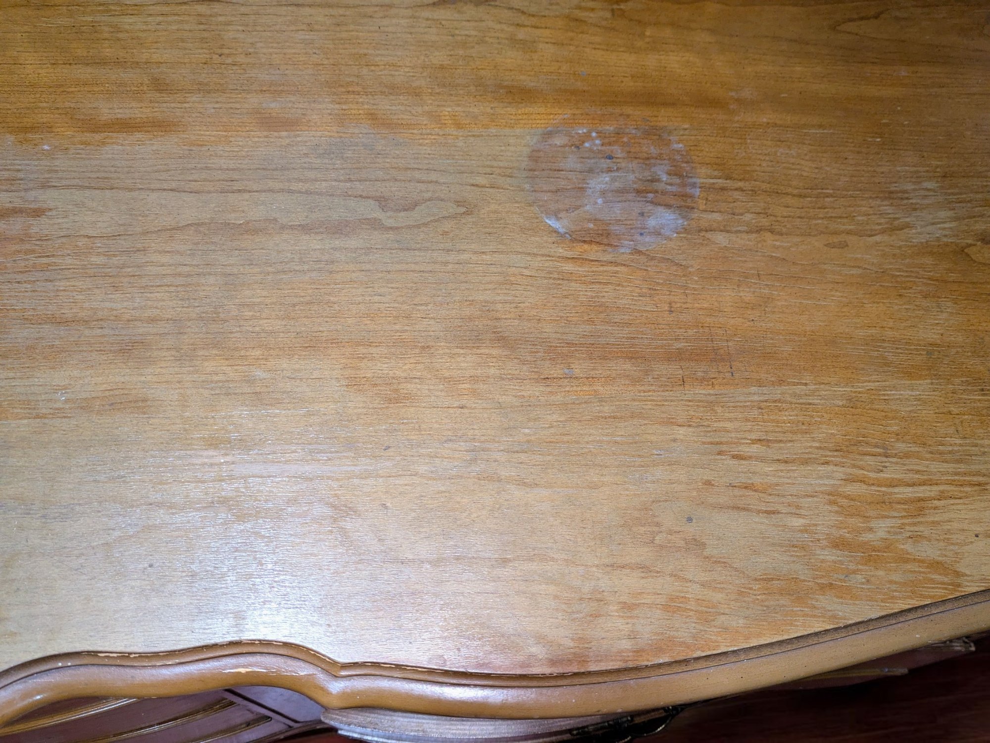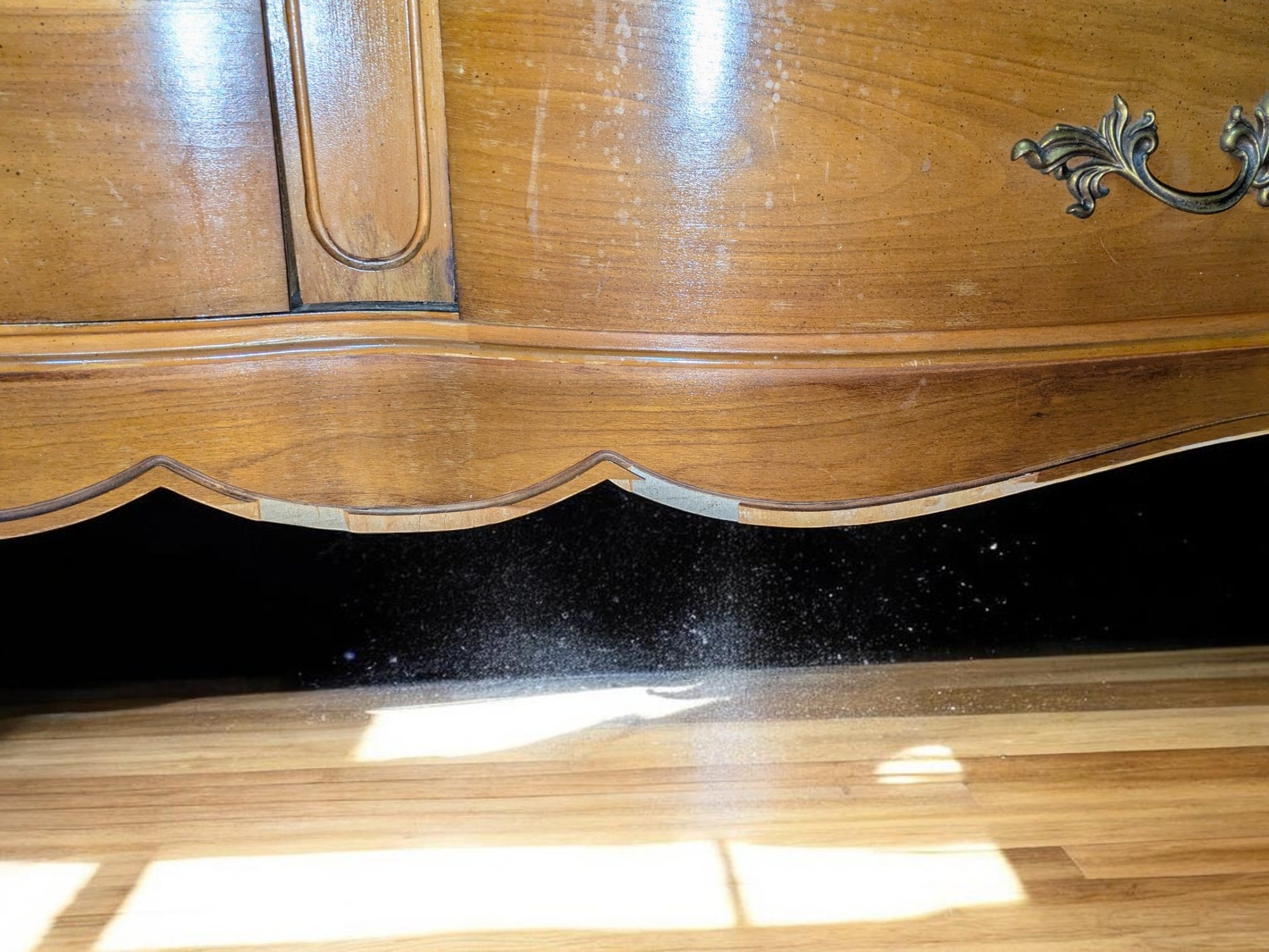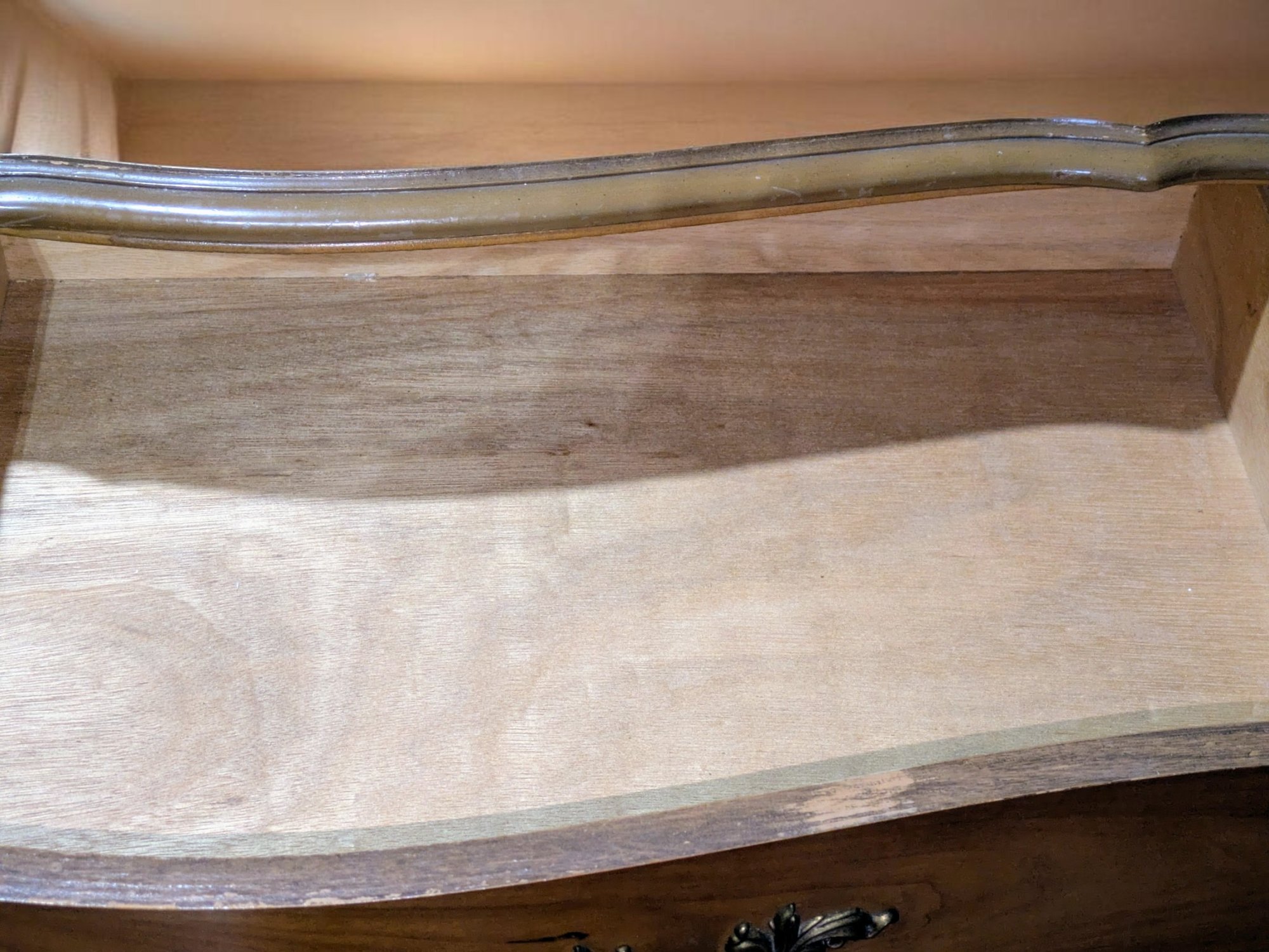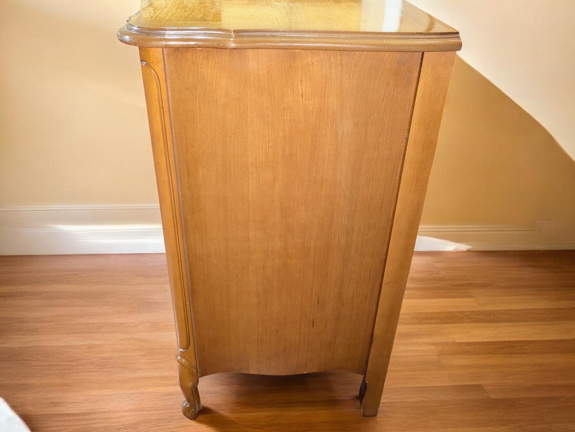 Vintage Dixie Furniture, French Provincial Style 6 Drawer Double Dresser. Beautiful Solid Wood Dresser, Appears to be made of Walnut. Features 6 Spacious Drawers with the Original Brass Drawer Pulls. The top shows signs of wear, and there is some missing veneer at the bottom as well as other marks, including on the back, all consistent with age and use, most fillable with stain renew. Overall, Very Good Vintage Condition. Please see all photos as part of the description and condition. 52"W x 32" H x 19"D