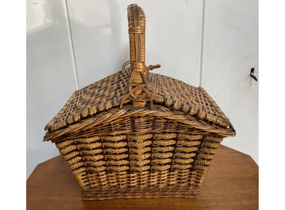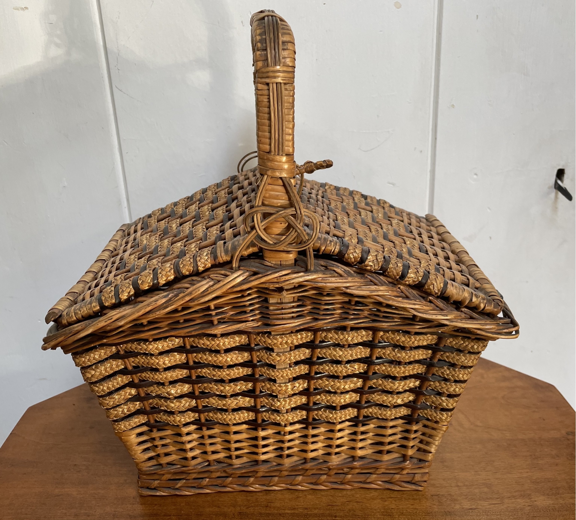 A spectacular basket with a very complicated and intricate design. The picnic basket is double lidded with metal spring hinges. This type of basket is sometimes referred to as a Piccadilly Basket. It has good age and the overall condition is good but there are a number of small imperfections - please study the photos. It measures 14" high by 12 1/2" long by
