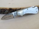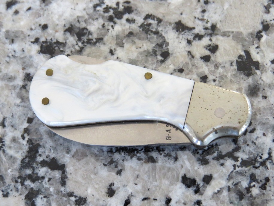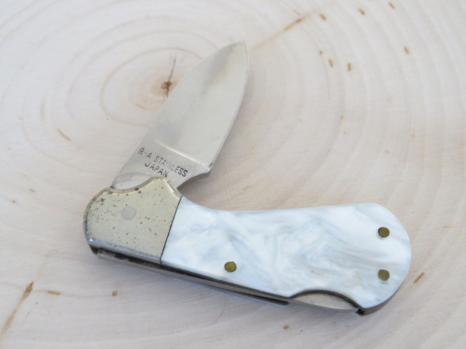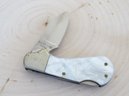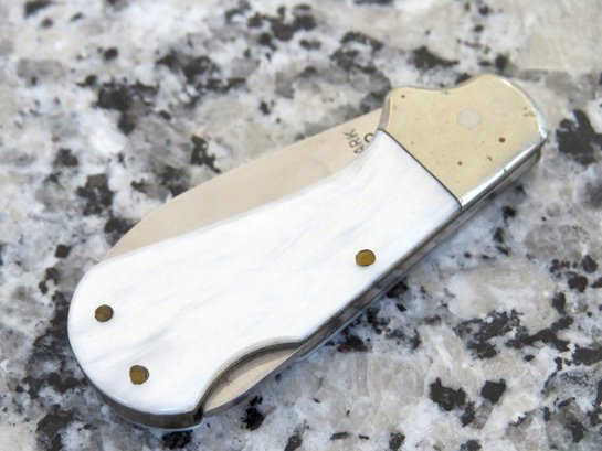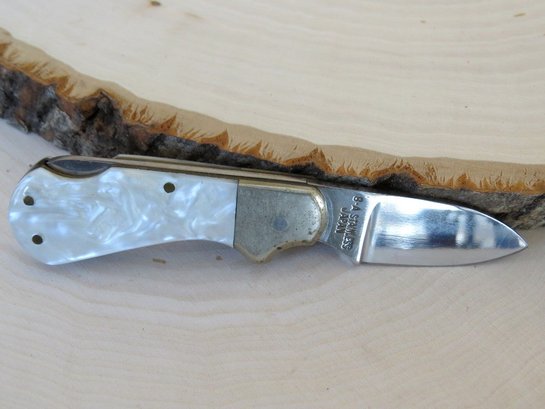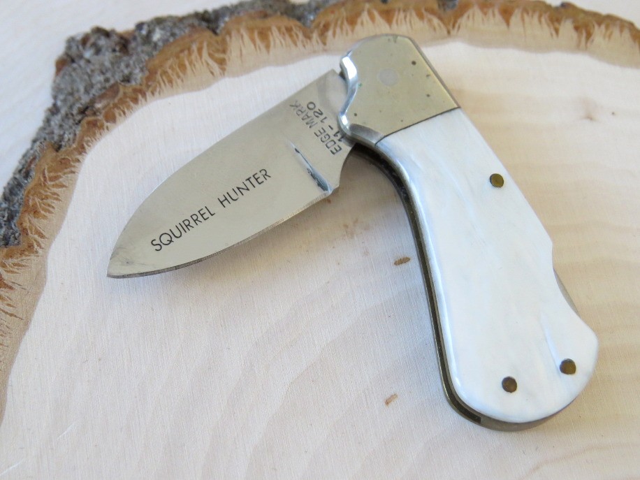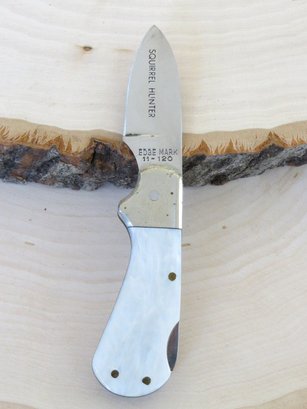 The Edge Mark 11-120 "Squirrel Hunter" is a vintage, high-quality folding pocket knife made in Seki, Japan, featuring a stainless steel blade, brass accents and Mother of Pearl style handle. Small, durable, and lightweight design measures 4" in length when open.