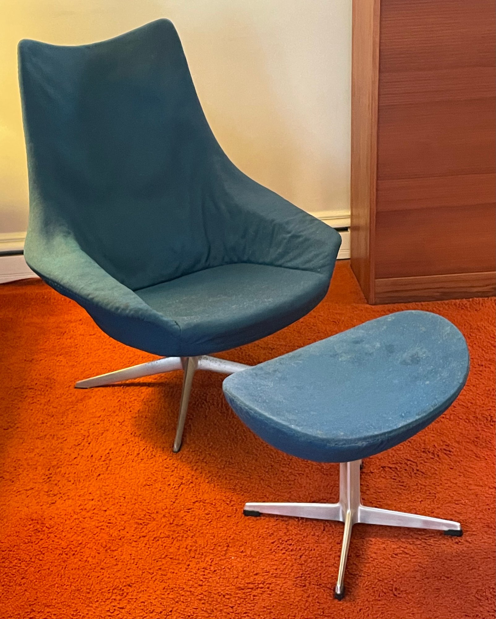 Here's a vintage version of the famous egg chair with ottoman. It's a wonderful fun design, and this one is a little different than most. The condition is fair. It's good that it's in an unaltered state but the chair sort of crunches when you sit in it - something inside has dried out. The fabric has some stains and discoloration (see photos). But it's a great piece just the way it is because it is original and so great looking. The dimensions are as follows-