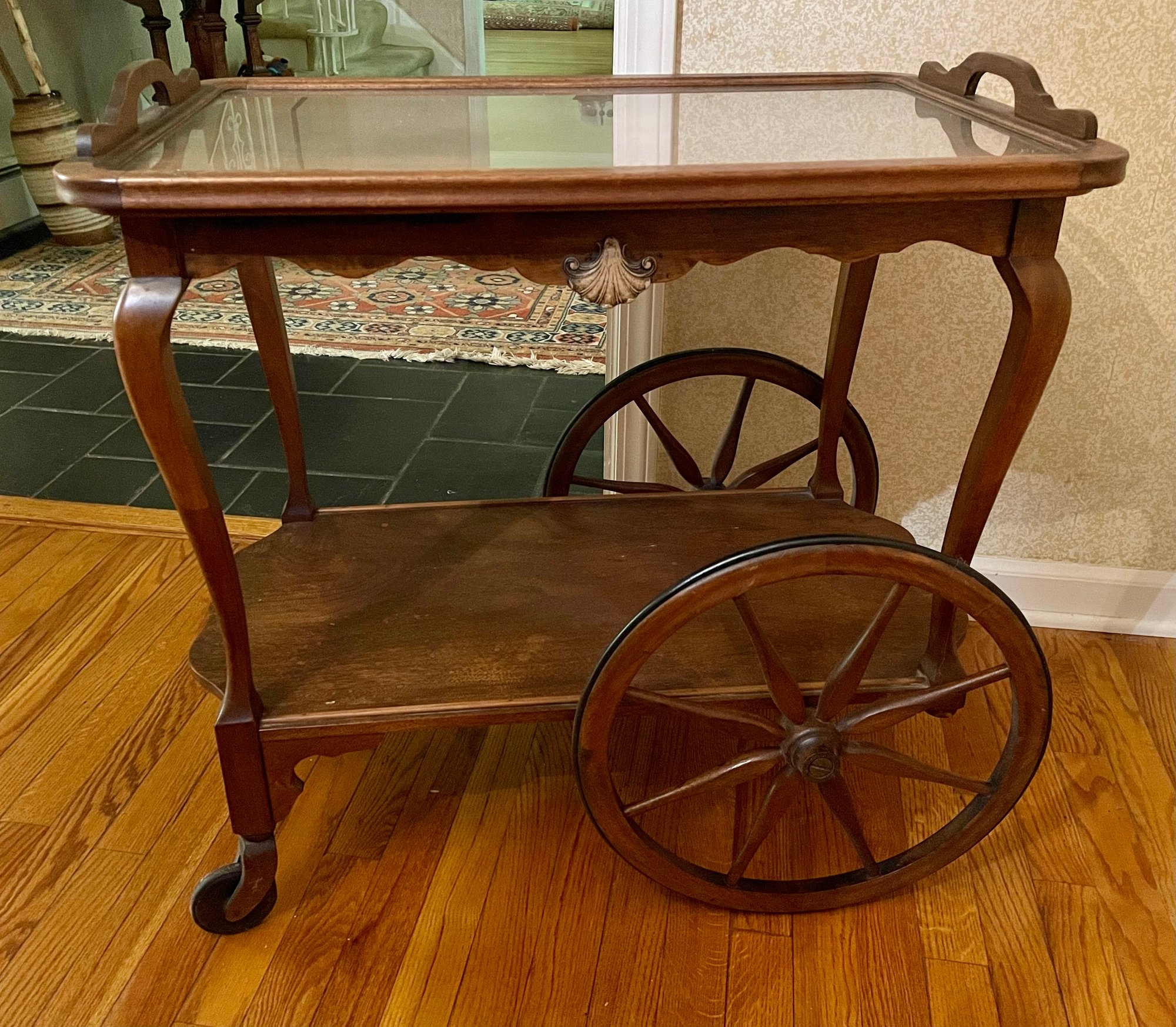 This beautiful tea cart has a great elegant look with cabriole legs, a scalloped edge at the top of the cart, and even has a golden shell in the center. The removable tray has a clear glass bottom. Tea anyone?