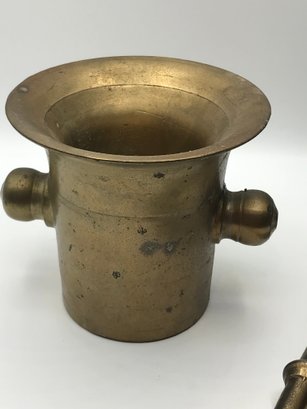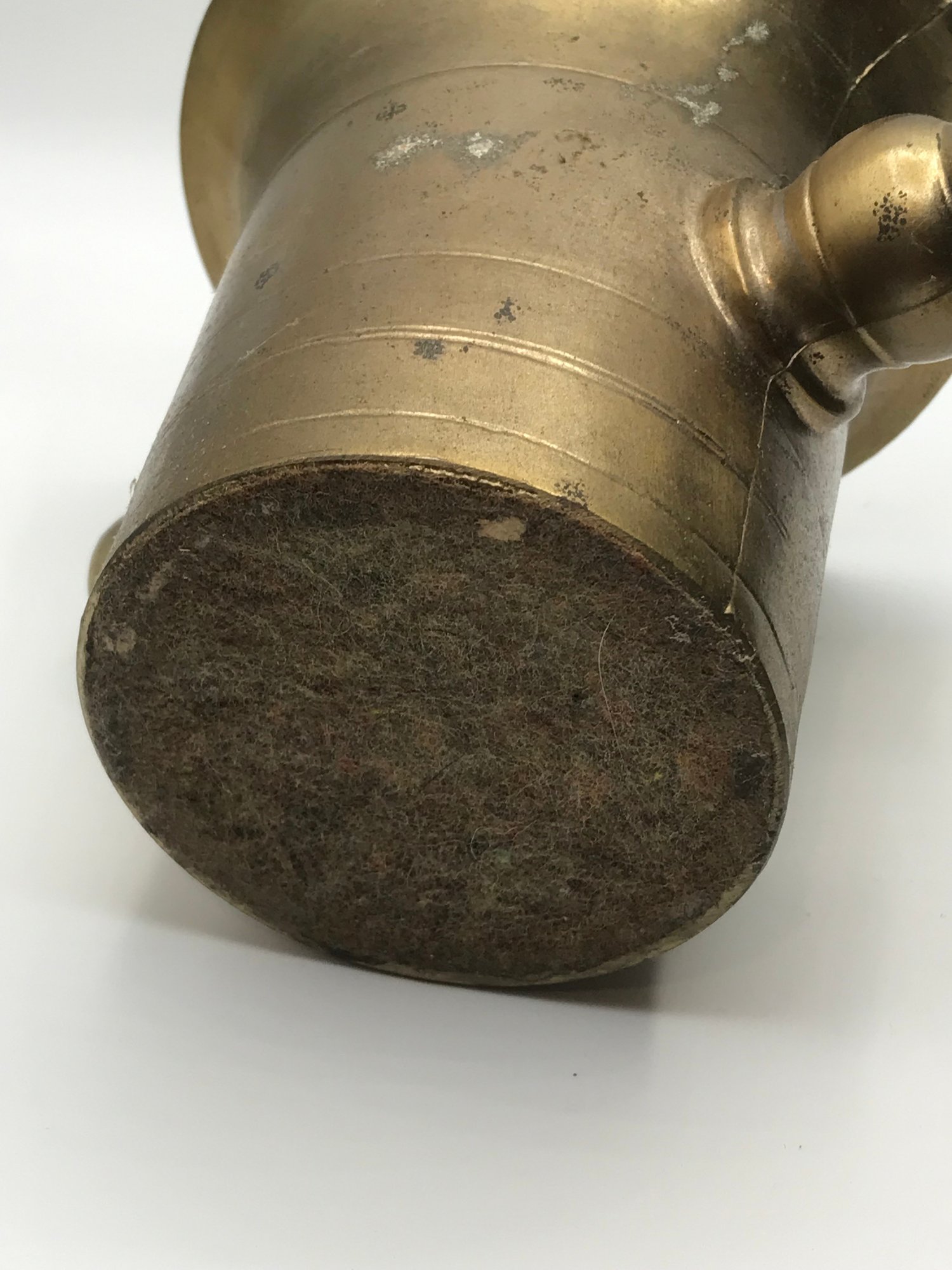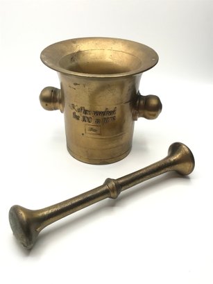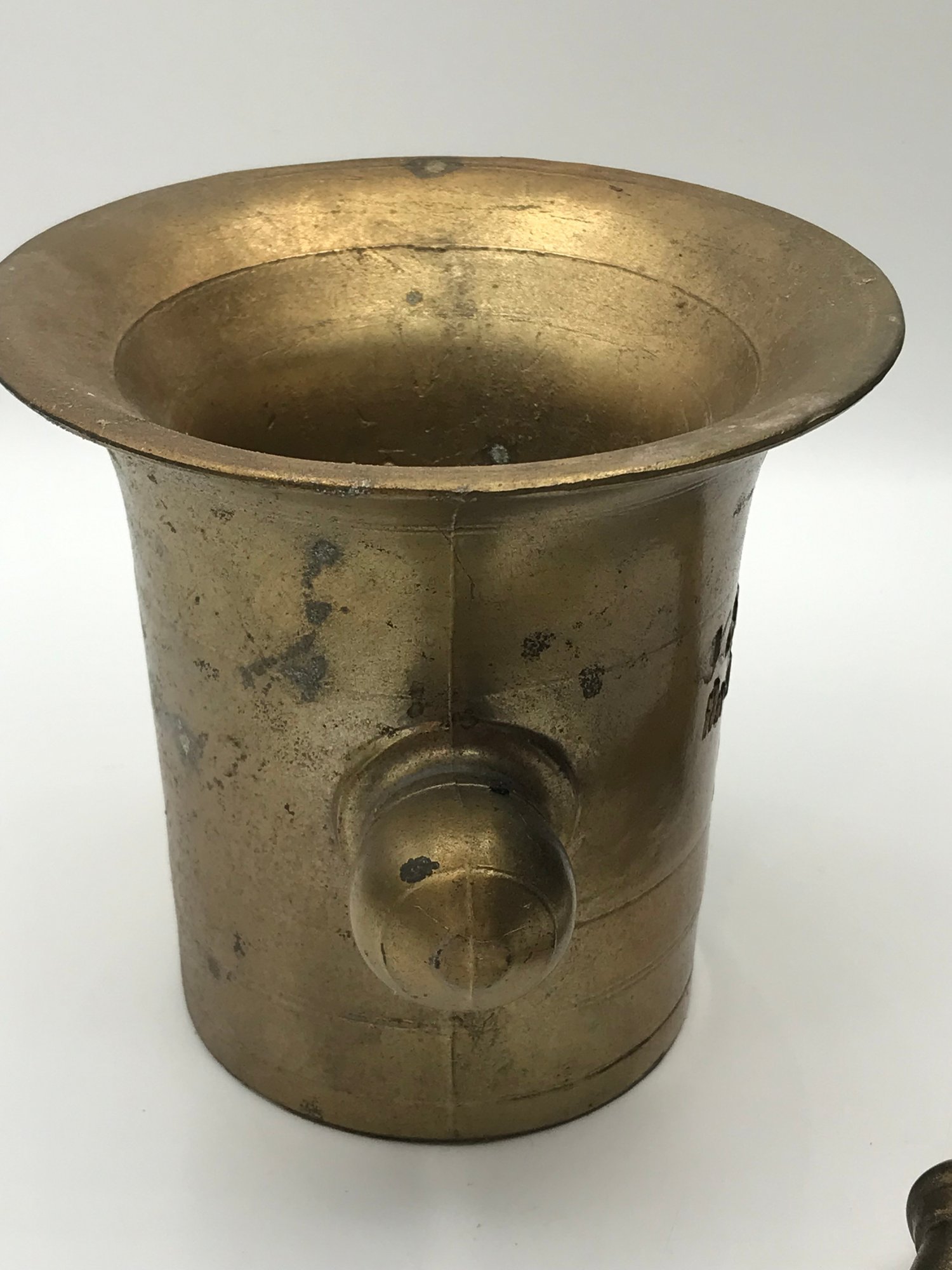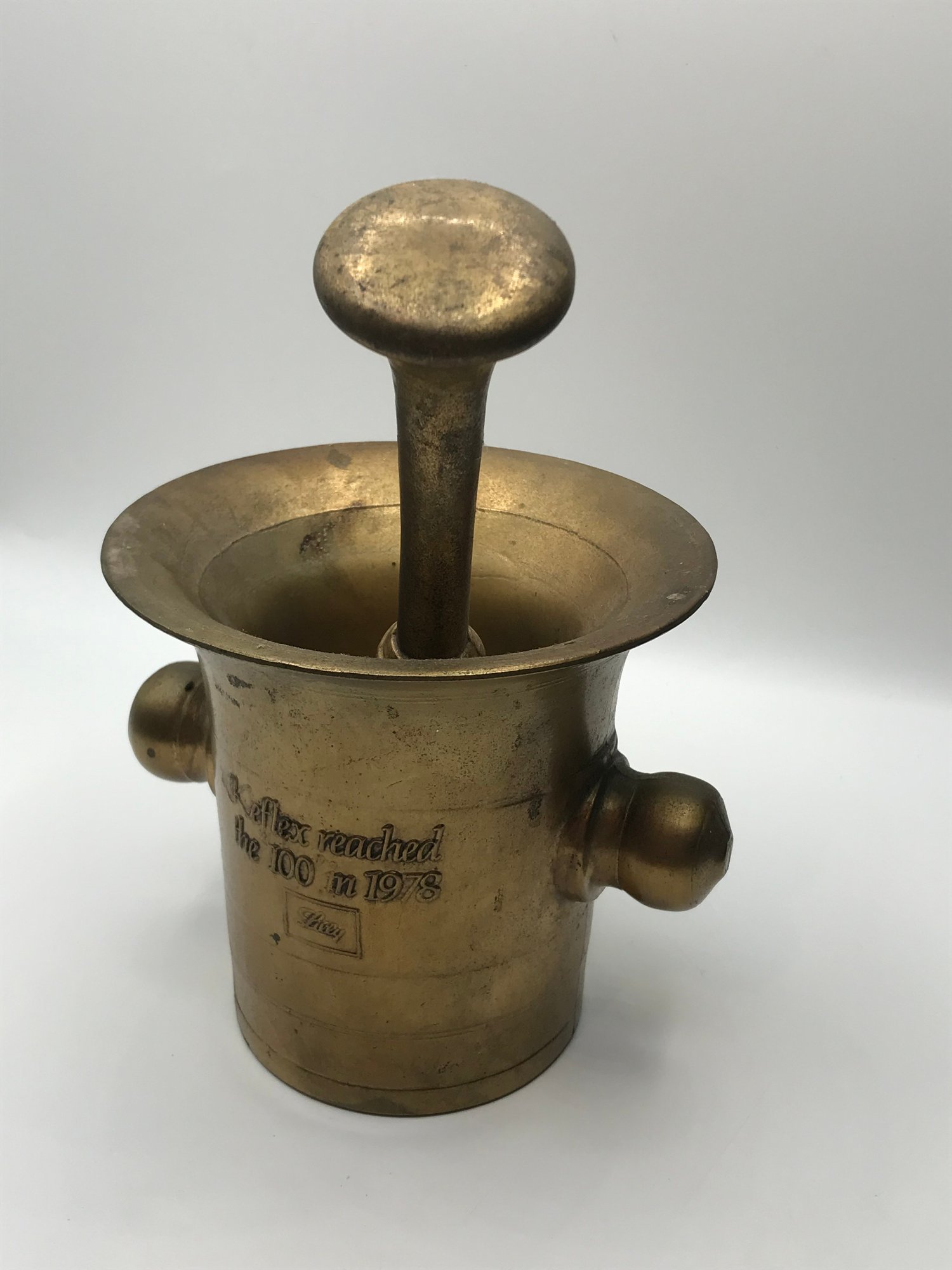 This set was likely issued to pharmacists or medical professionals to celebrate a major sales milestone for the antibiotic Keflex in the late 1970s. The mortar features a flared rim, double knob handles, and a felt-lined base to protect surfaces. The matching double-ended pestle has a nice weight and ergonomic grip.