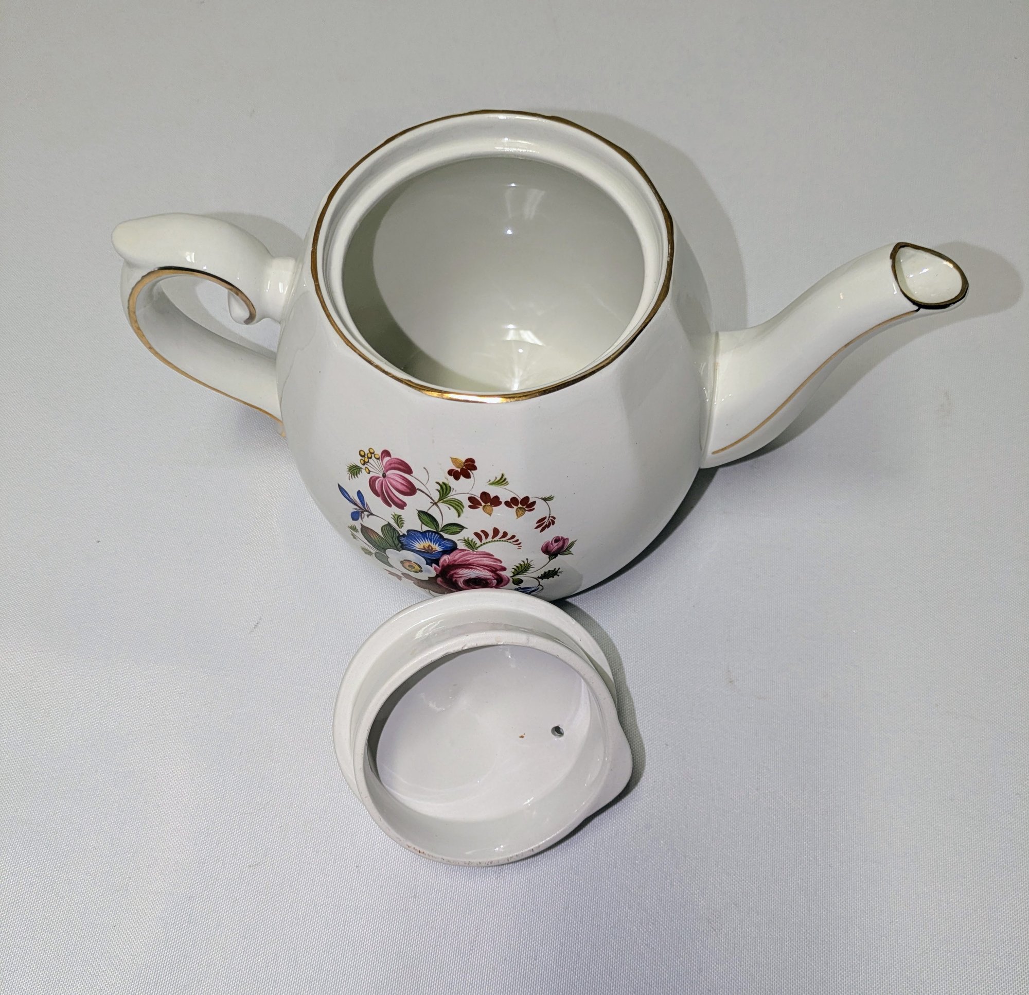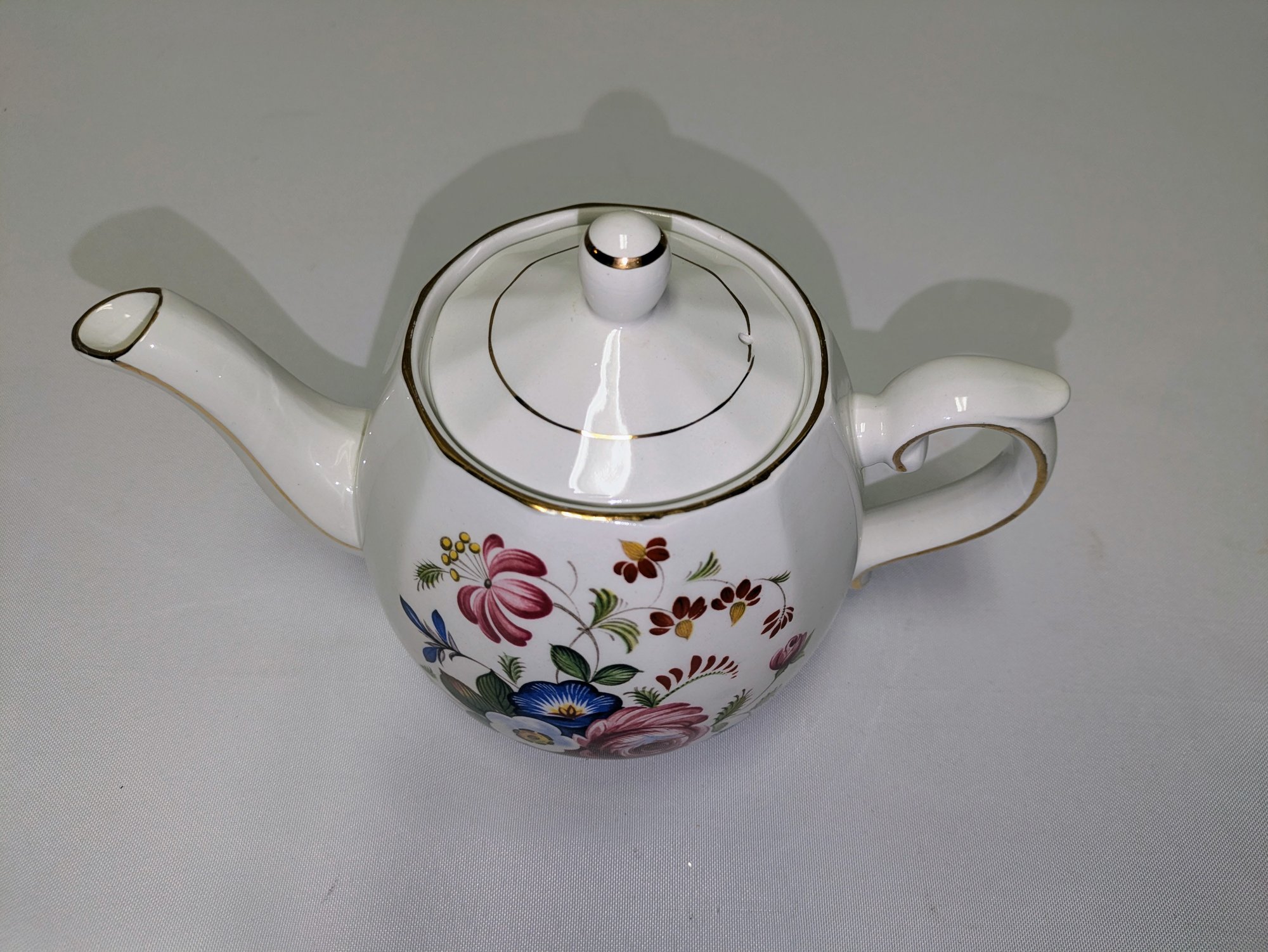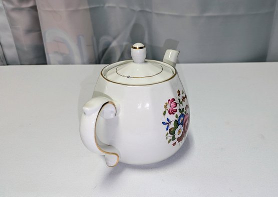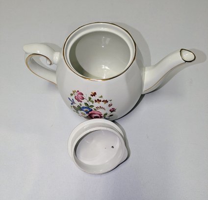 Vintage Ellgreave Wood & Sons English ironstone Teapot. Beautiful Detail and design, featuring a multi-color floral pattern and gold trim. Excellent Vintage Condition. Please see all photos as part of the description and condition. 6 "H (with lid) x 5" x 8.75 (handle to spout).
