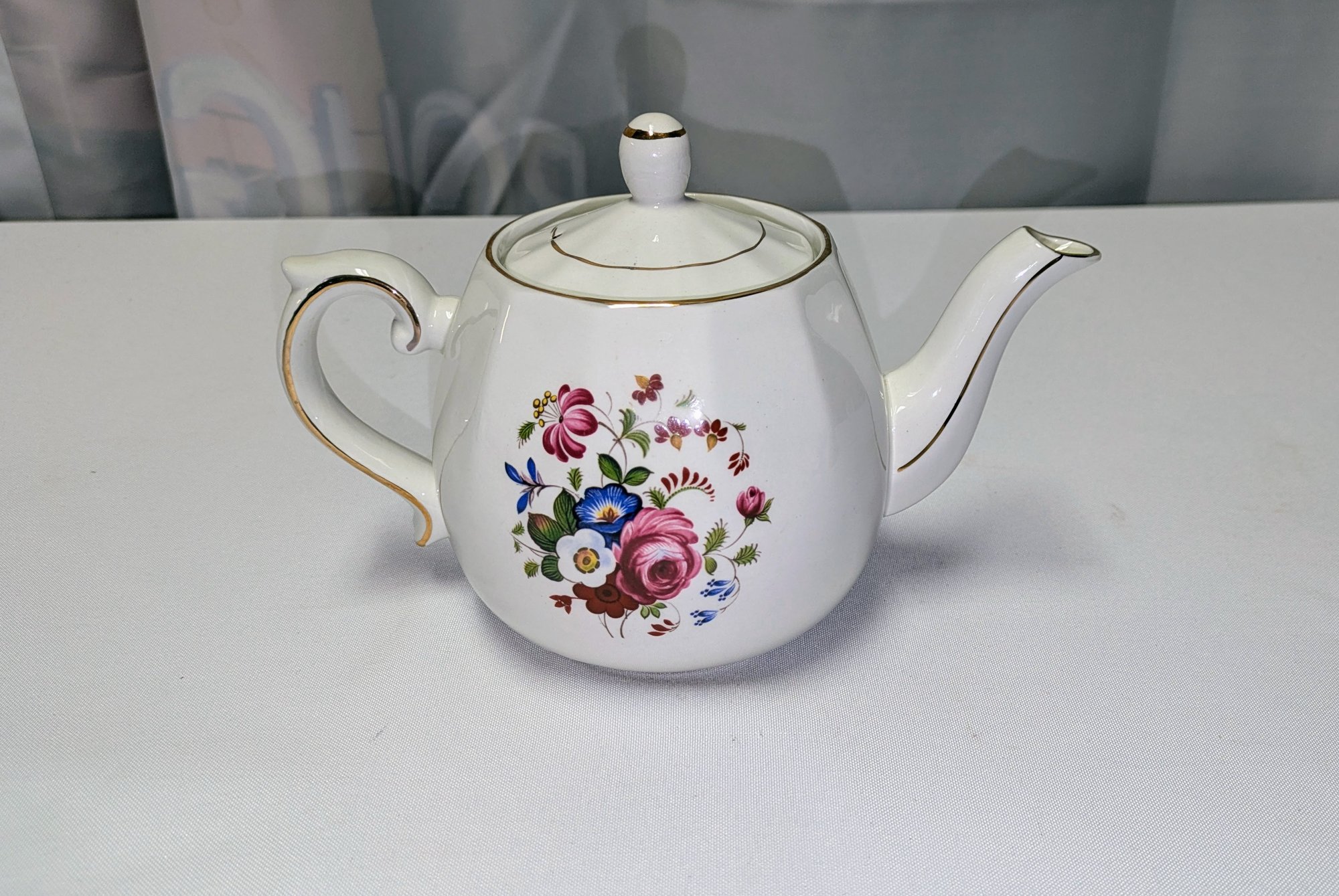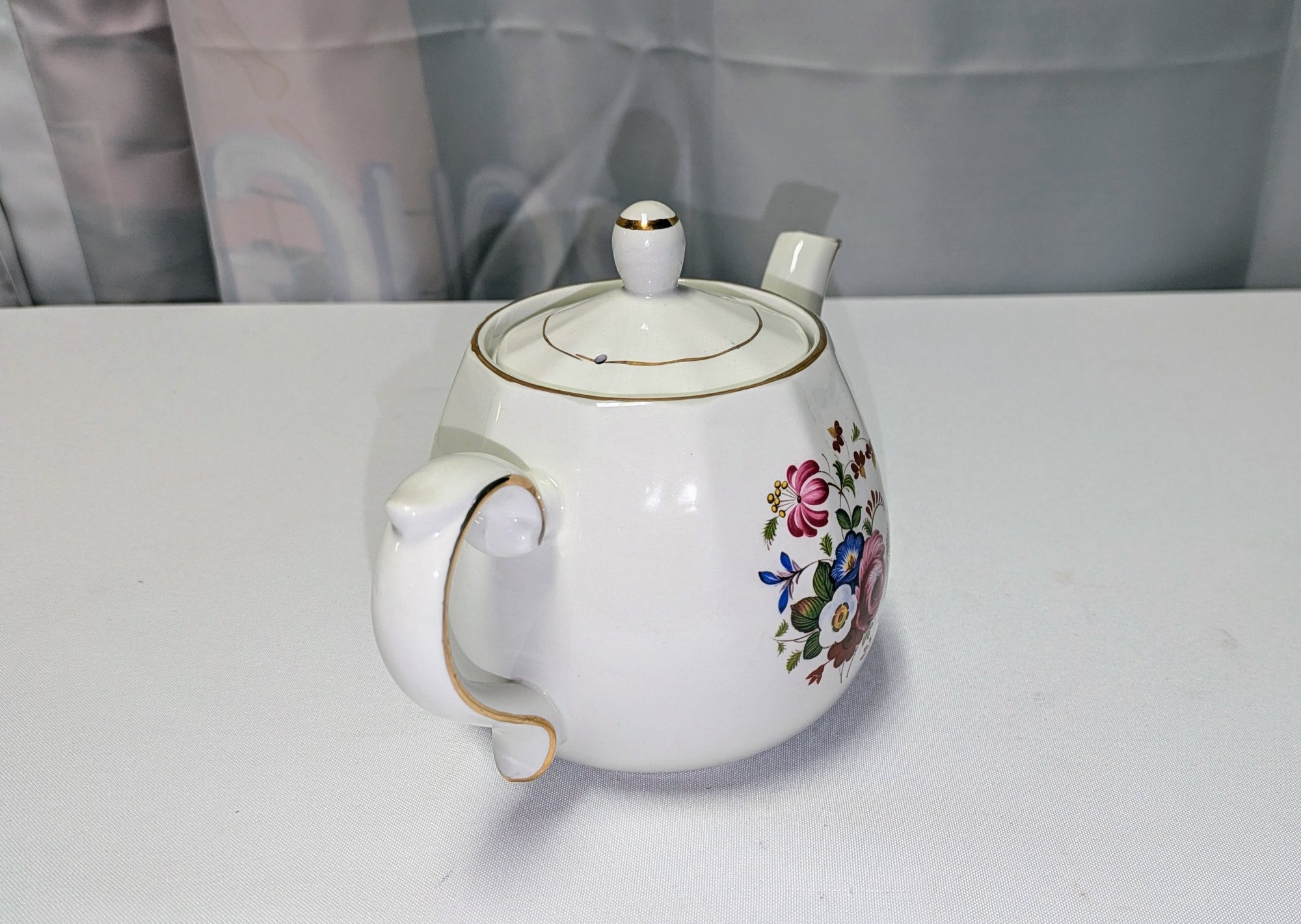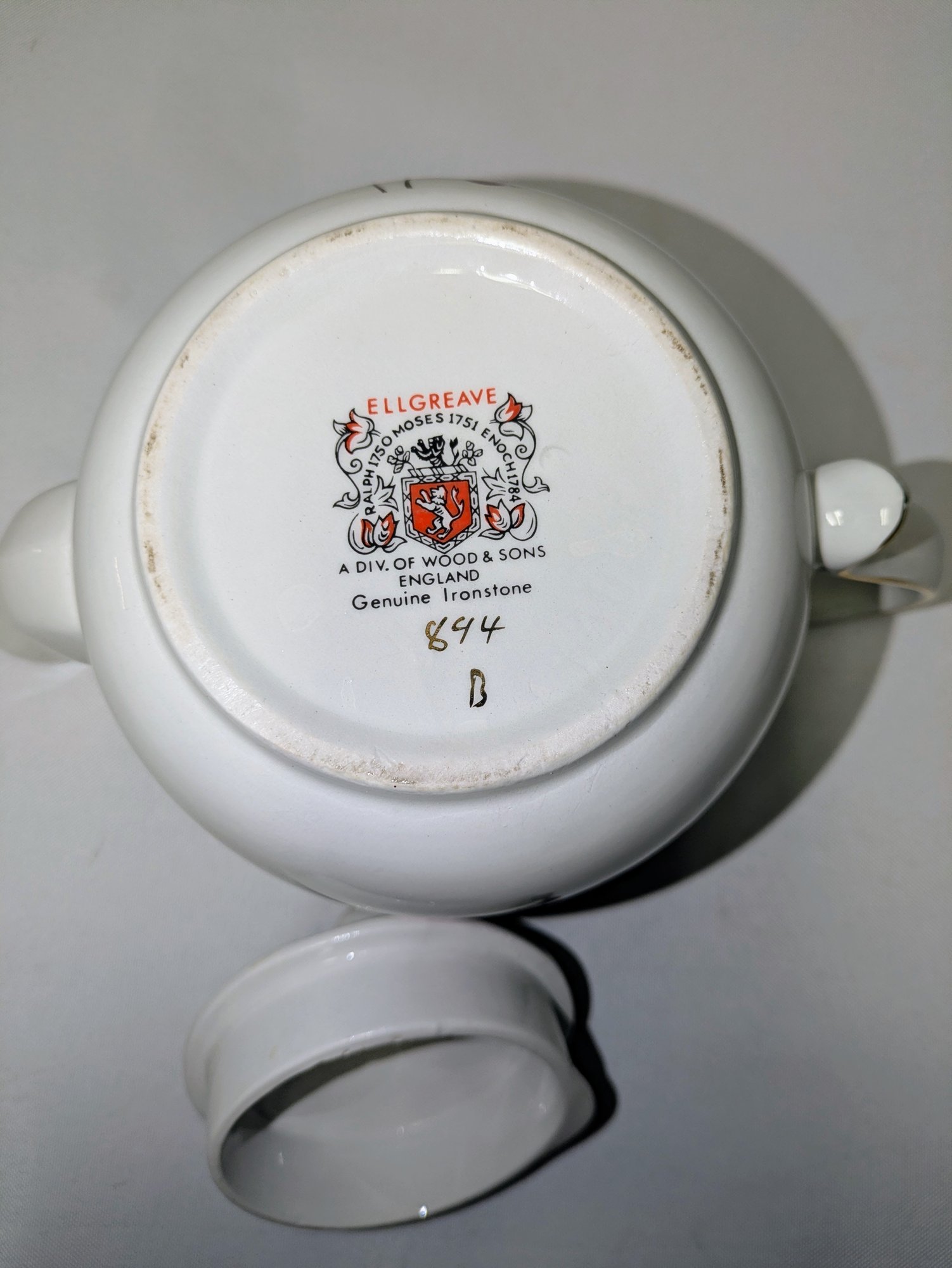 Vintage Ellgreave Wood & Sons English ironstone Teapot. Beautiful Detail and design, featuring a multi-color floral pattern and gold trim. Excellent Vintage Condition. Please see all photos as part of the description and condition. 6 "H (with lid) x 5" x 8.75 (handle to spout).