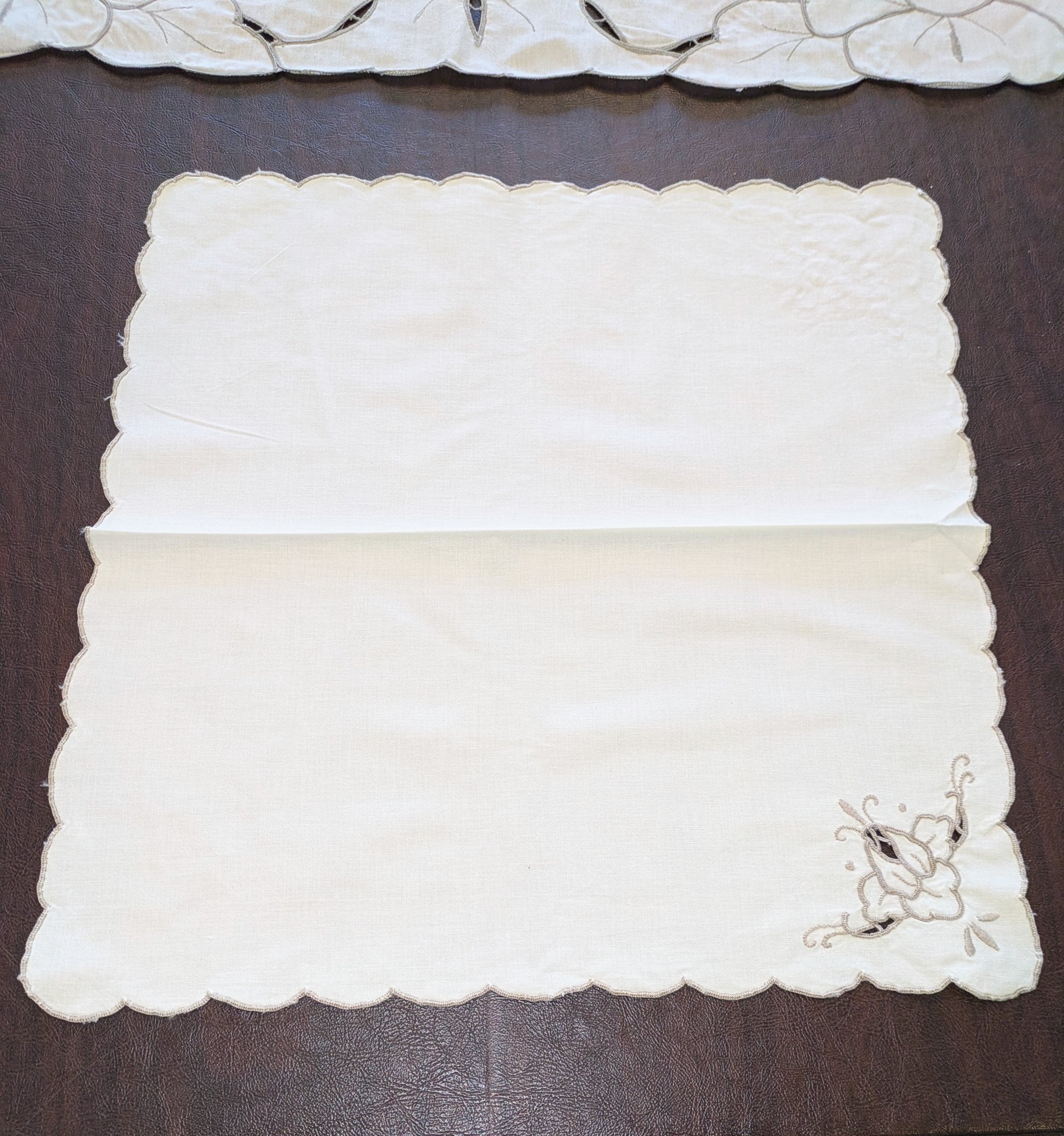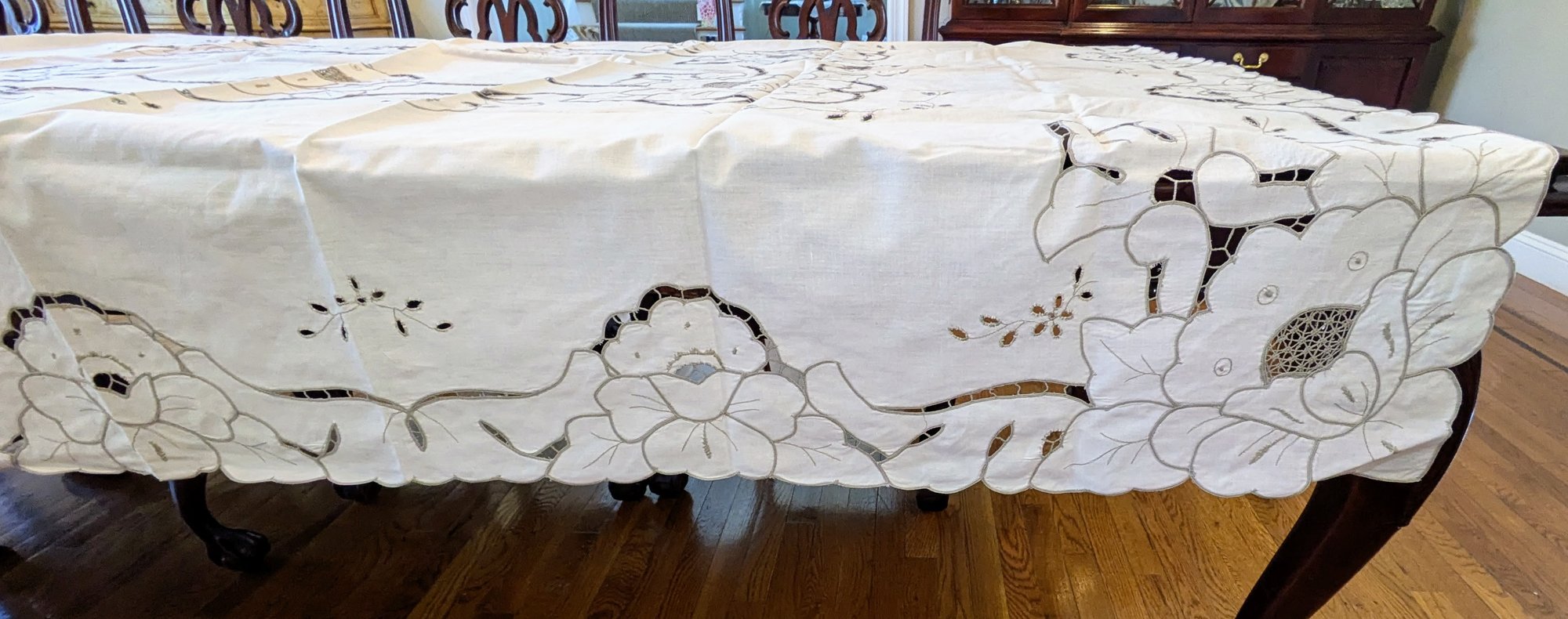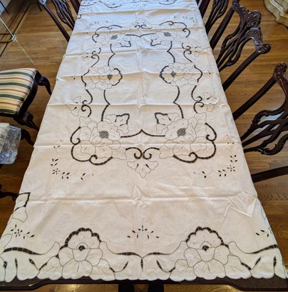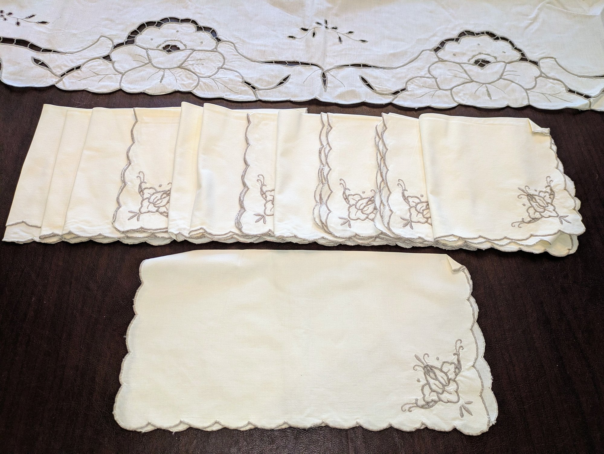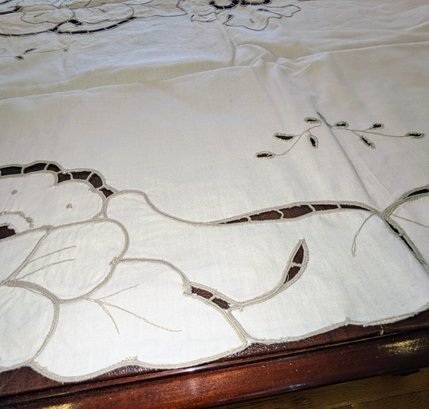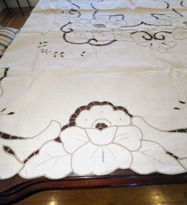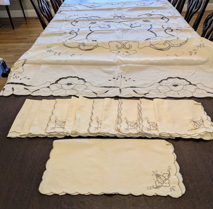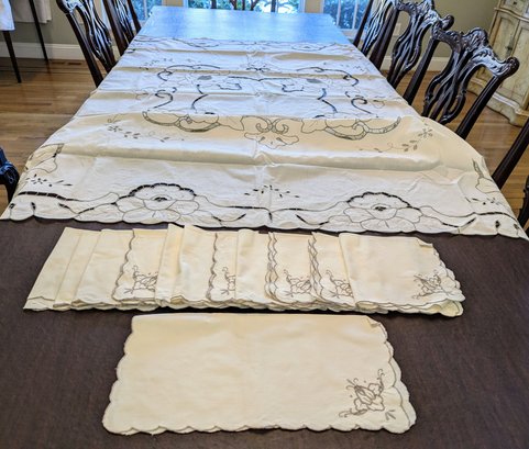 Vintage Embroidered & Taupe/Gray Detailed Rectangular Tablecloths with (12) Matching Napkins. Stunning floral detailing and design pattern, in Excellent/Very Good Vintage Condition. Please see all photos as part of the description and condition. Tablecloth 83.5" x 68" / Napkins 15.5"Square.