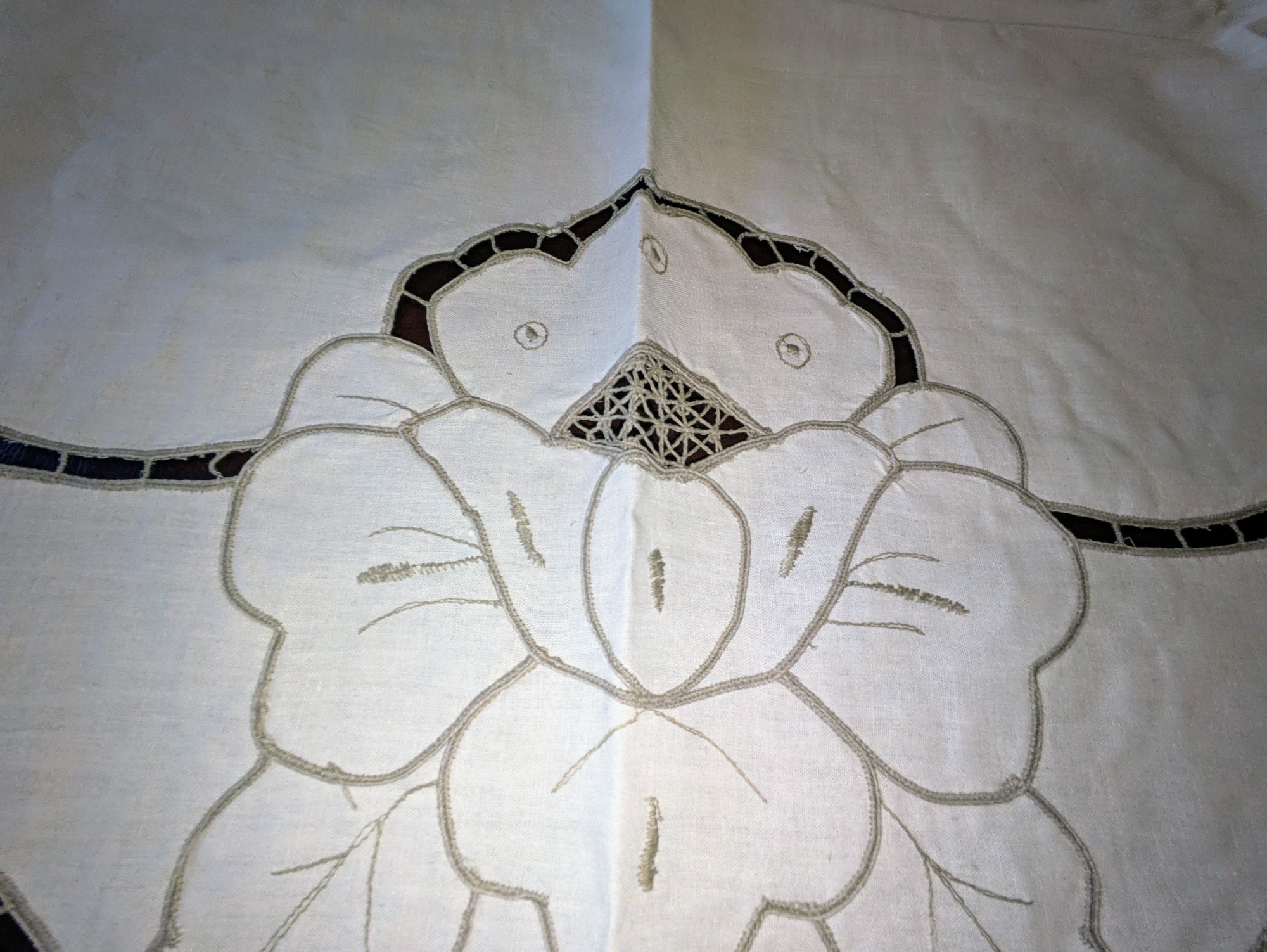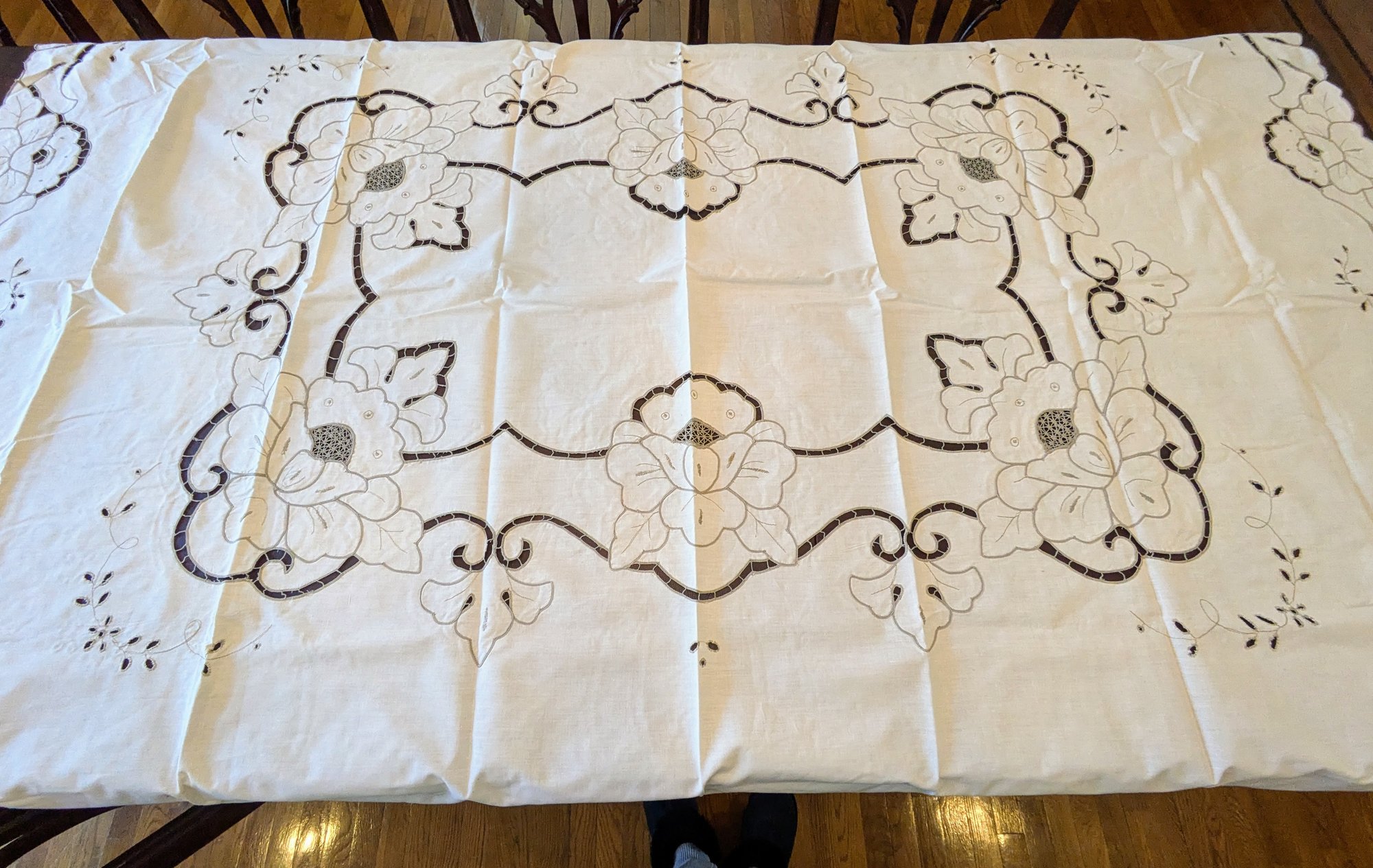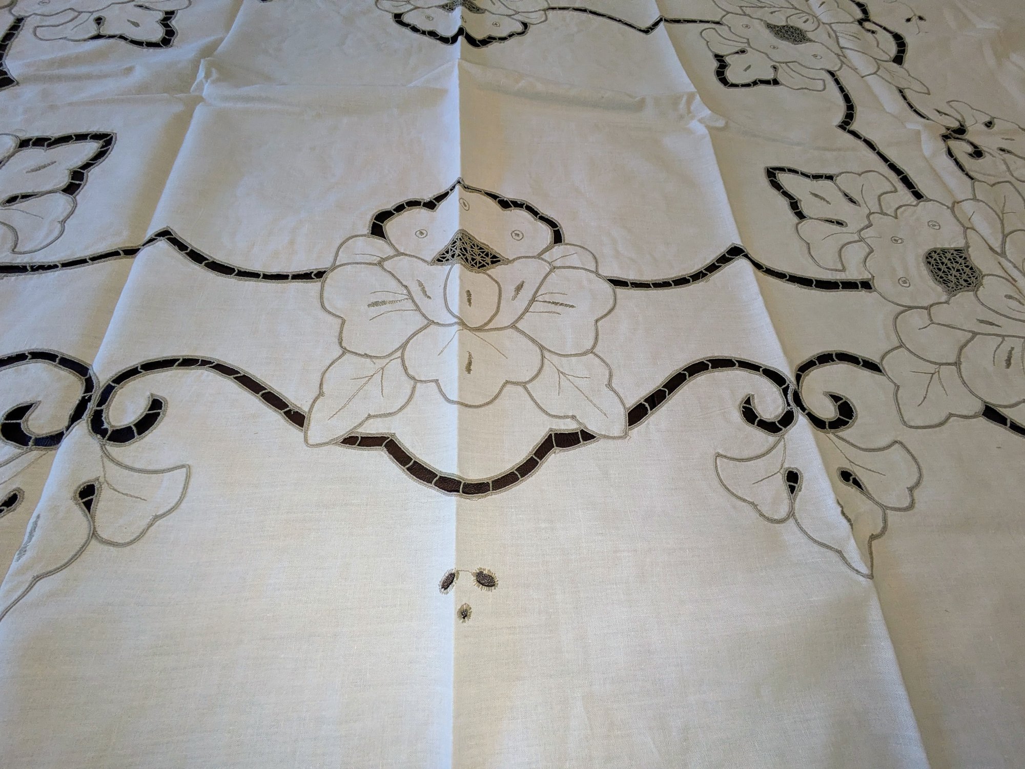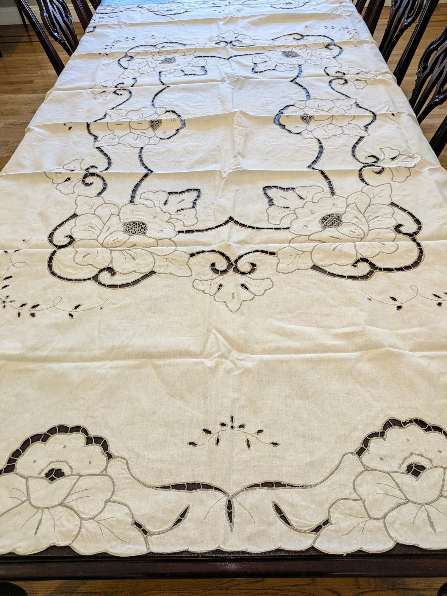 Vintage Embroidered & Taupe/Gray Detailed Rectangular Tablecloths with (12) Matching Napkins. Stunning floral detailing and design pattern, in Excellent/Very Good Vintage Condition. Please see all photos as part of the description and condition. Tablecloth 83.5" x 68" / Napkins 15.5"Square.