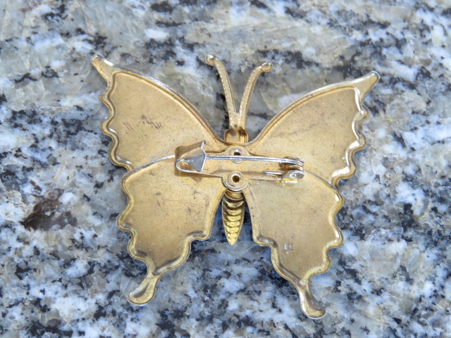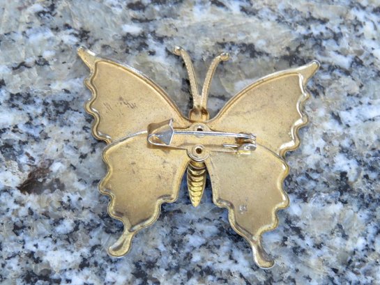 This vintage butterfly brooch features beautifully textured, multicolored enamel wings with a sparkling, mosaic-like finish. Set in a brass finish frame, the butterfly design feels lively and expressive — lightweight and easy to wear this piece is a perfect accent piece for jackets, sweaters, scarves, or bags. Length of wings is 1 1/2". Has a working clasp.