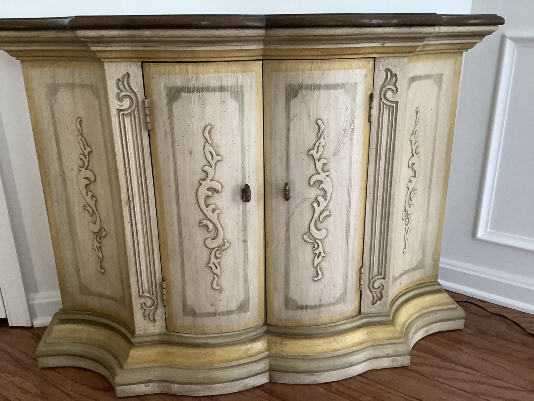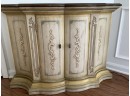 Cottage style sideboard with carved trim and filigree accents. Interior shelving Solid Wood in The White PaintThe Finish