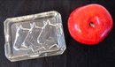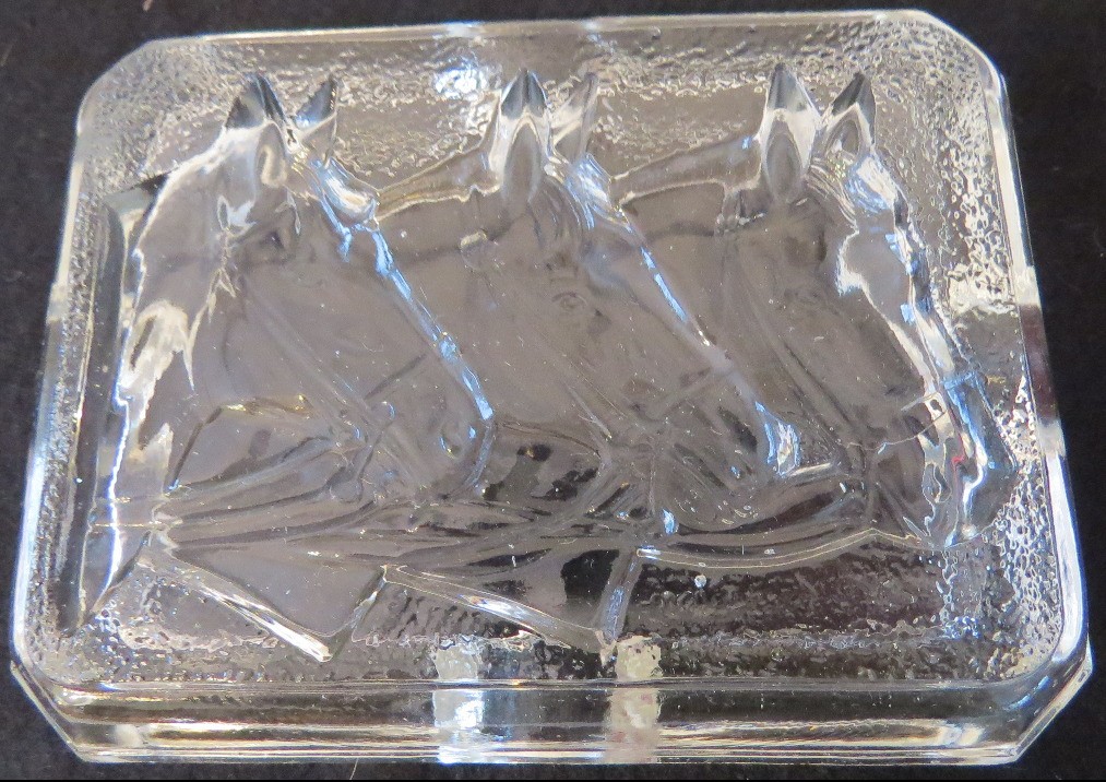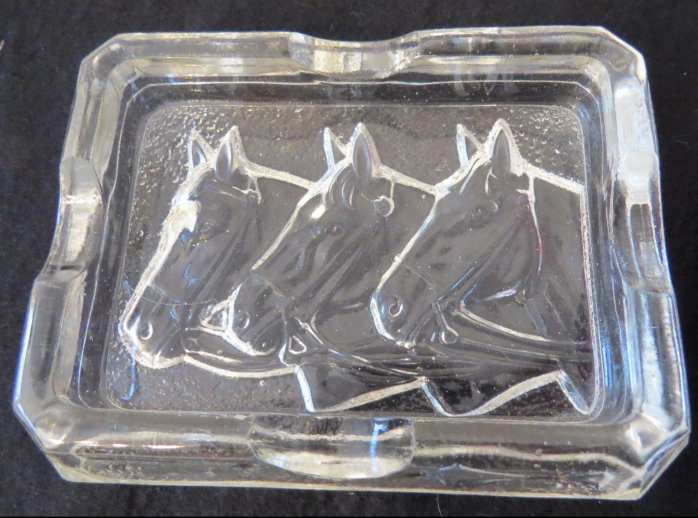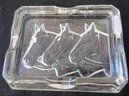 Believed to be of European origin this crystal glass ashtray with three embossed horses heads, about 3.5" x 5.5" in size.