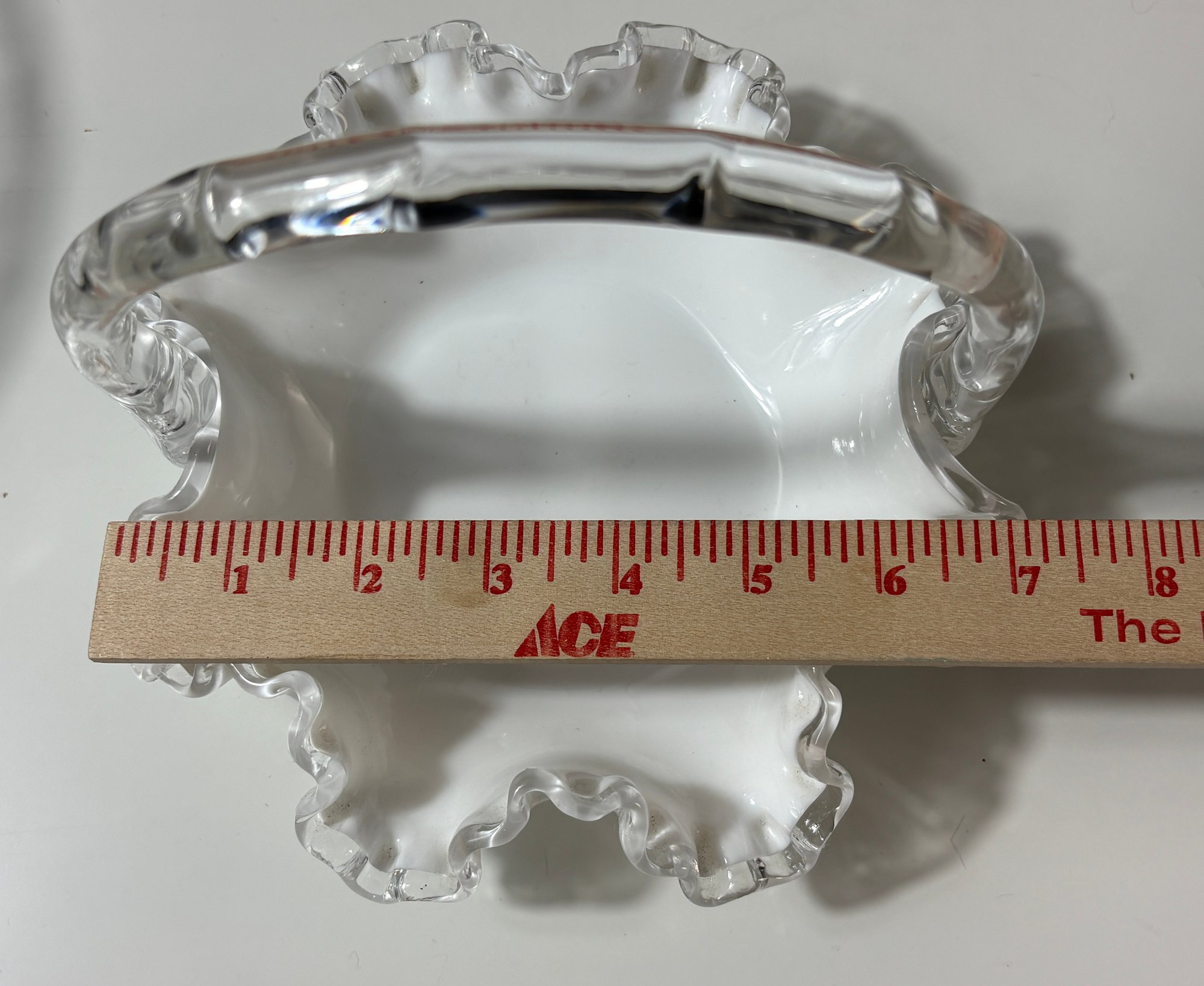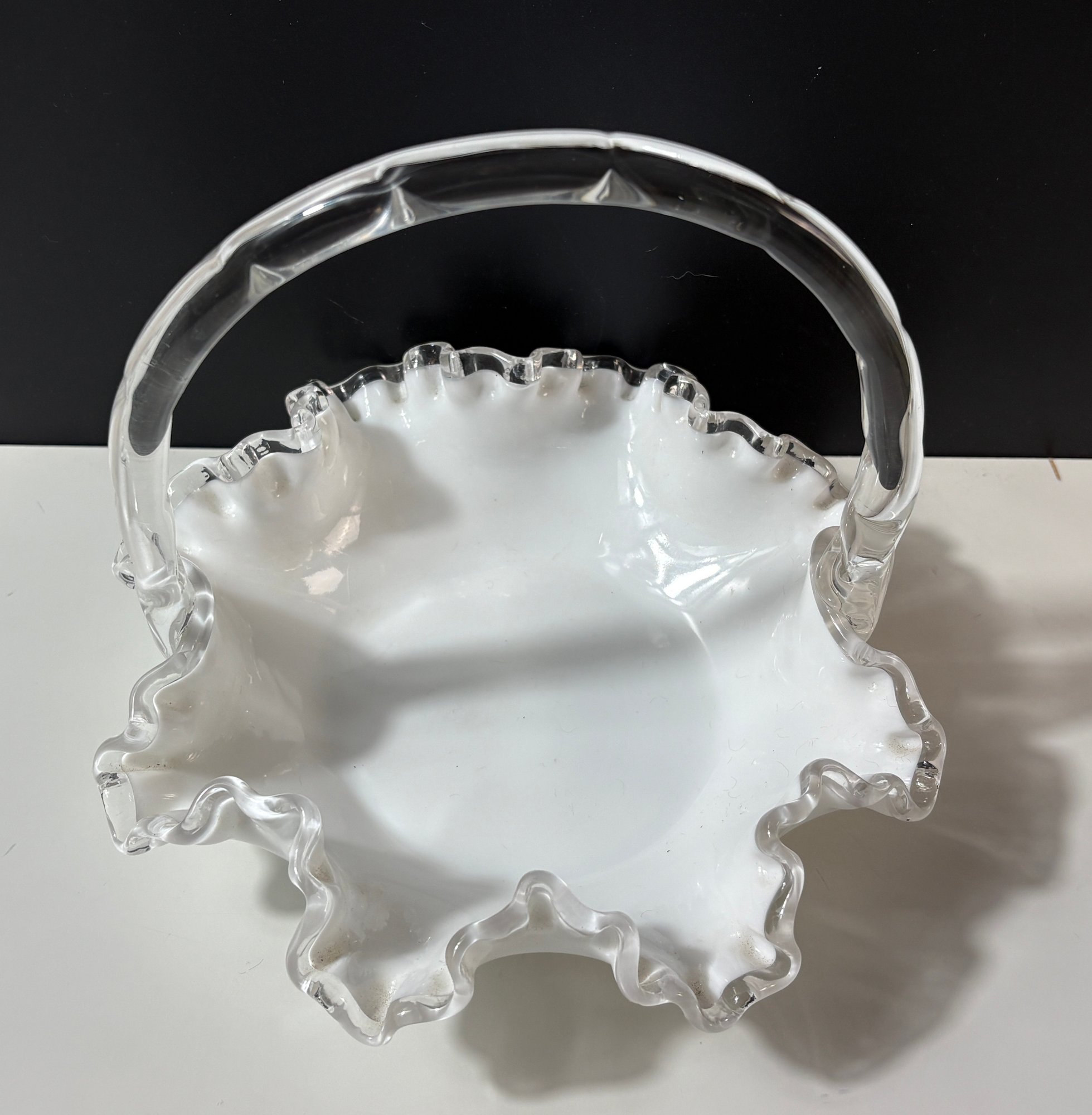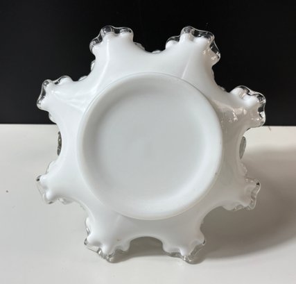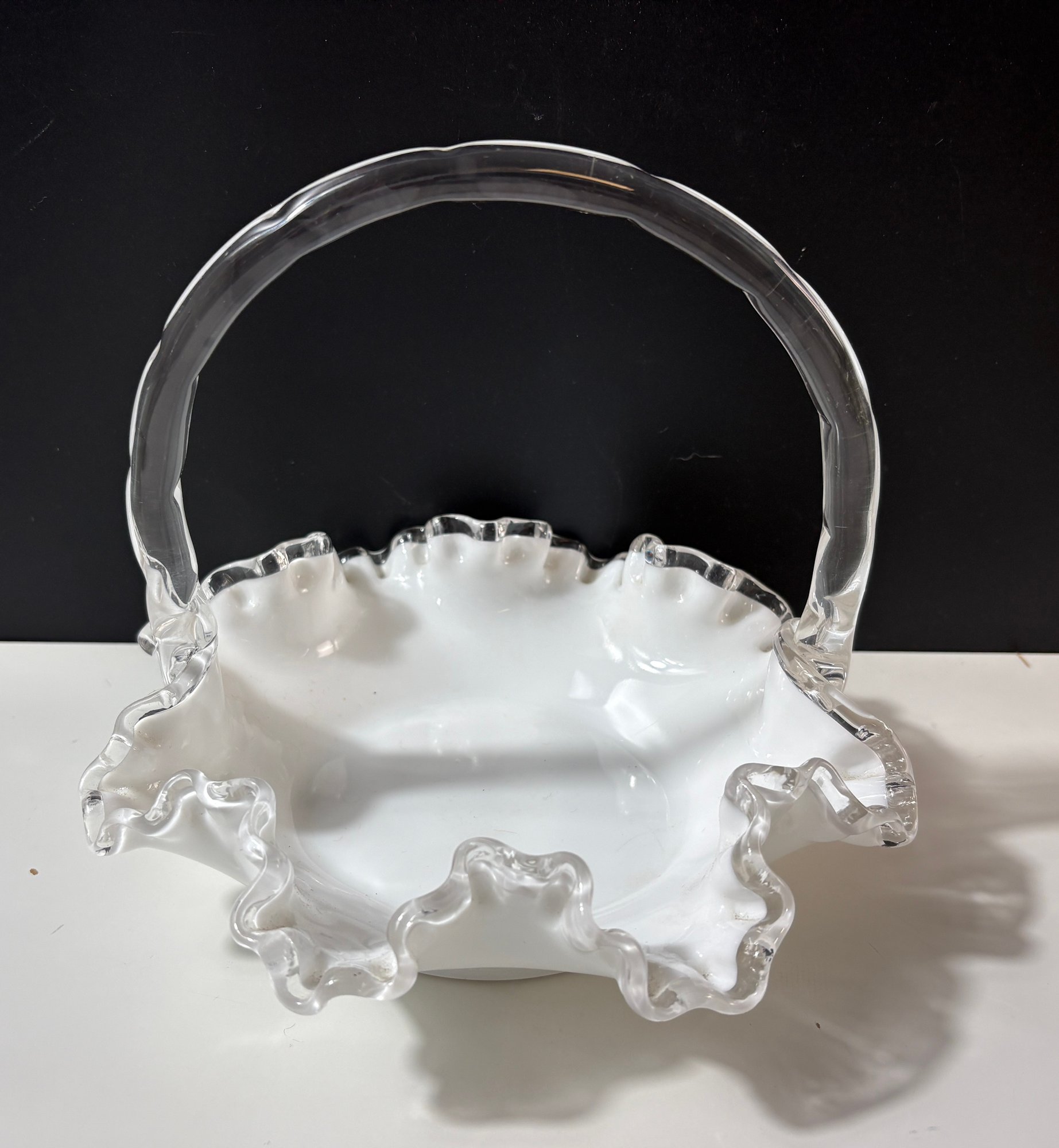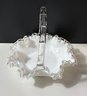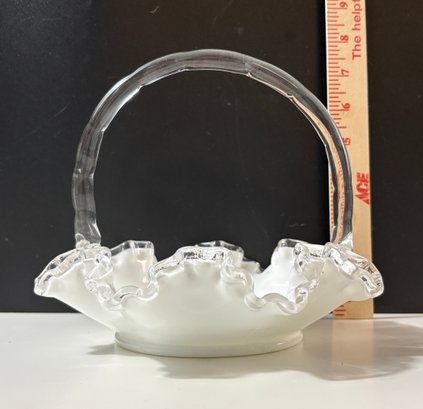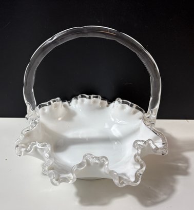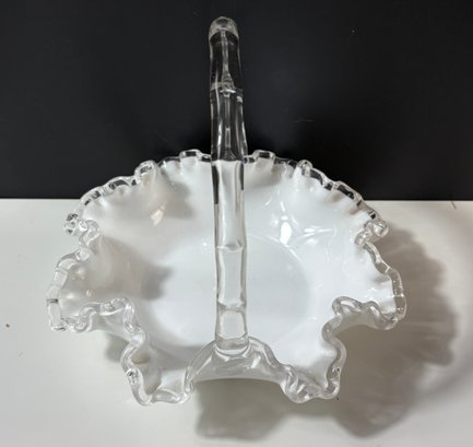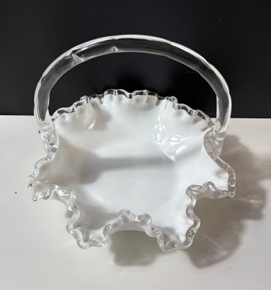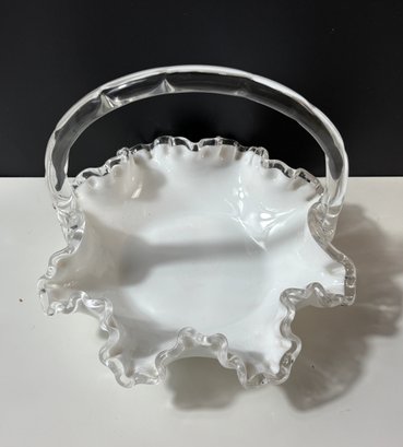 vintage Fenton Silver Crest white milk glass basket featuring a ruffled, crimped edge and a clear handle