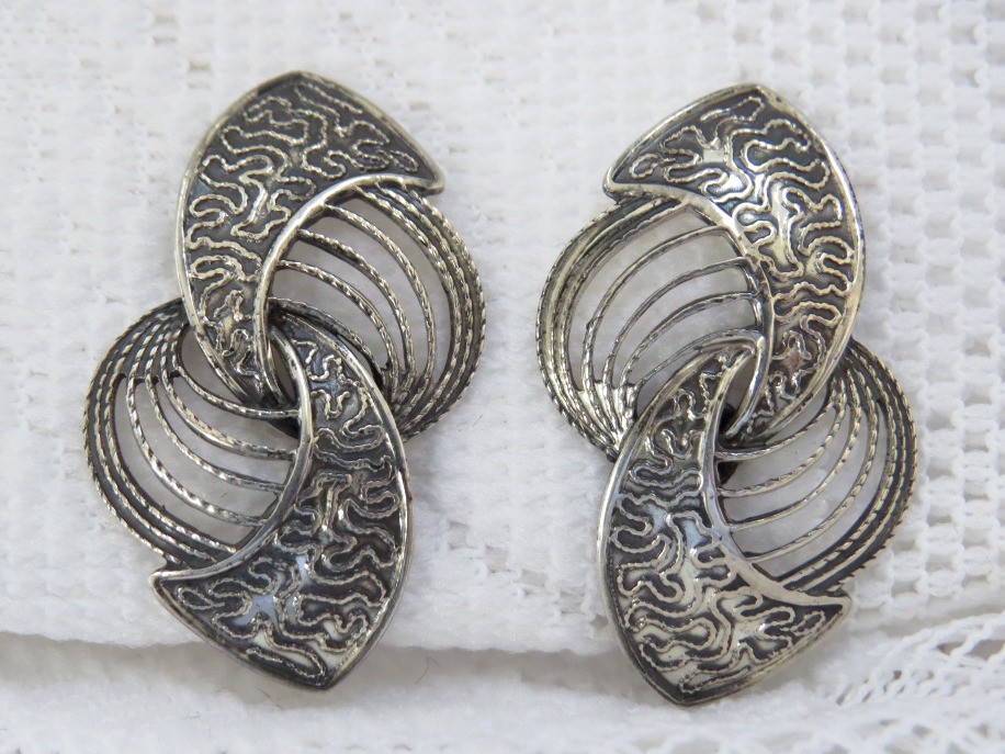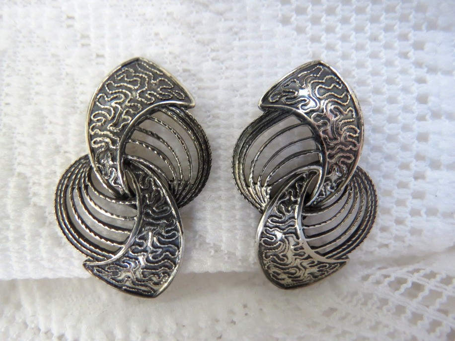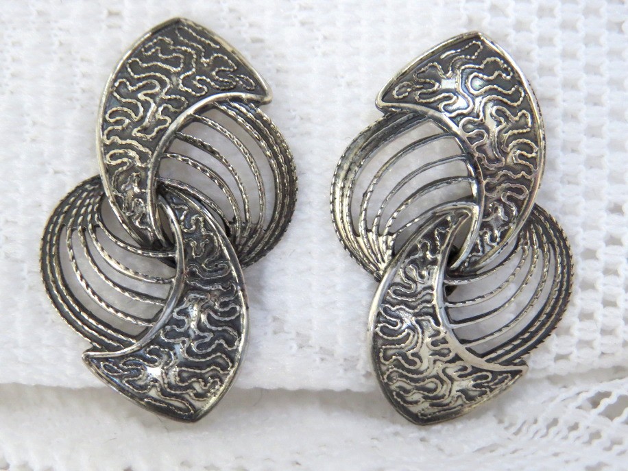These earrings feature a filigree design with a textured swirling, abstract pattern, crafted from Sterling silver and marked "Beau Sterling". Working screw back mechanism. Lightweight enough to be converted to pierced and measure 1 1/4" wide by 3/4" long. Weighs 6.21 grams