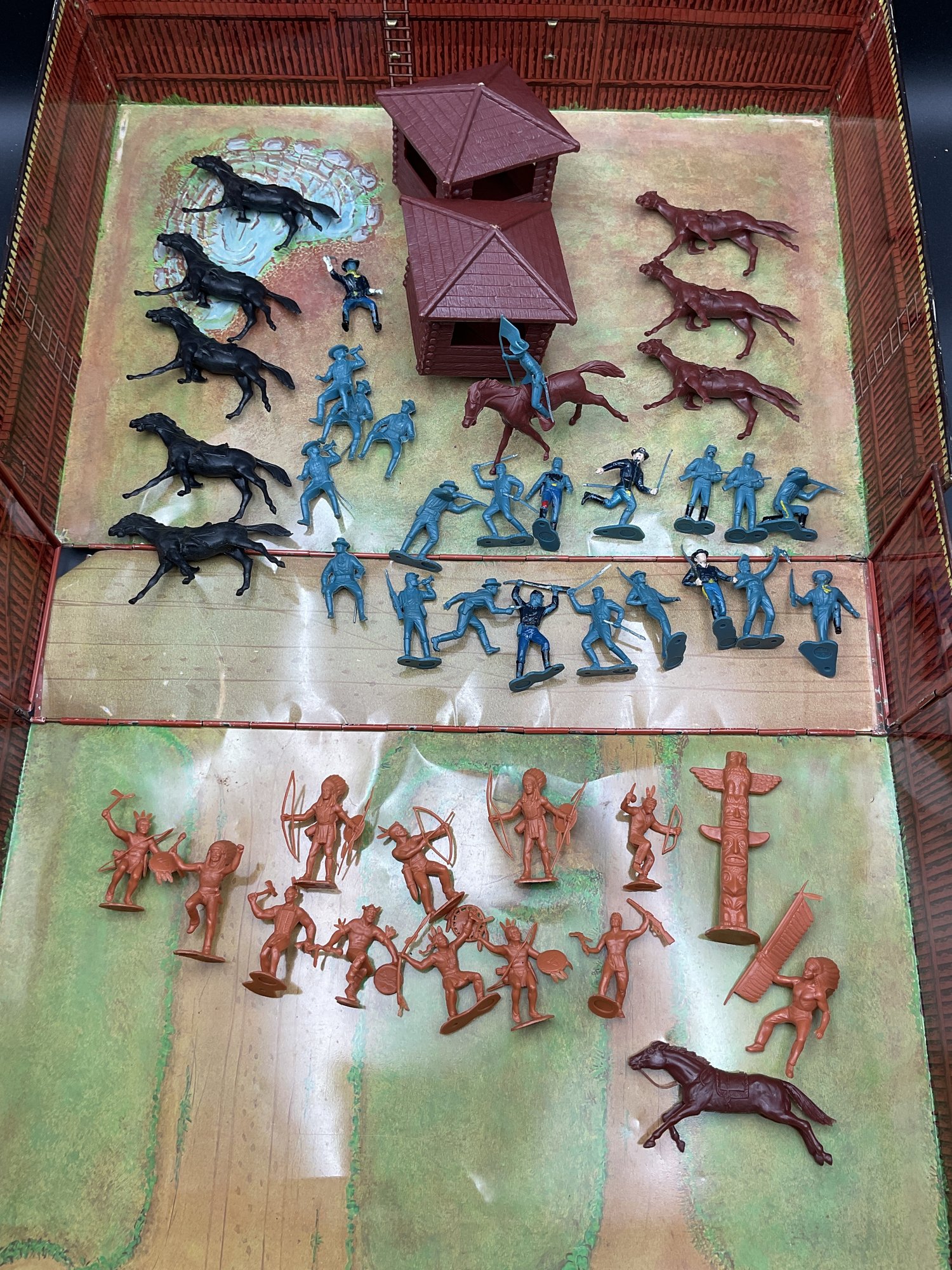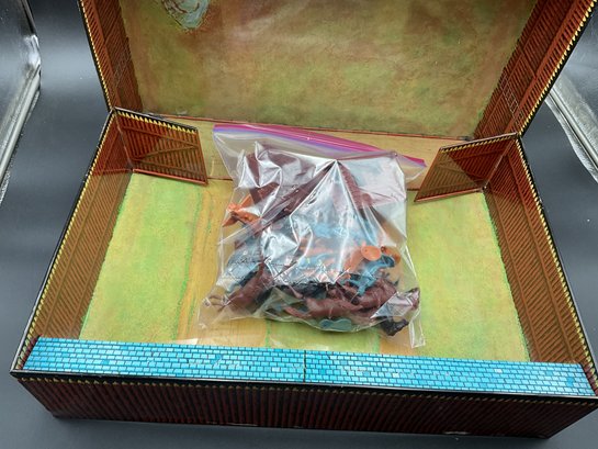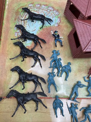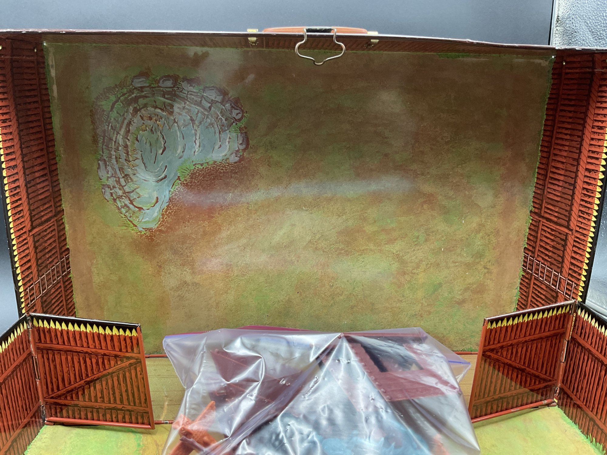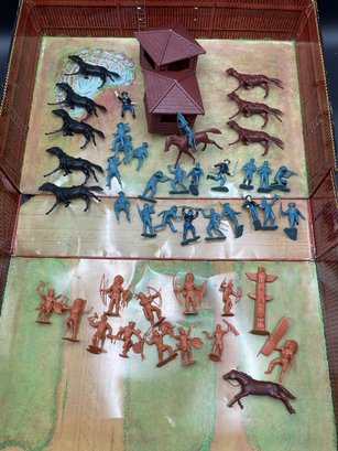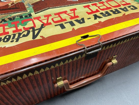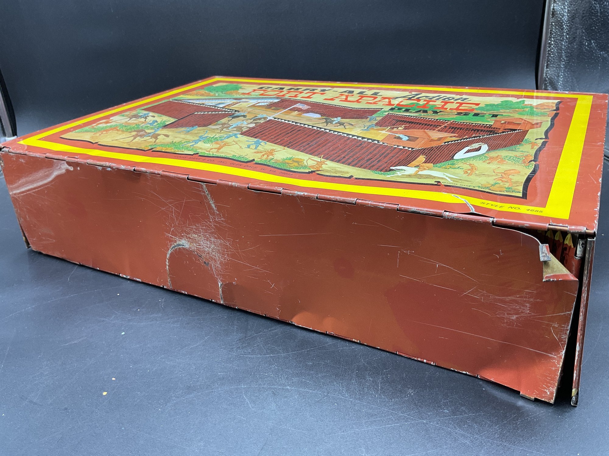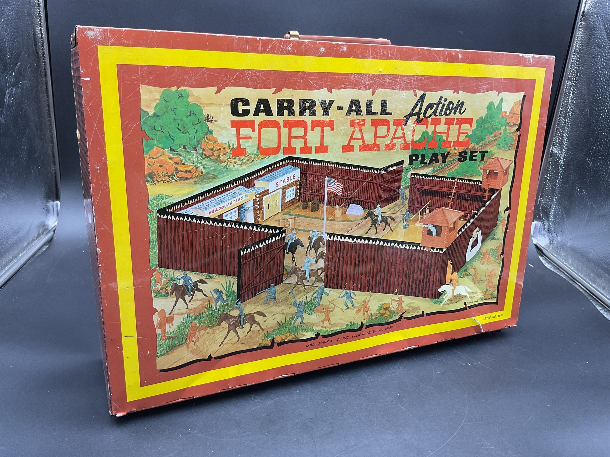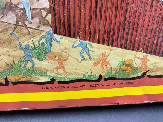 1968 Fort Apache play set from Louis Marx & Co, style no. 4685. Includes 2 lookout towers and all the figures shown, housed in original metal suitcase that folds open into the Fort. Metal case has wear and dents as shown but opens and closes well and original latch and handle still work great. Some army figures have been painted but otherwise all figures are in great condition for their age!