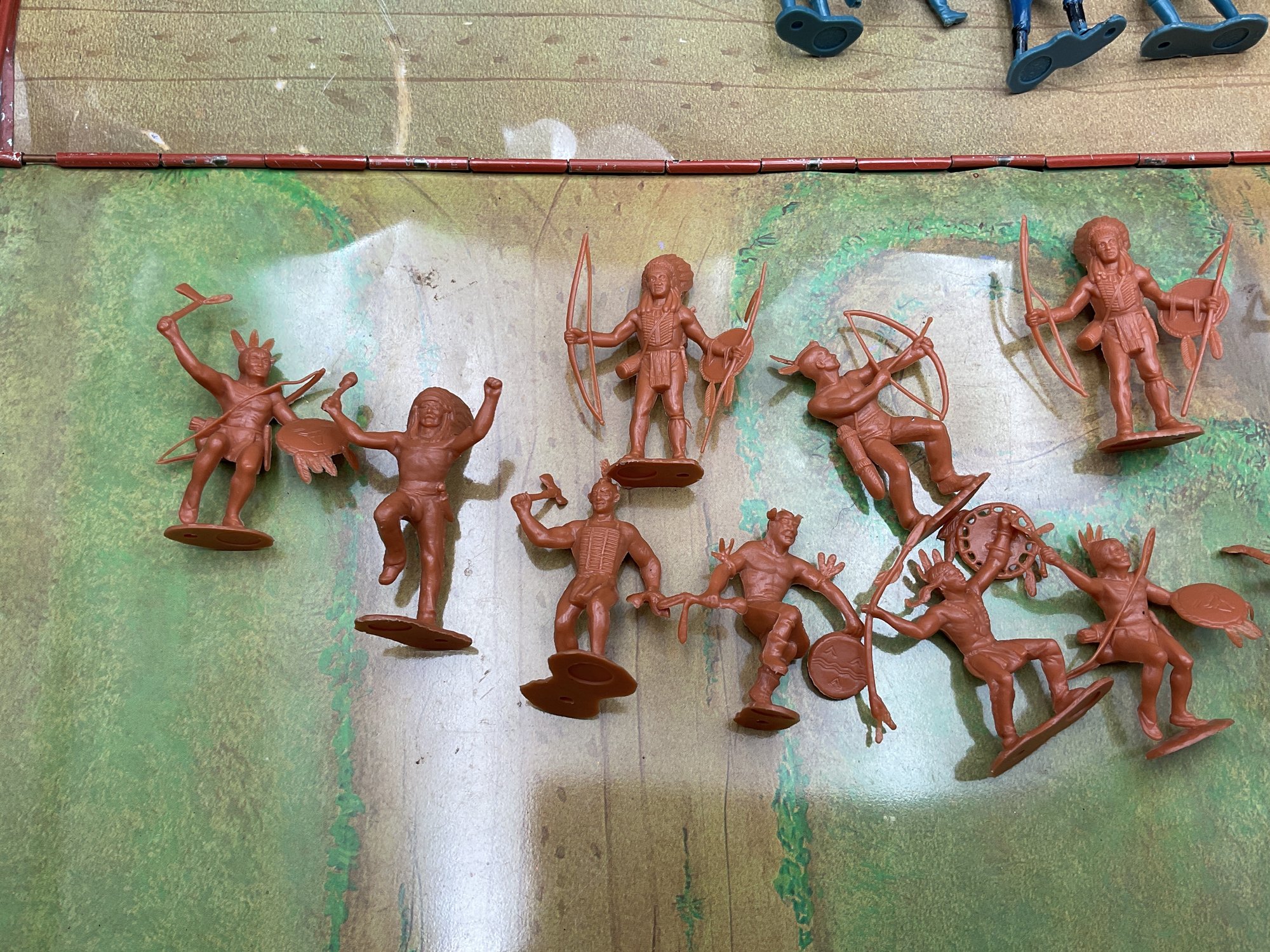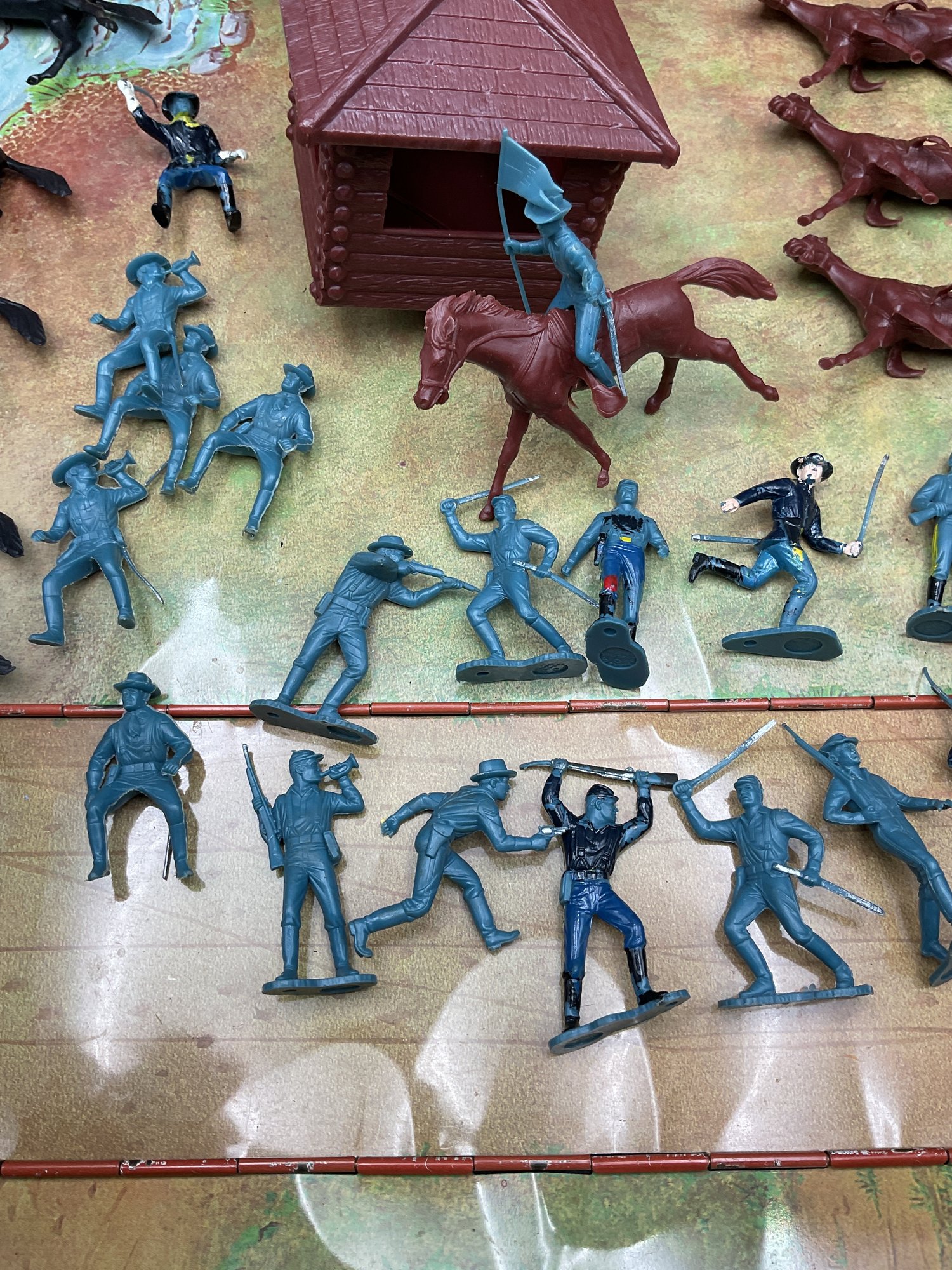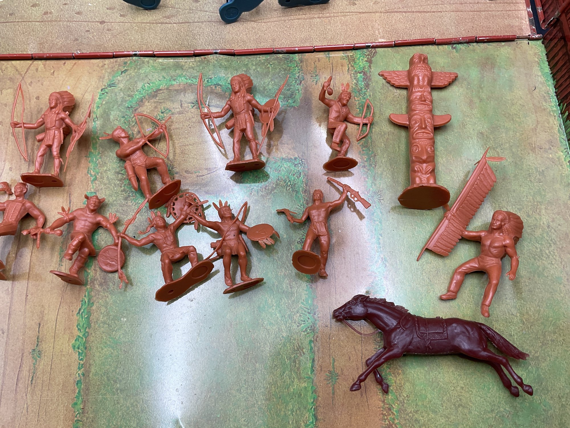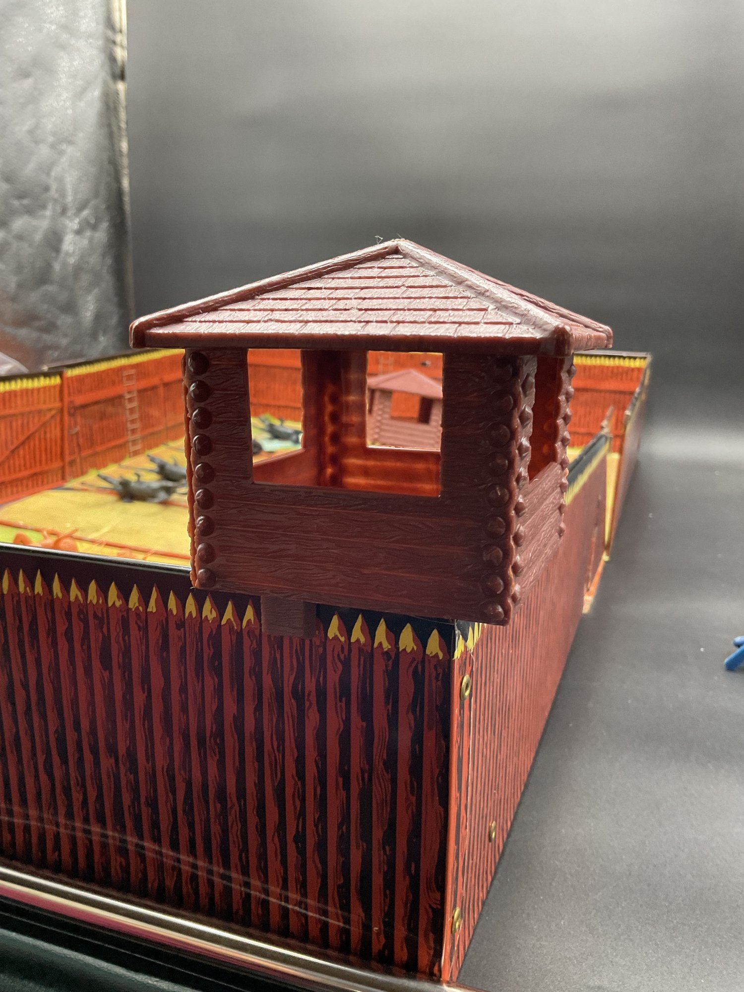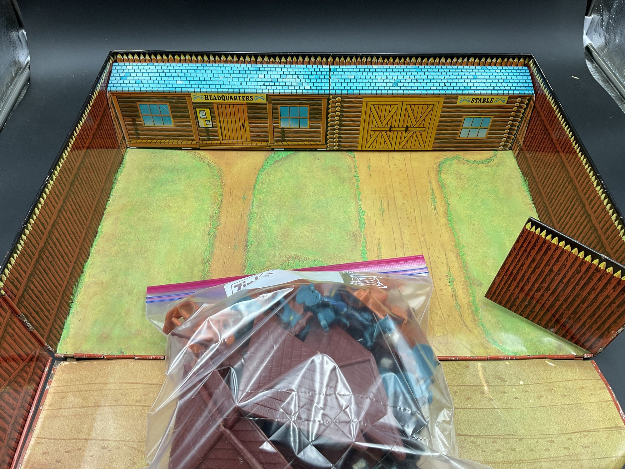 1968 Fort Apache play set from Louis Marx & Co, style no. 4685. Includes 2 lookout towers and all the figures shown, housed in original metal suitcase that folds open into the Fort. Metal case has wear and dents as shown but opens and closes well and original latch and handle still work great. Some army figures have been painted but otherwise all figures are in great condition for their age!