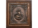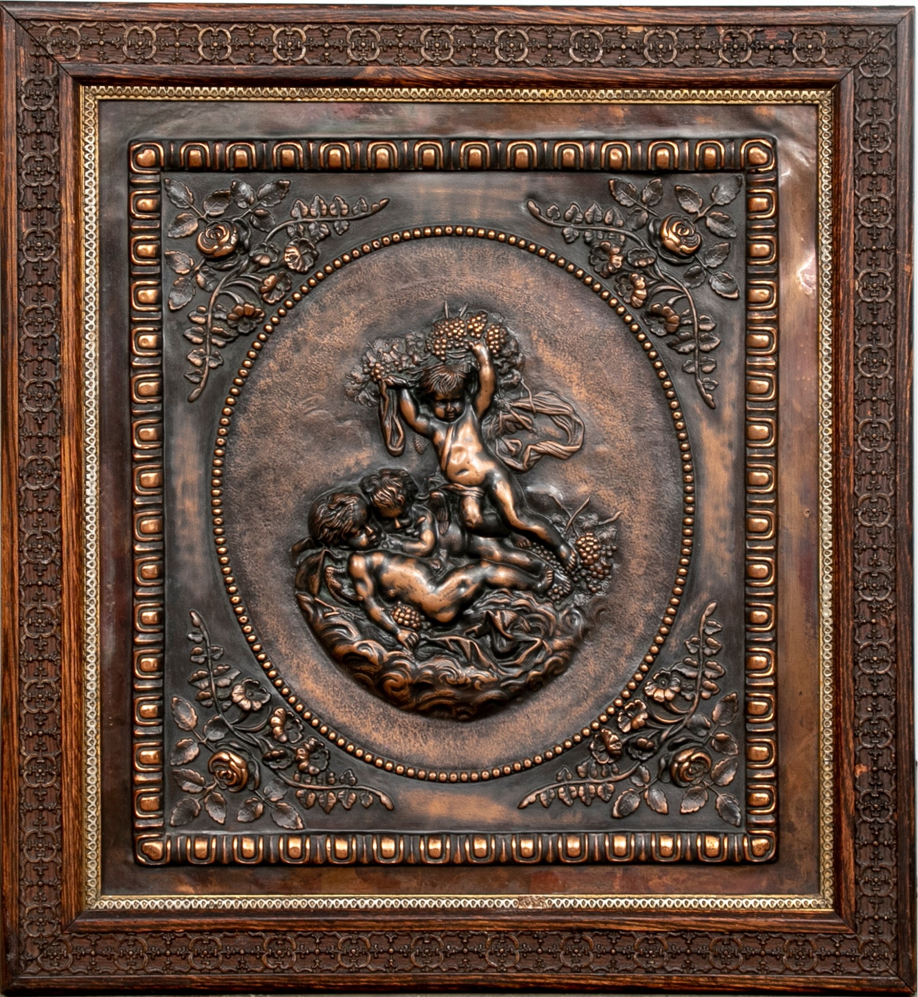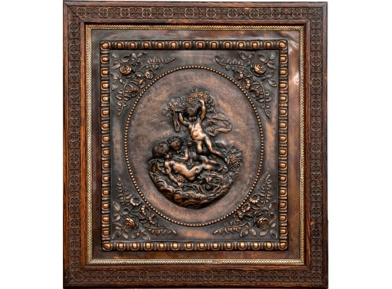 Copper relief plaque depicting three Cherubs - two are sleeping peacefully while the other looks down upon them, in an oval cartouche with florals on each corner. Nicely framed in a carved wooden frame.