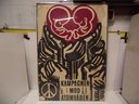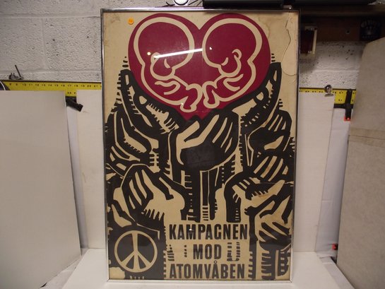 VINTAGE FRAMED DANISH ANTI-NUCLEAR POSTER FROM THE CAMPAIGN AGAINST NUCLEAR WEAPONS. GLASS ON FRAME IS BROKEN. PLEASE SEE PHOTOS FOR CONDITION.