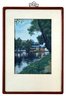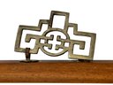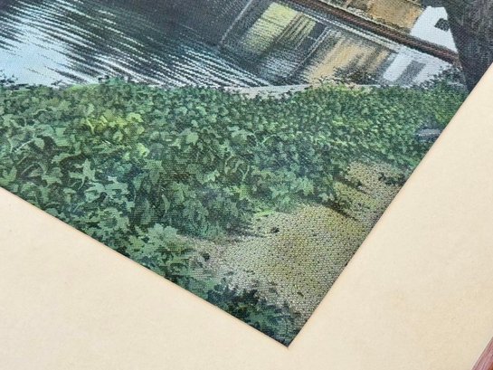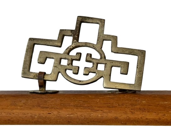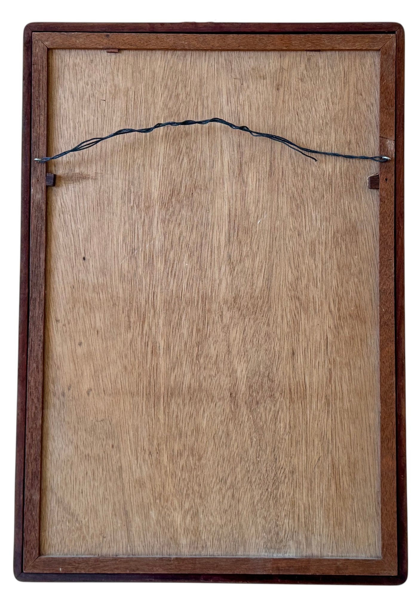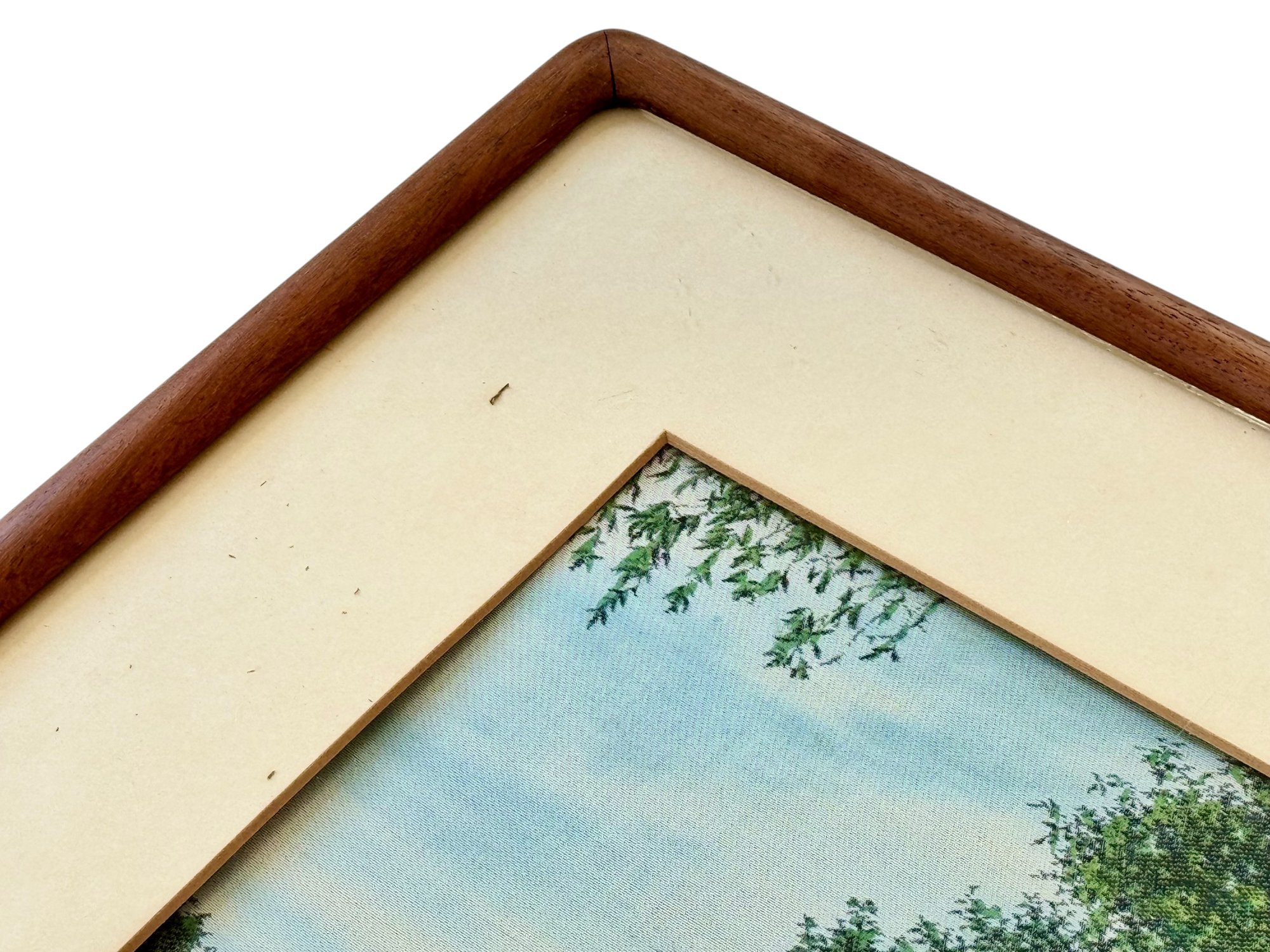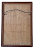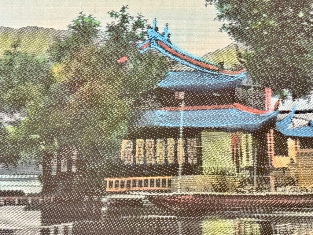 Possibly Tsuzure-ori, as the thin threads are so tightly woven it looks like a painting from a close distance. Matted in a lovely natural wood frame with metal decorative finial that one of the brackets is missing a piece. Interlocked wooden backing.