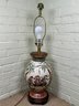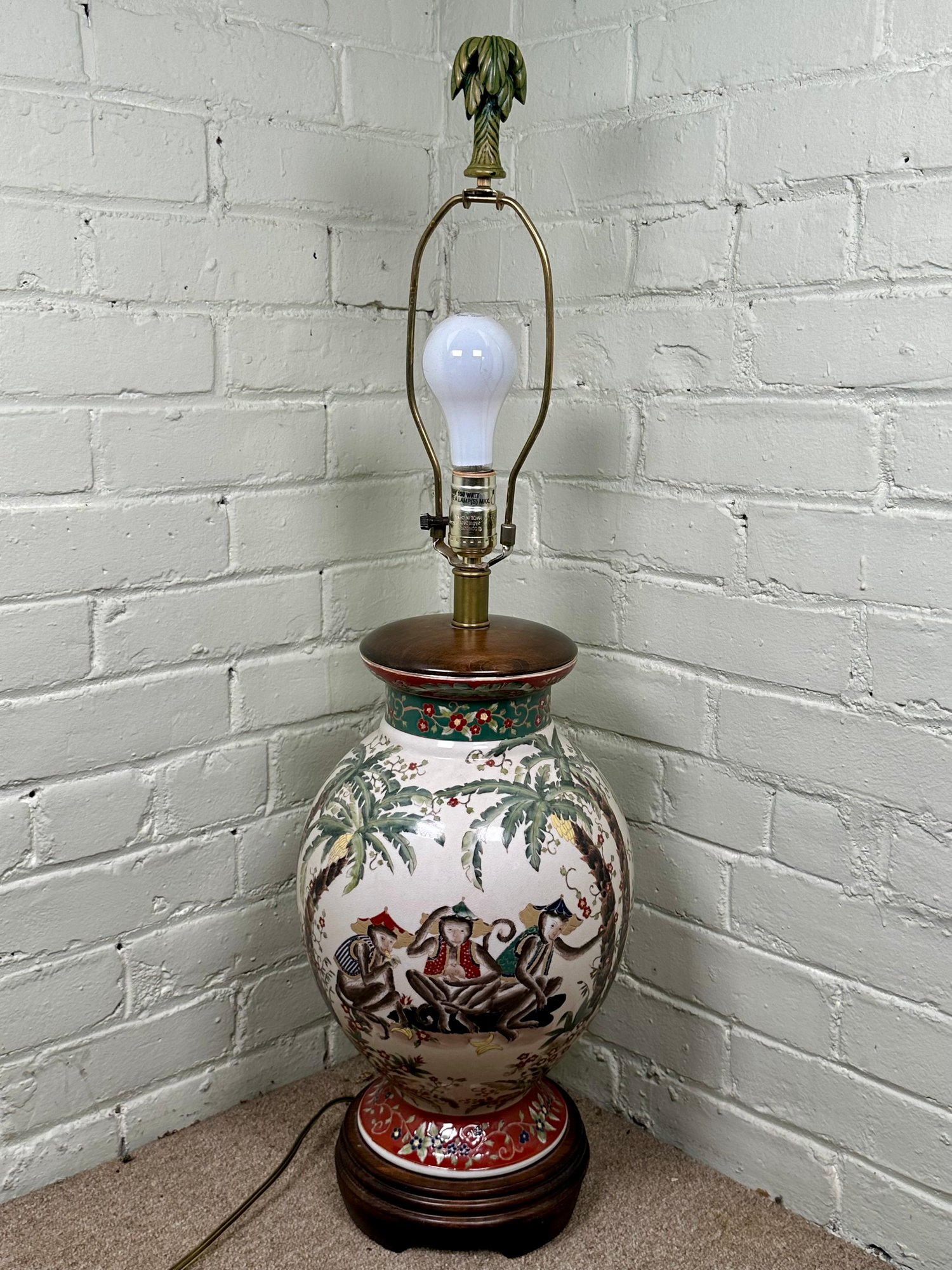 Vintage Frederick Cooper Chinoiserie Style Asian Hand Painted Palm Trees & Monkeys Table Lamp that rests on a