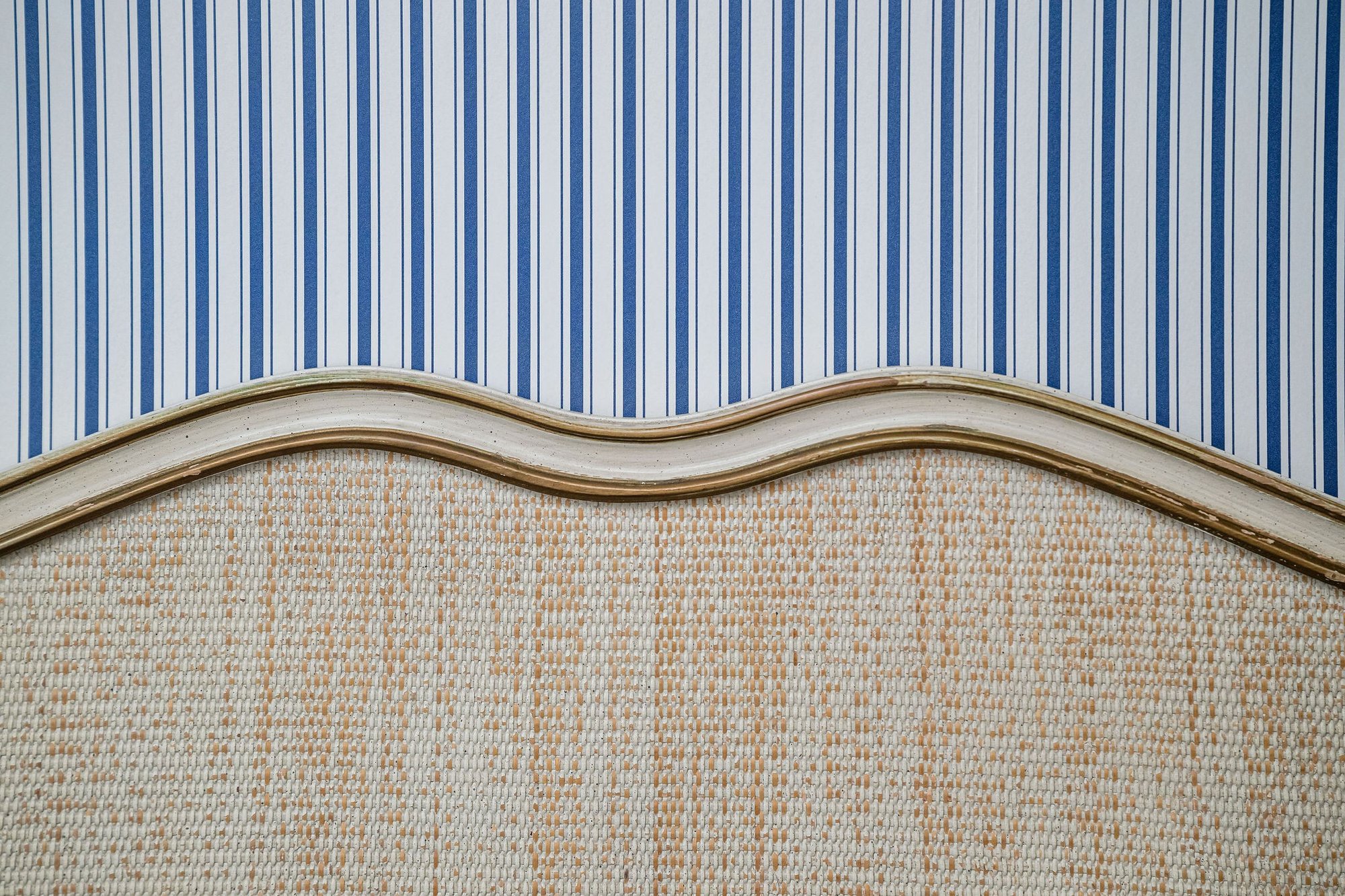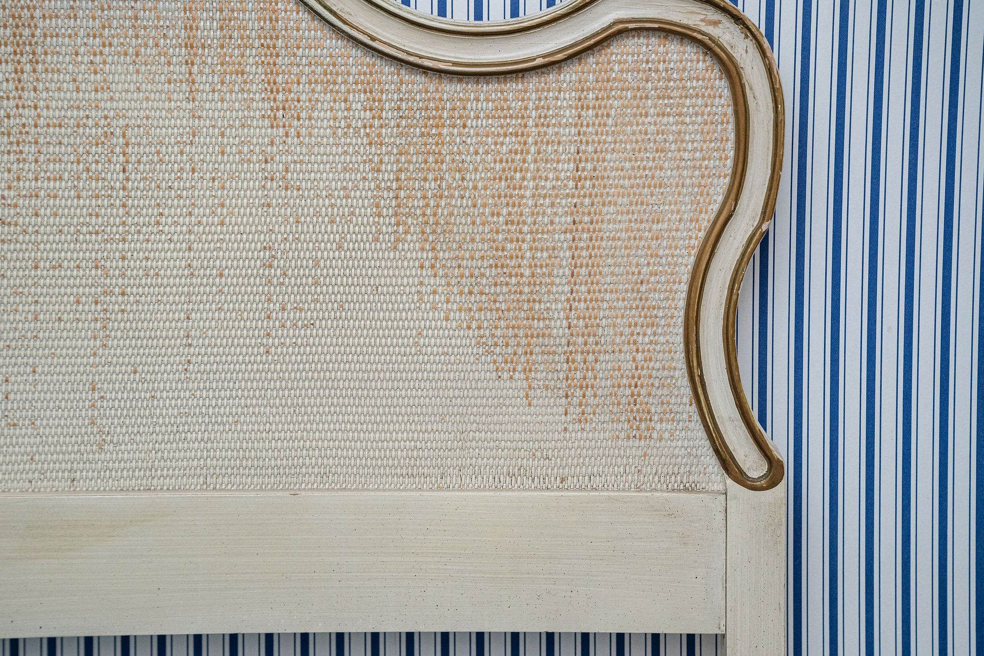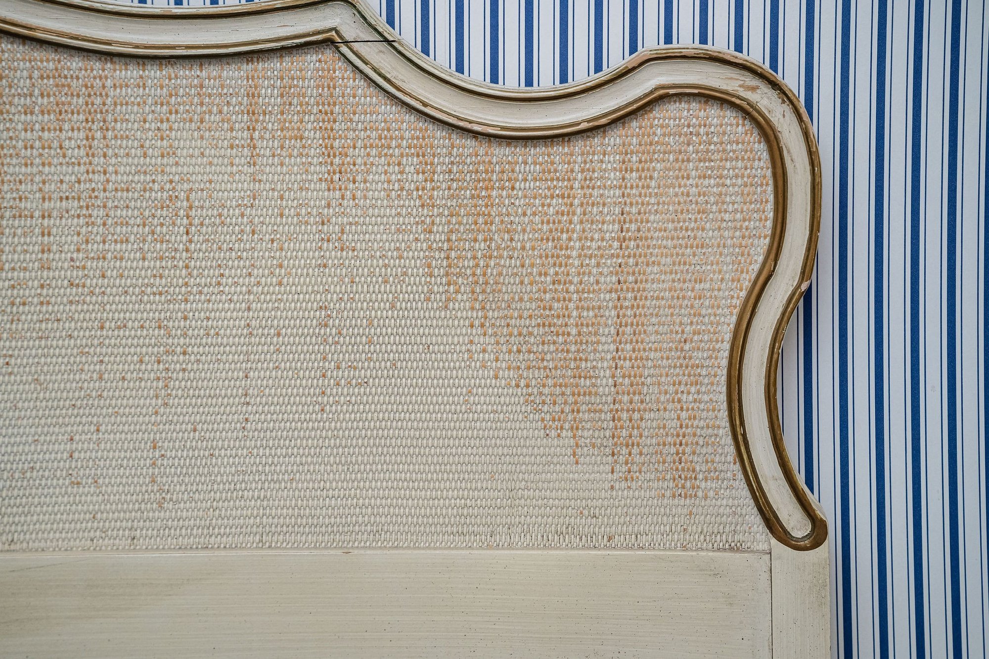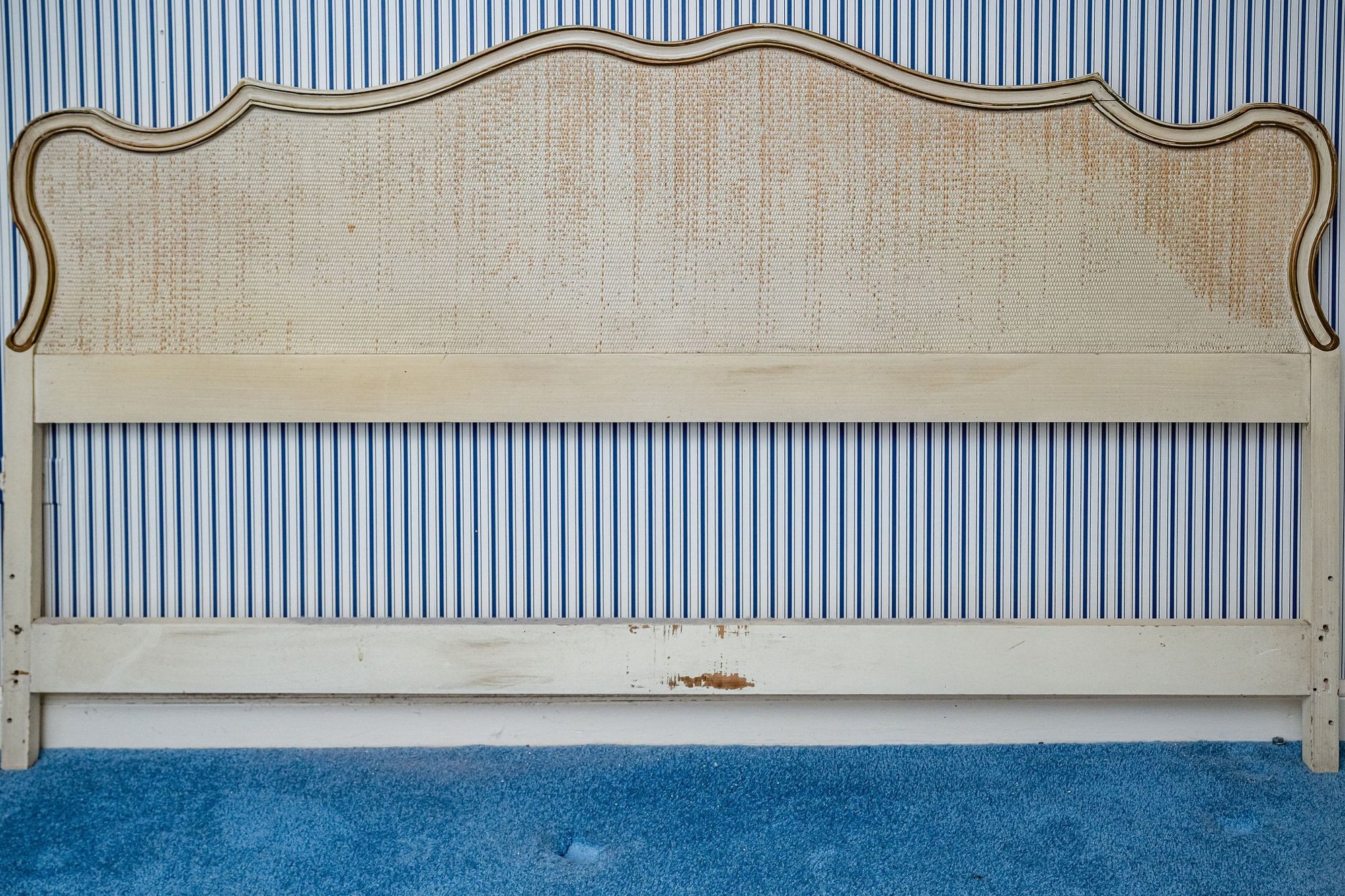 Pretty French white and gold headboard with a slightly distressed finish and blemishes from prior use.