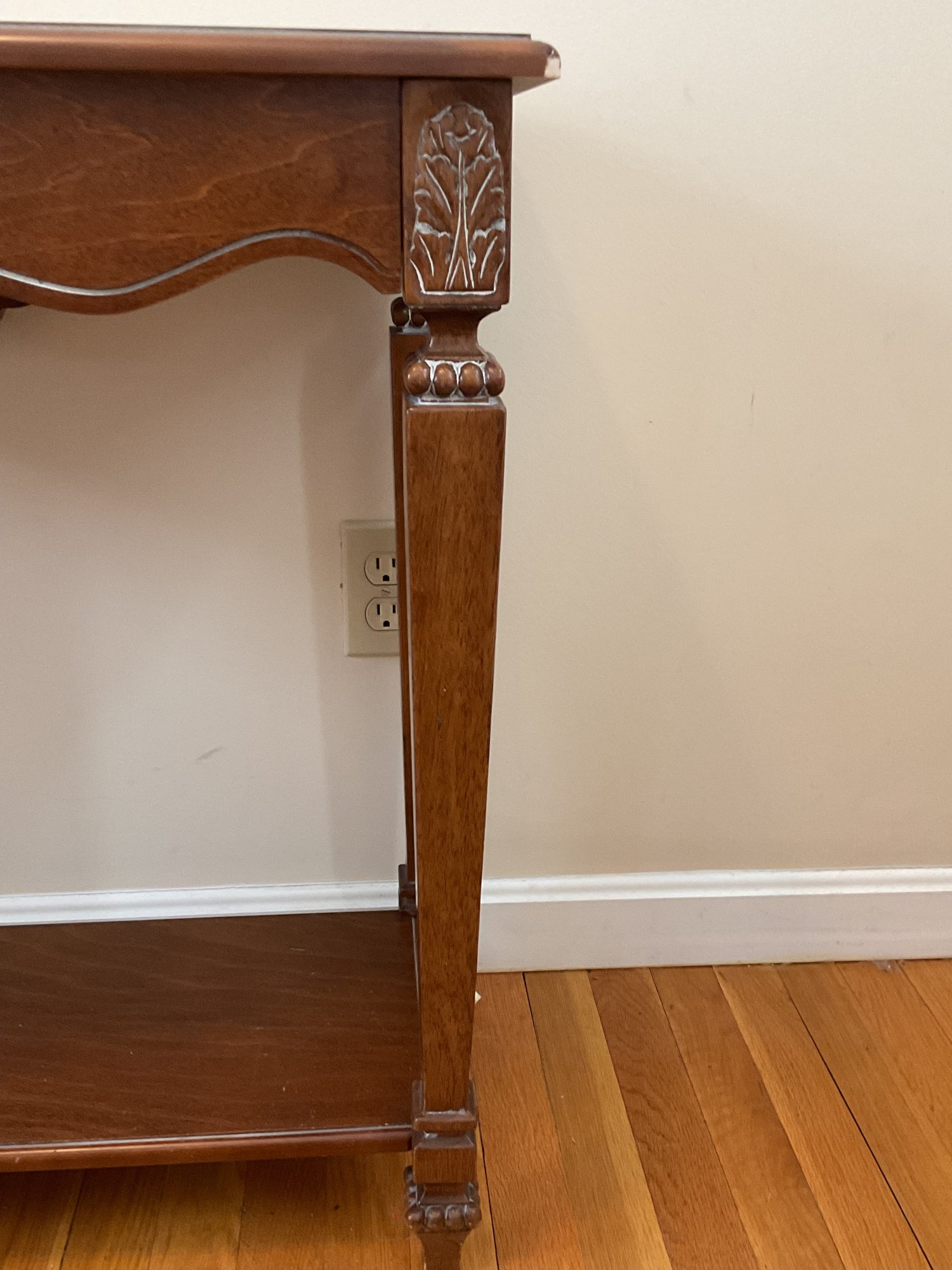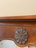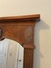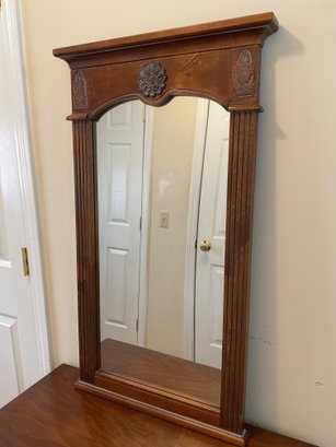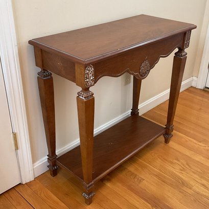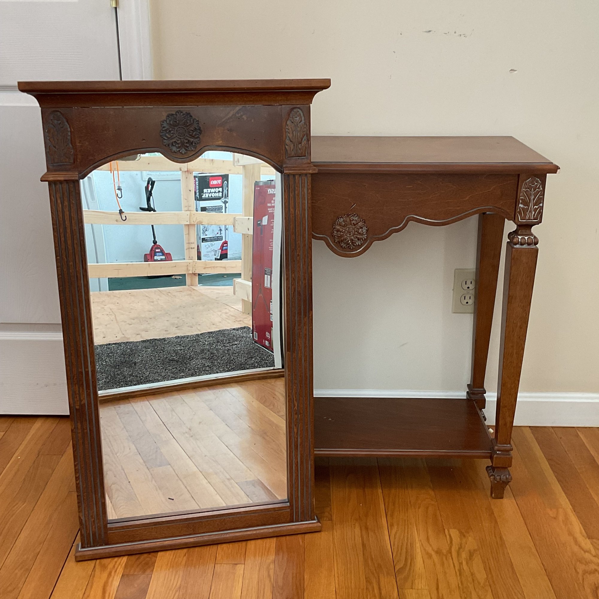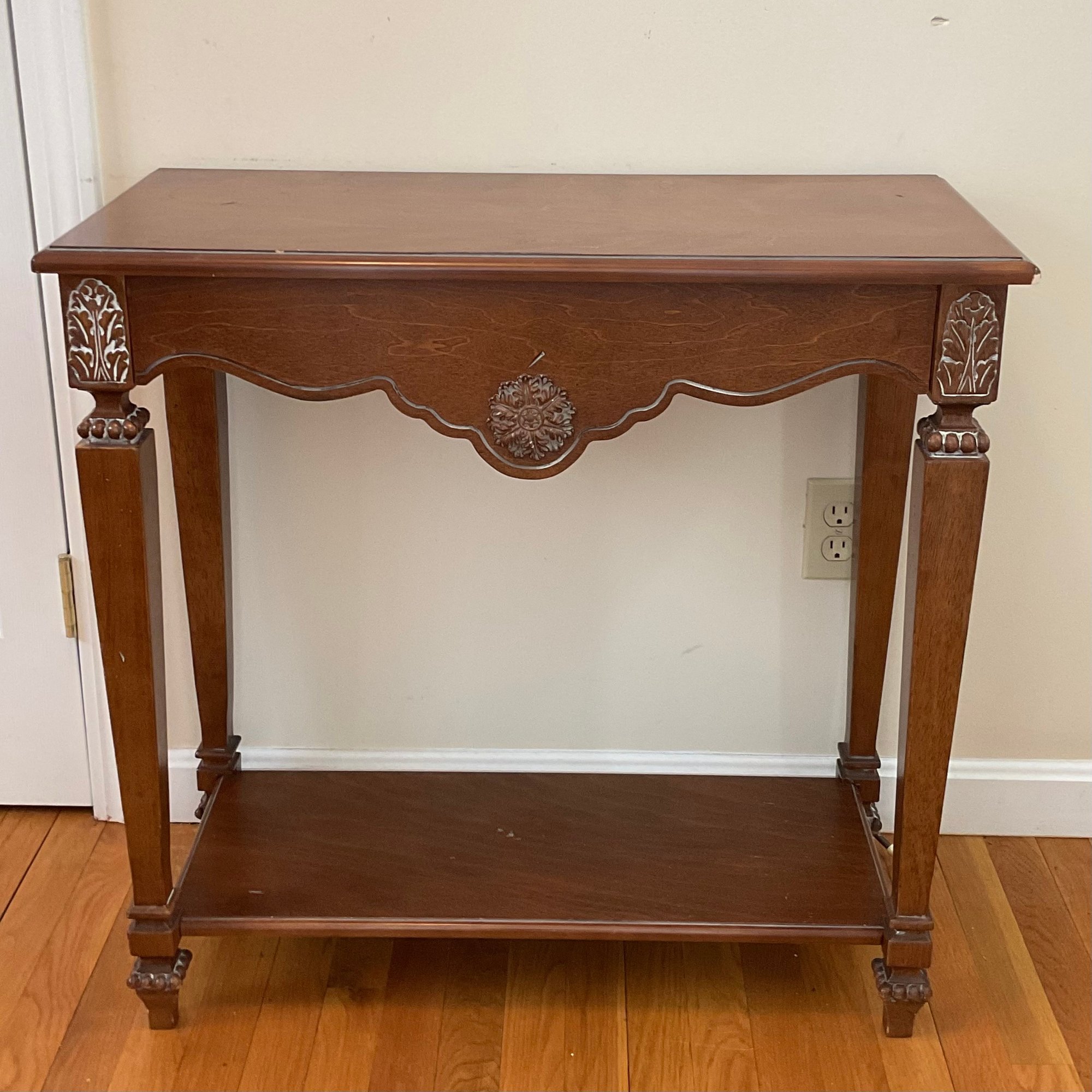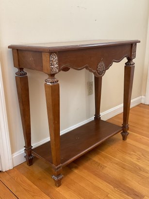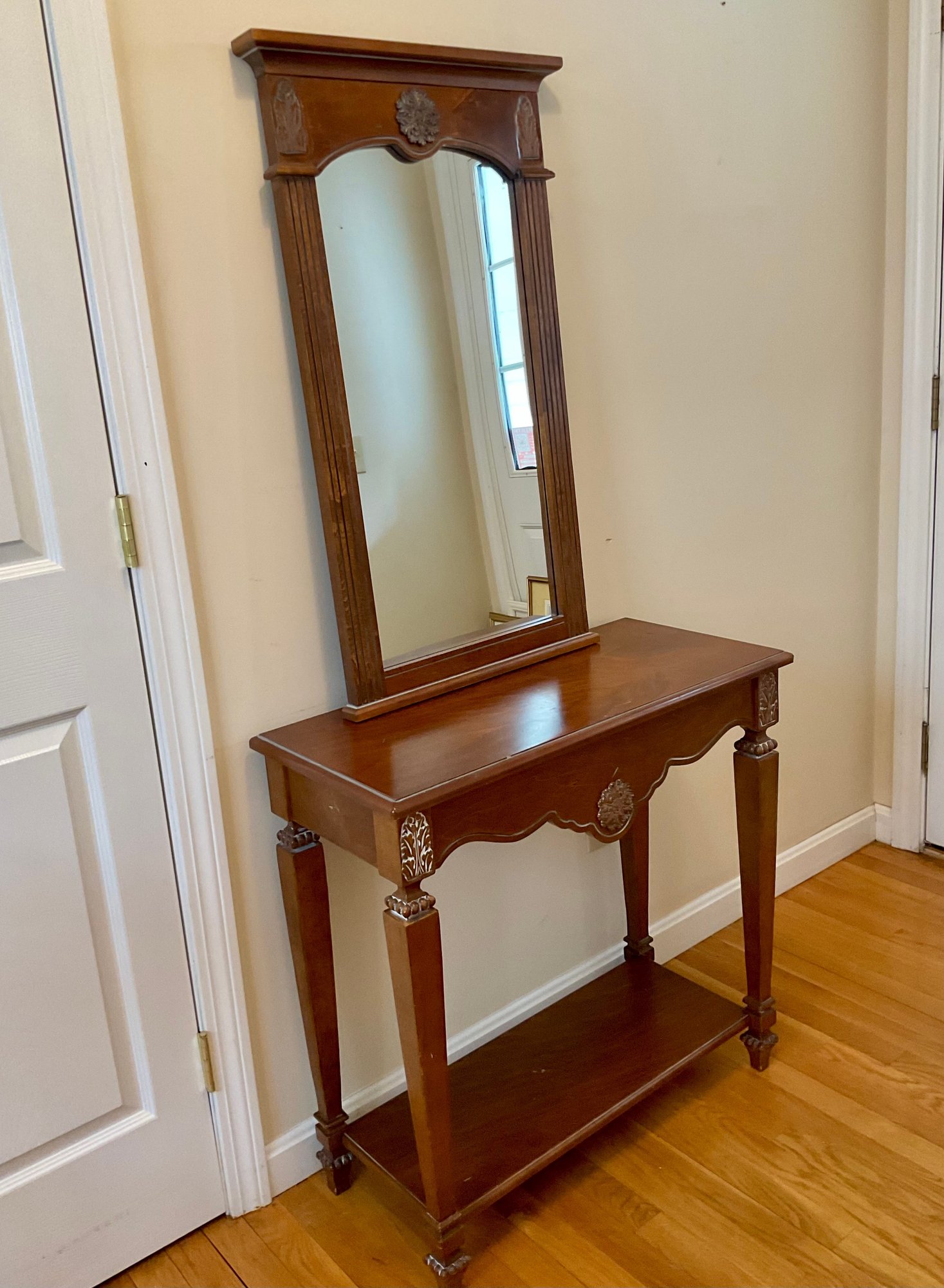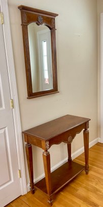 Elegant two-piece French Provincial style set. Featuring a warm wood finish, the console table and matching wall mirror showcase classic scalloped aprons and ornate floral carved medallions. The table is designed with a functional lower display shelf and tapered legs accented with carved details.