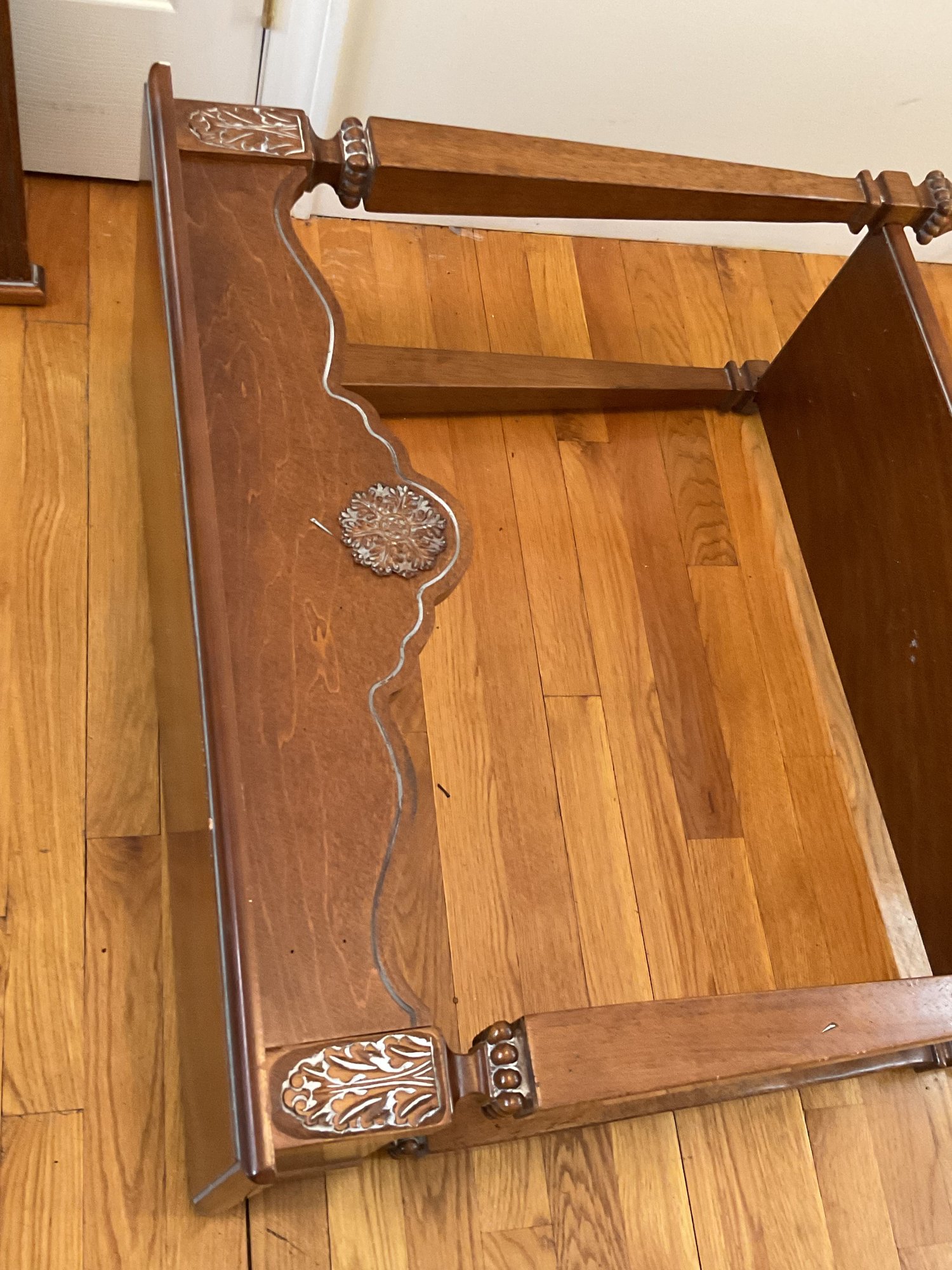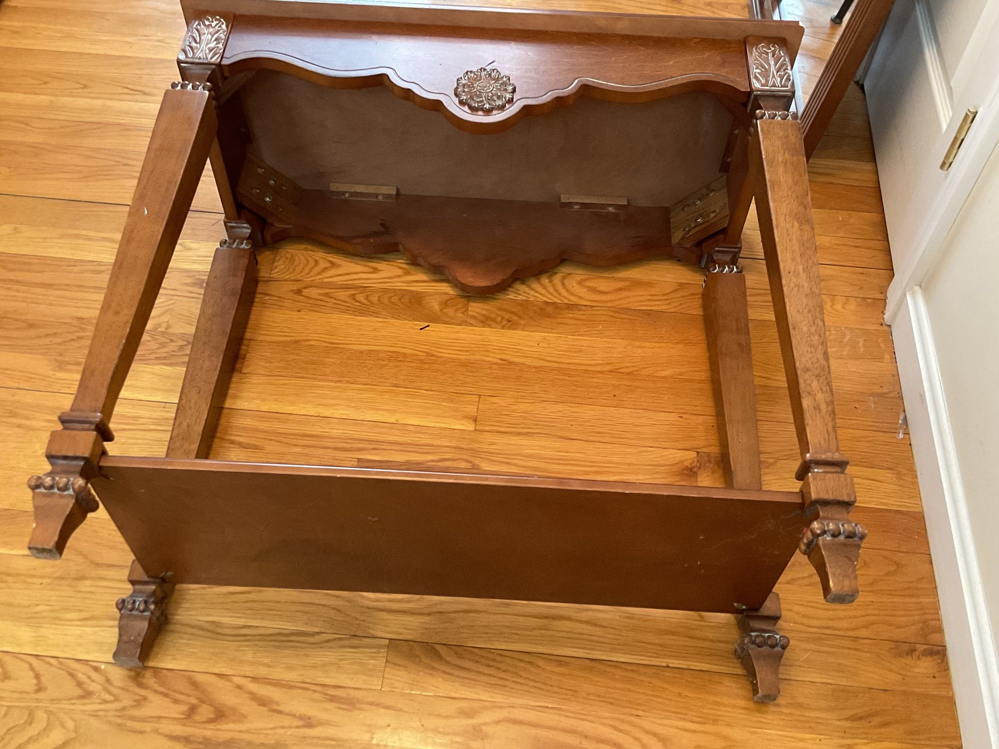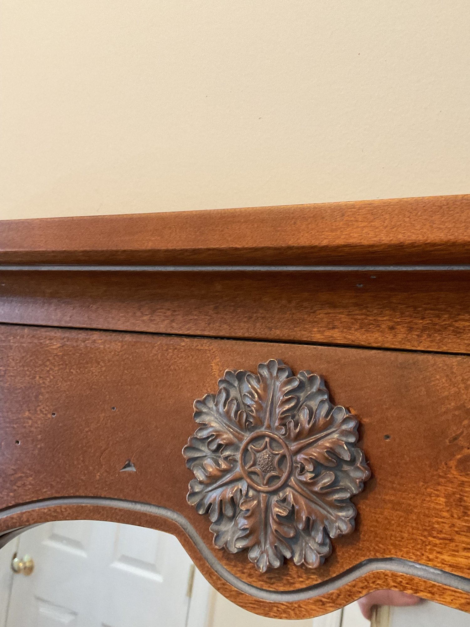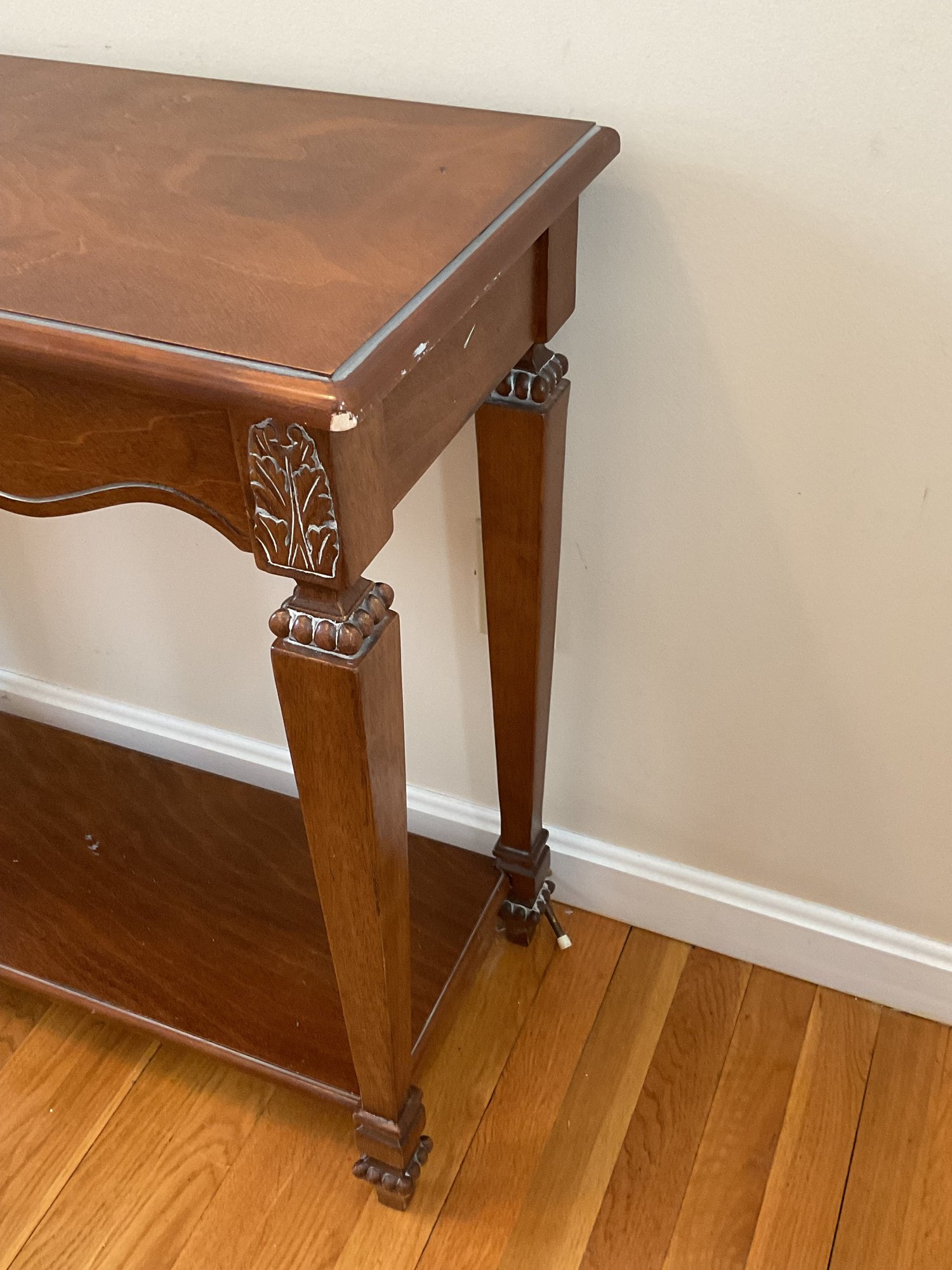 Elegant two-piece French Provincial style set. Featuring a warm wood finish, the console table and matching wall mirror showcase classic scalloped aprons and ornate floral carved medallions. The table is designed with a functional lower display shelf and tapered legs accented with carved details.