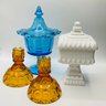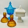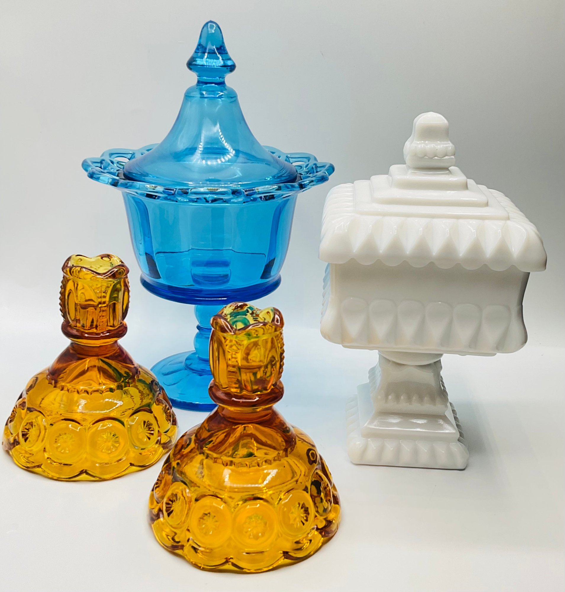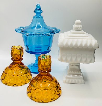 This attractive lot features four pieces of vintage pressed and molded glassware in a variety of styles and colors, perfect for a collector or as vibrant home accents.