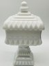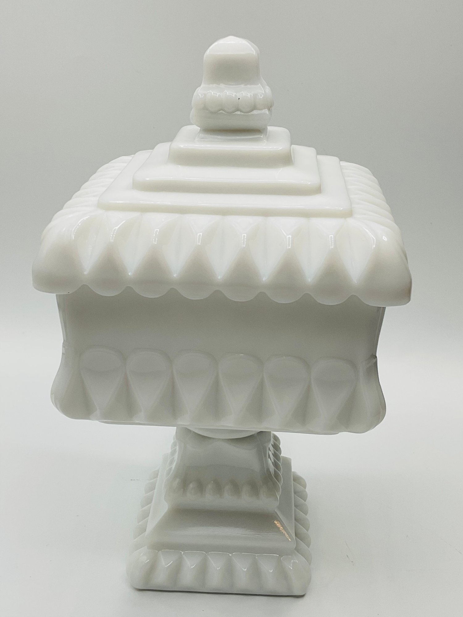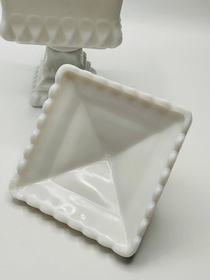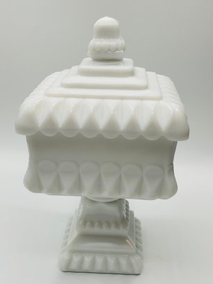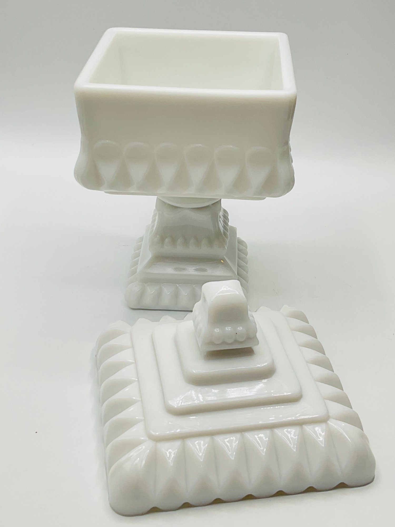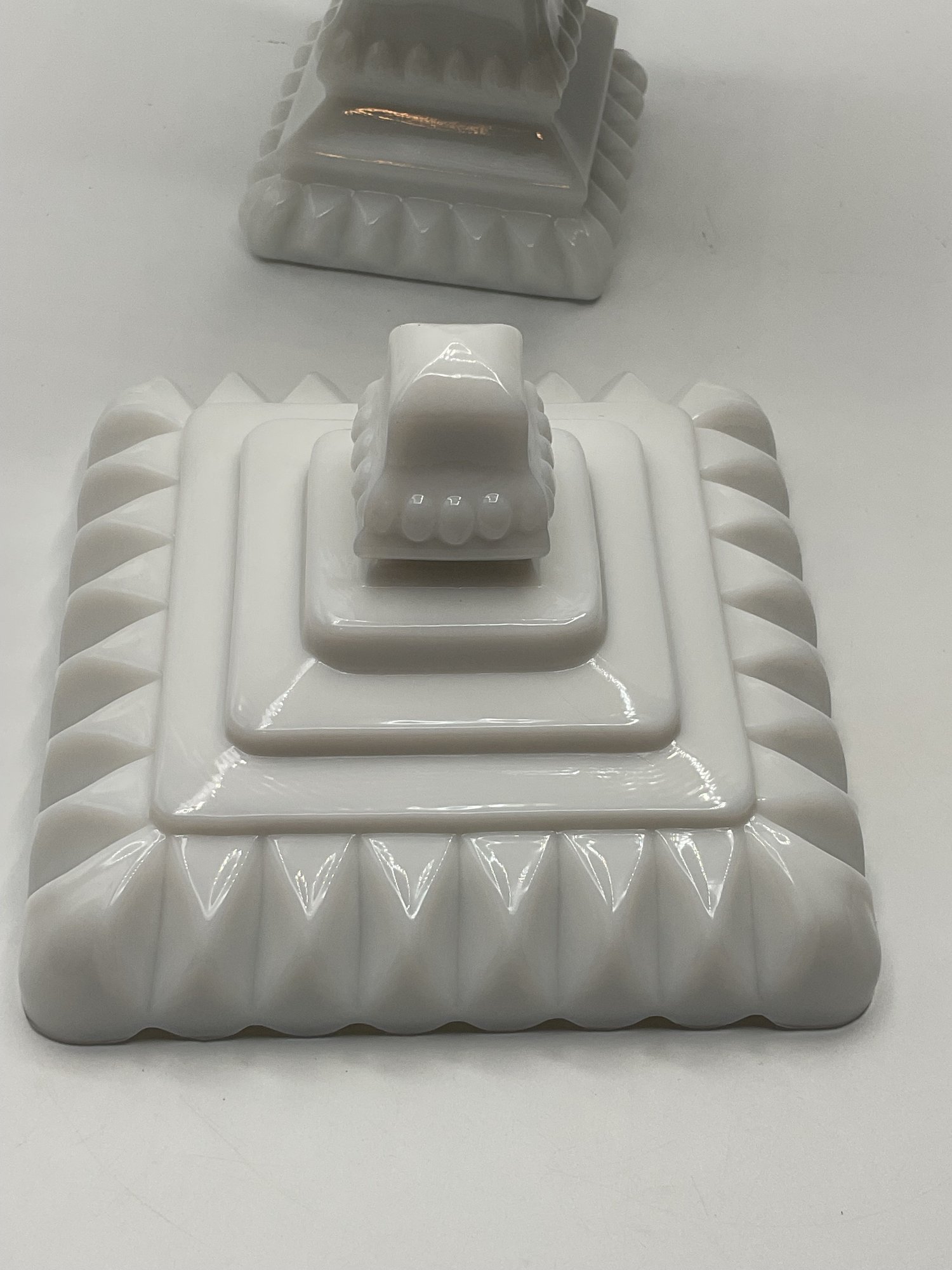 White Milk Glass Pedestal Candy Dish: A square, opaque white milk glass lidded dish with a tiered, architectural design and a pedestal base.