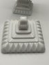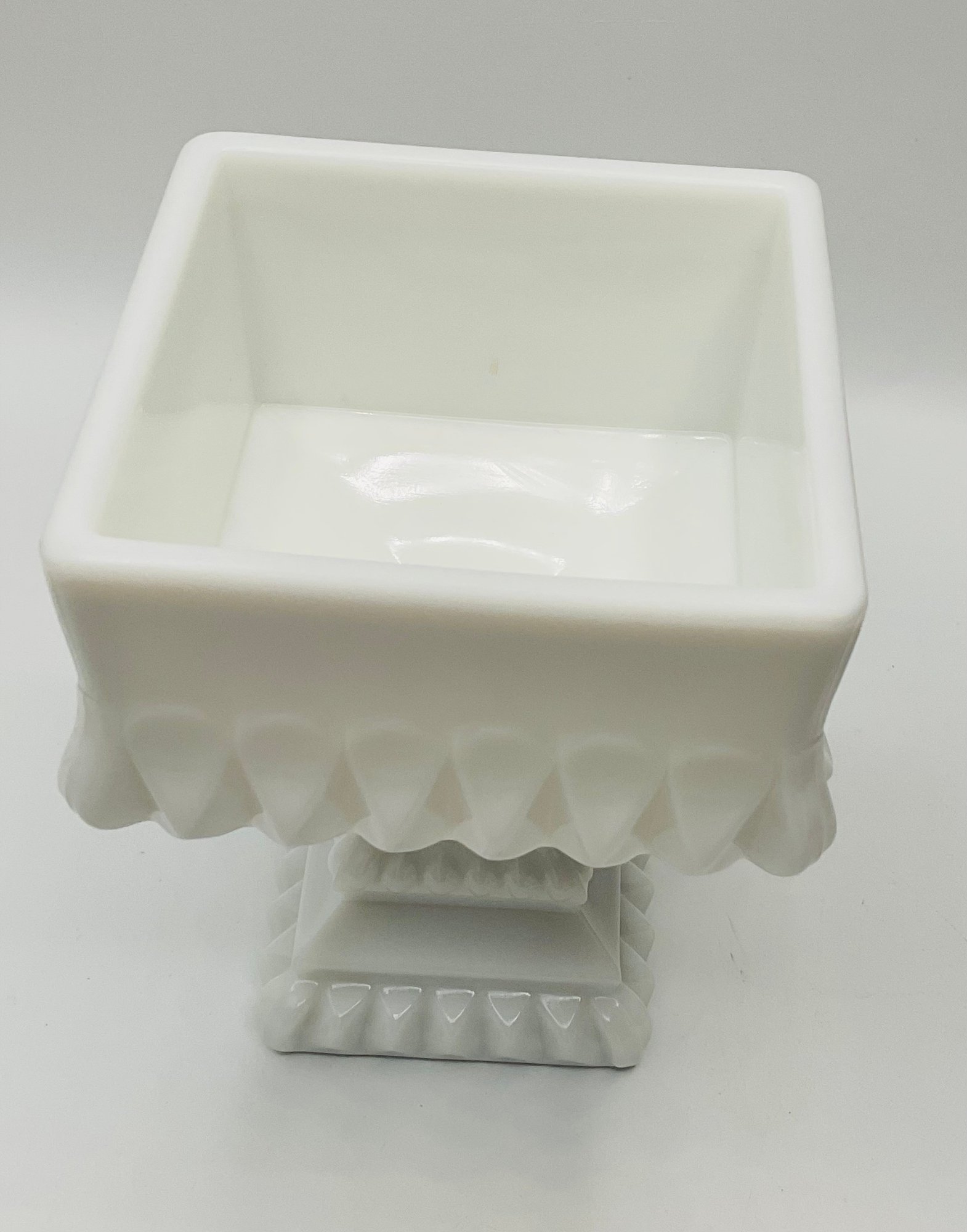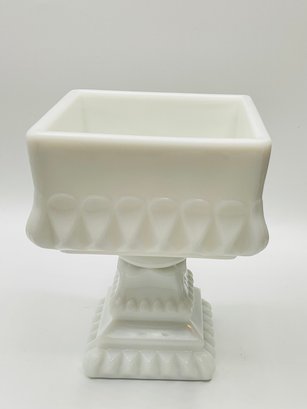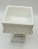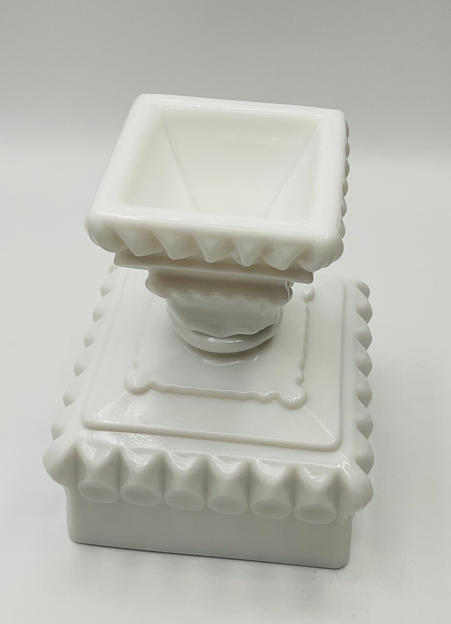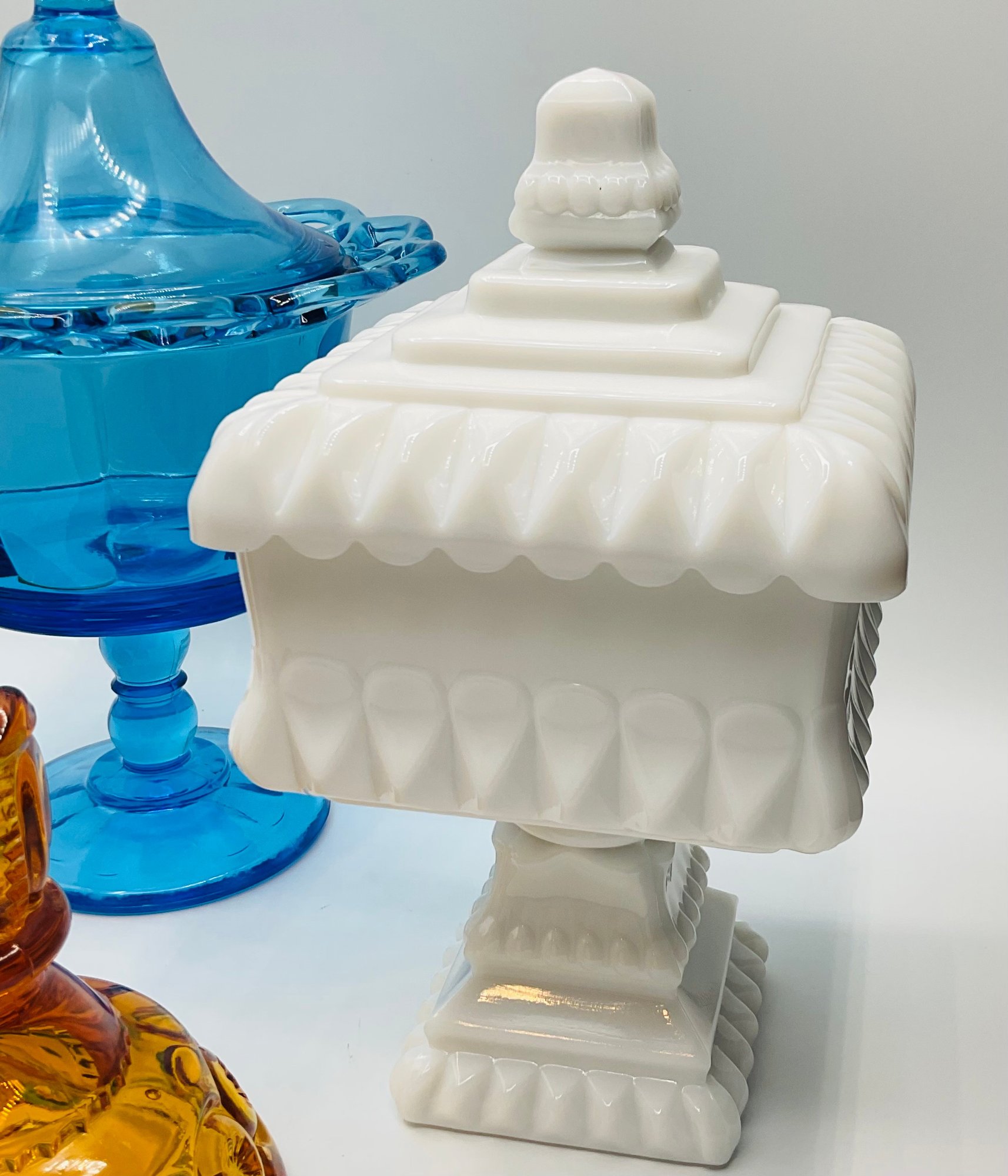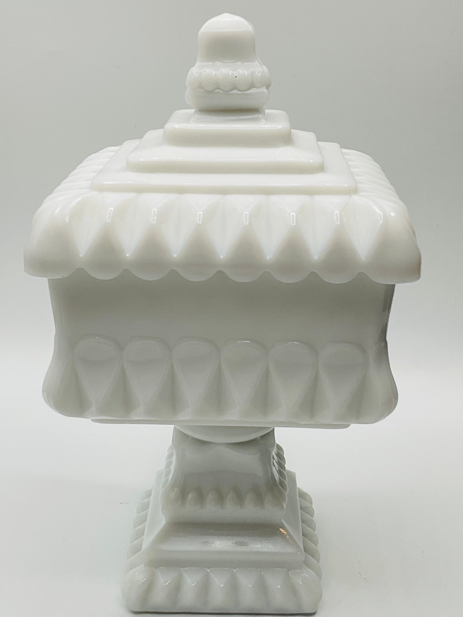 White Milk Glass Pedestal Candy Dish: A square, opaque white milk glass lidded dish with a tiered, architectural design and a pedestal base.