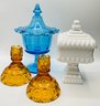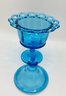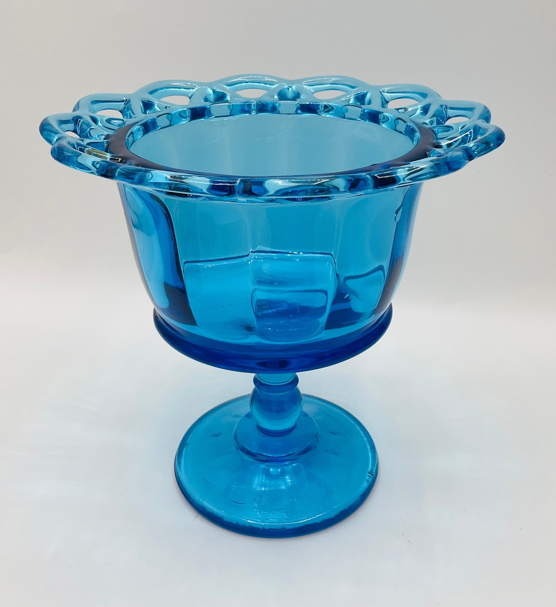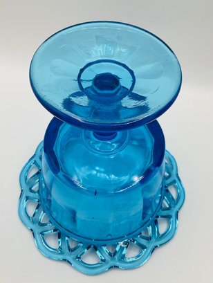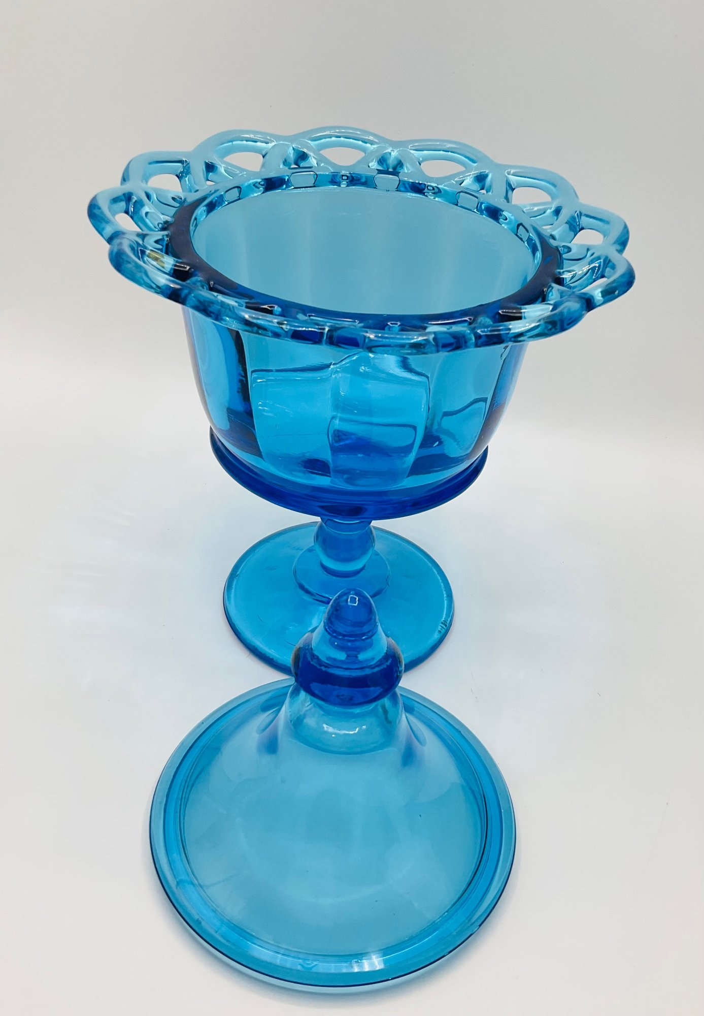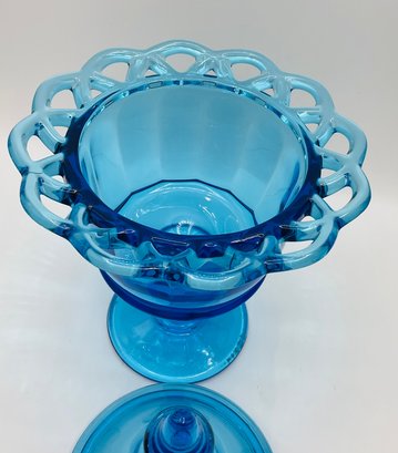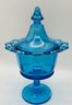 Blue Pedestal Compote with Lid: A striking translucent blue glass dish featuring a scalloped rim and a matching pointed finial lid.