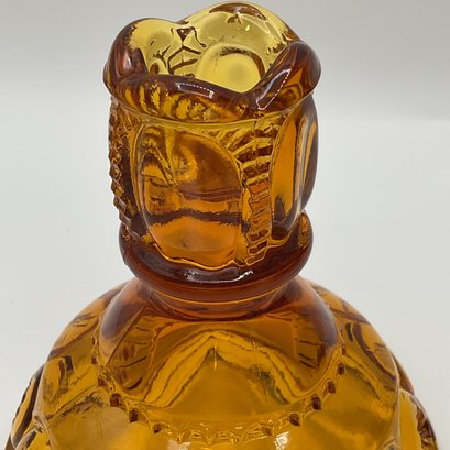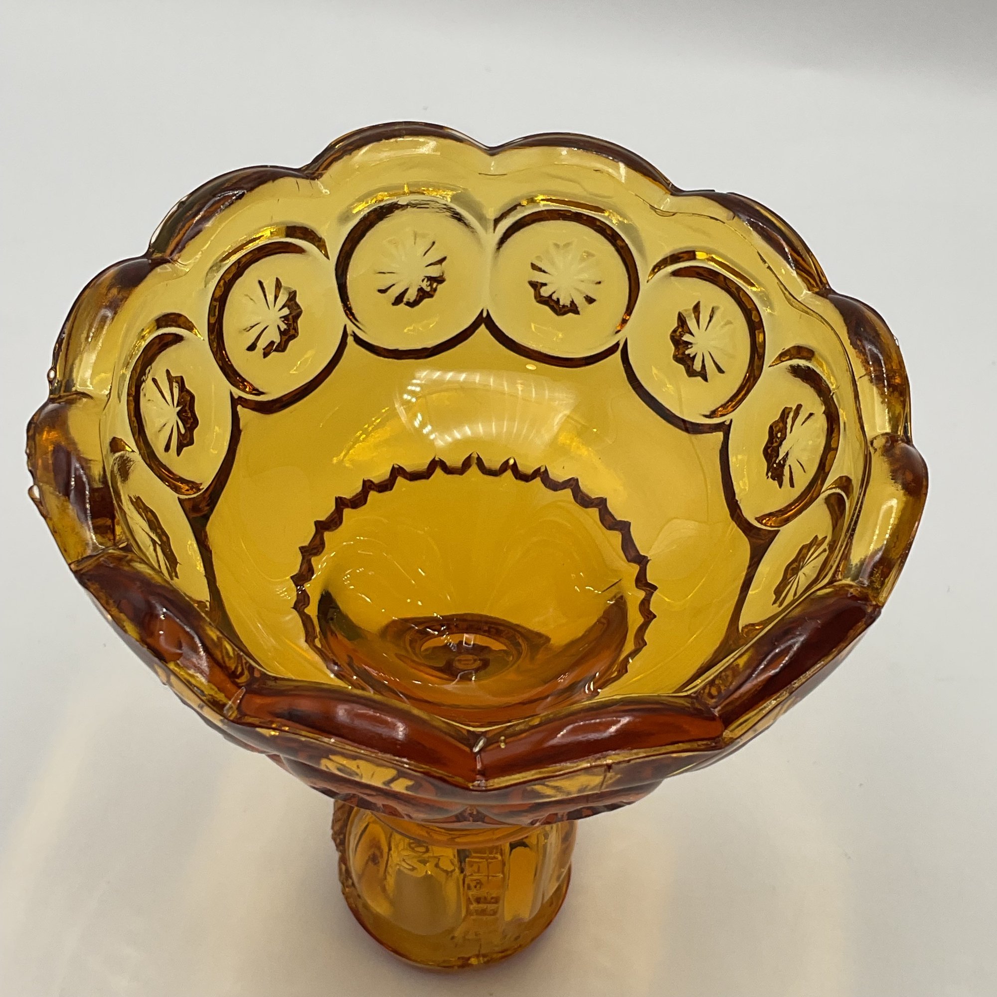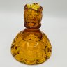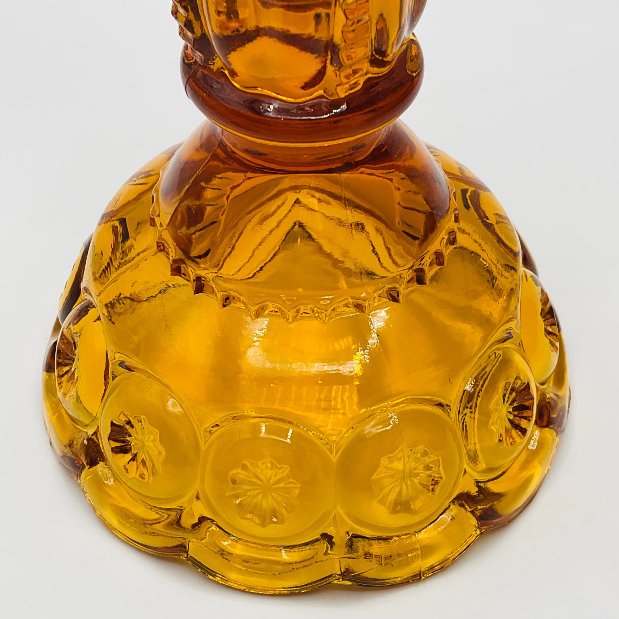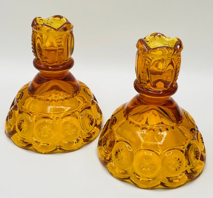 Amber "Moon and Star" Candlestick Holders (Pair): Two classic amber-toned glass candle holders in the popular "Moon and Star" pattern, known for its deep circular indentations and starburst accents.