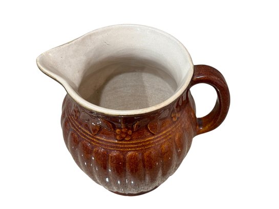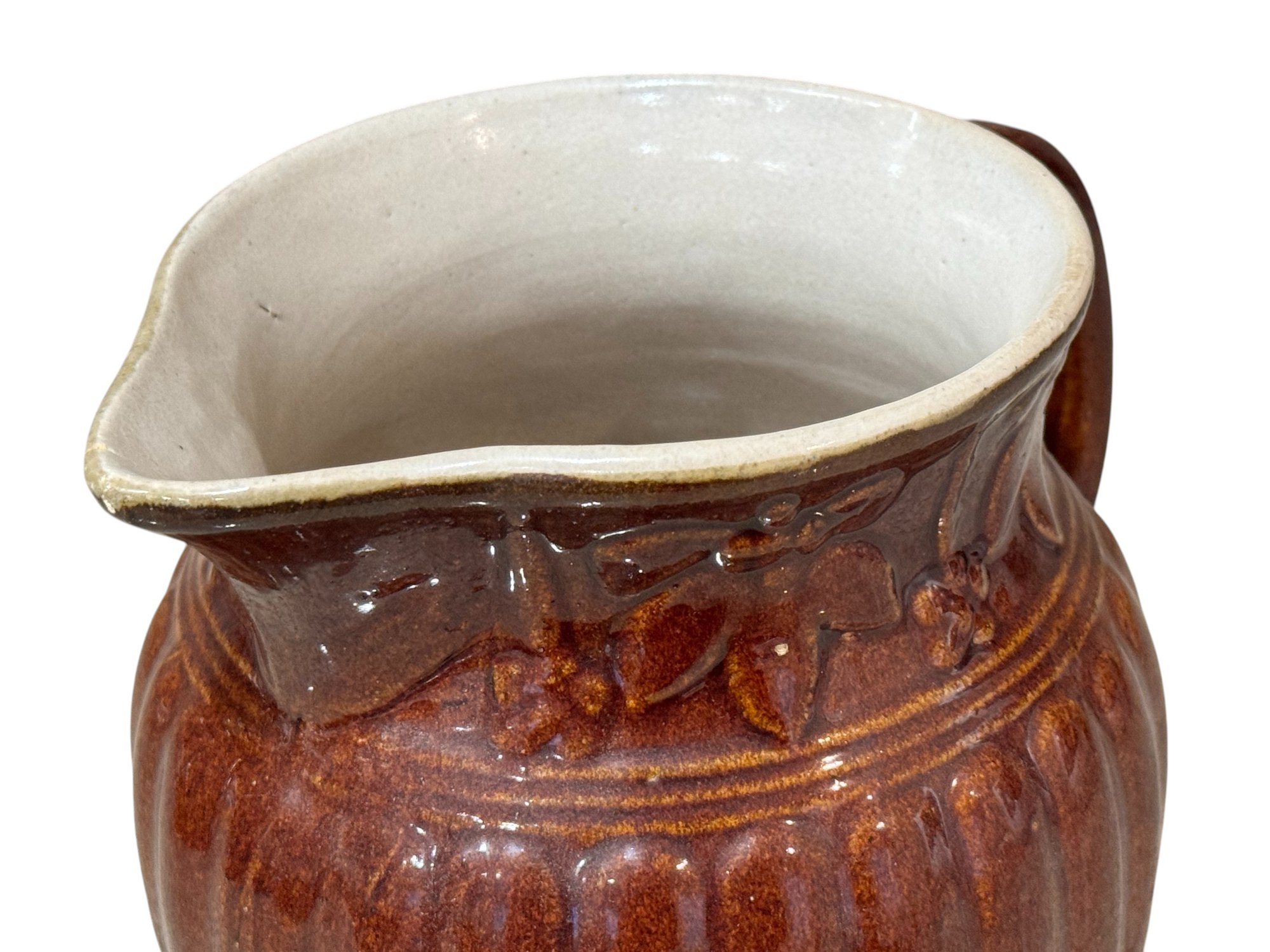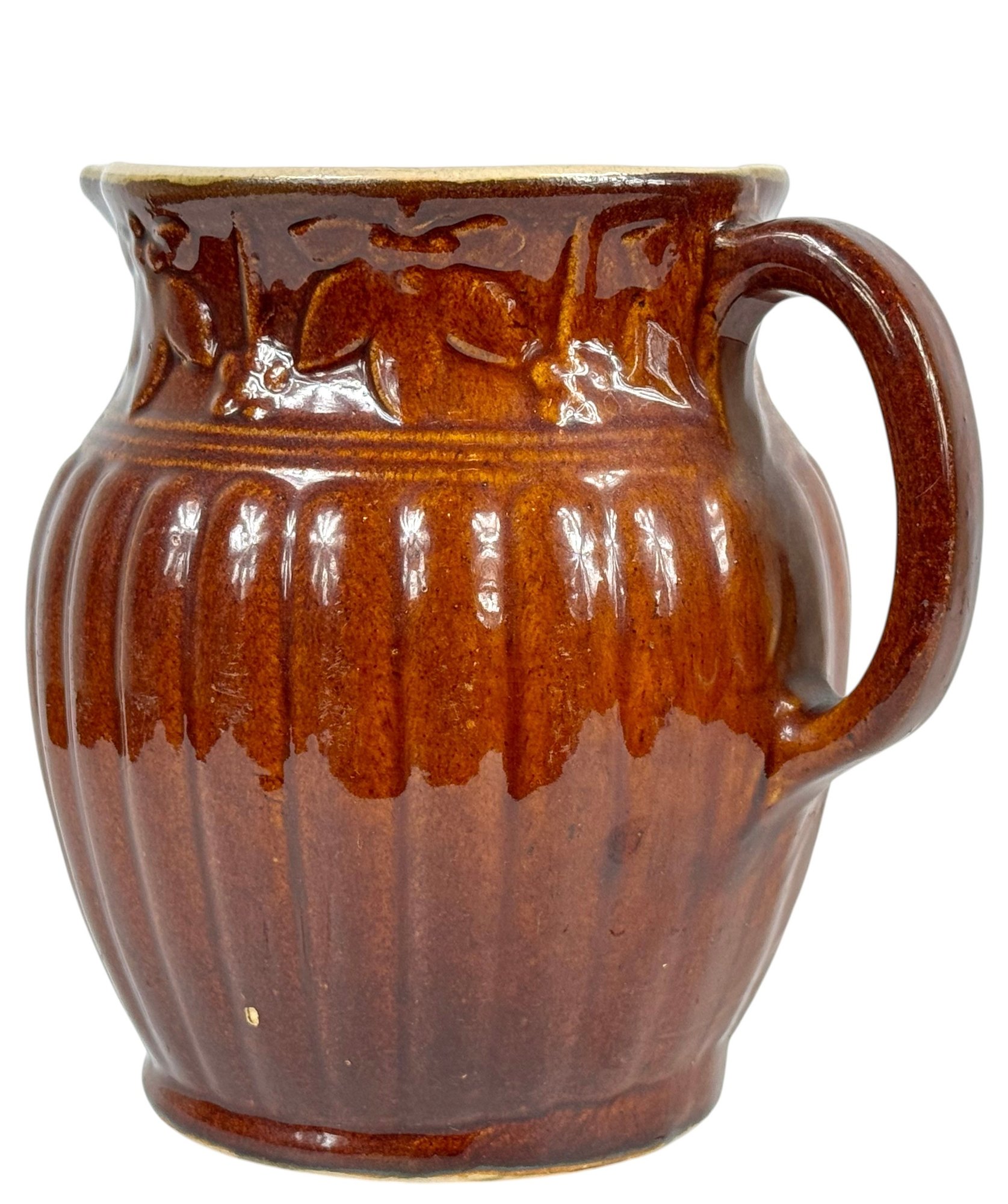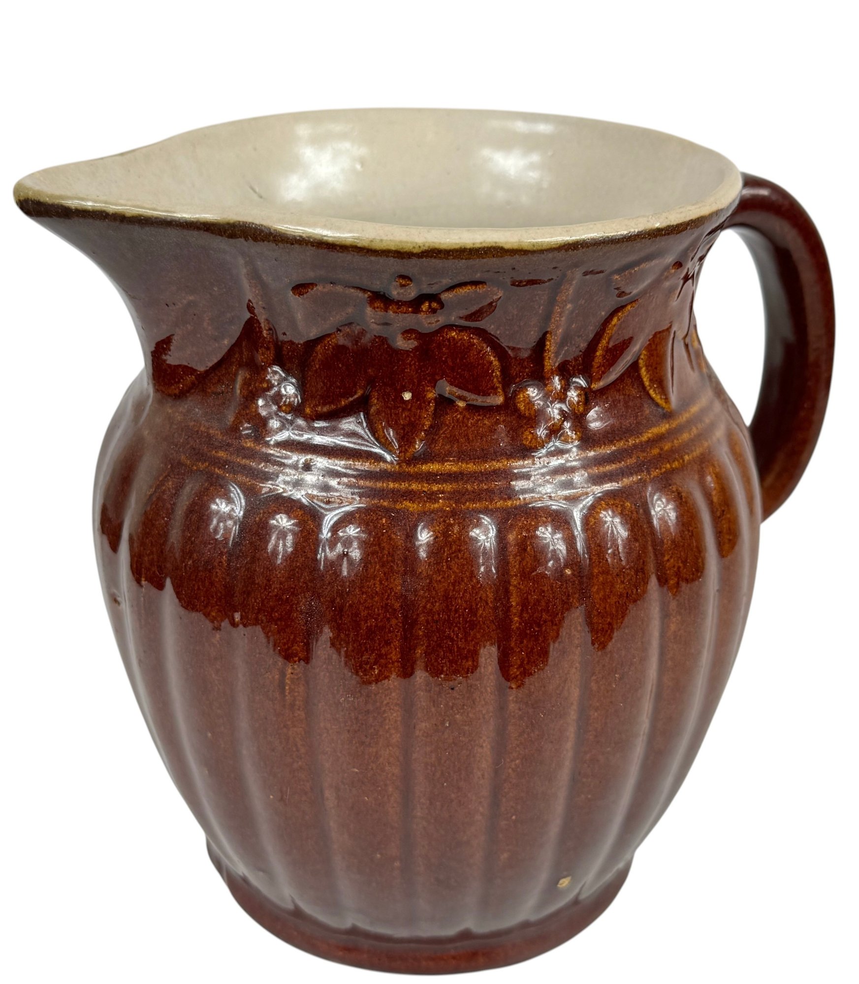 Brown glaze with cream interior 7 5/8 tall stoneware pitcher with leaf and berry band at shoulder and ribbed/fluted body.