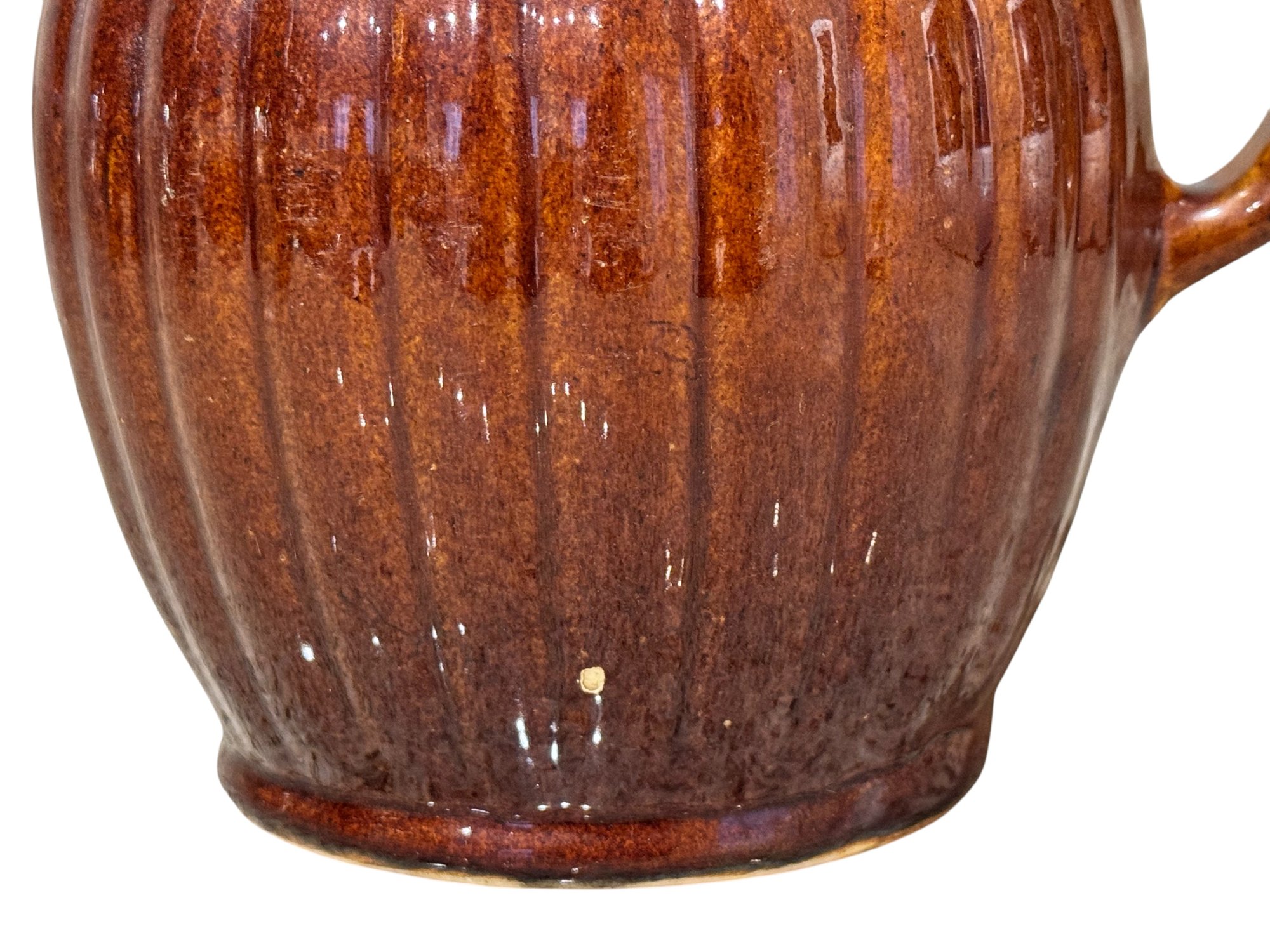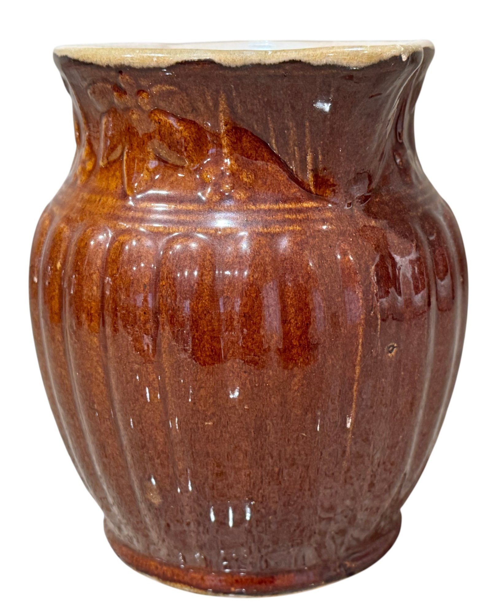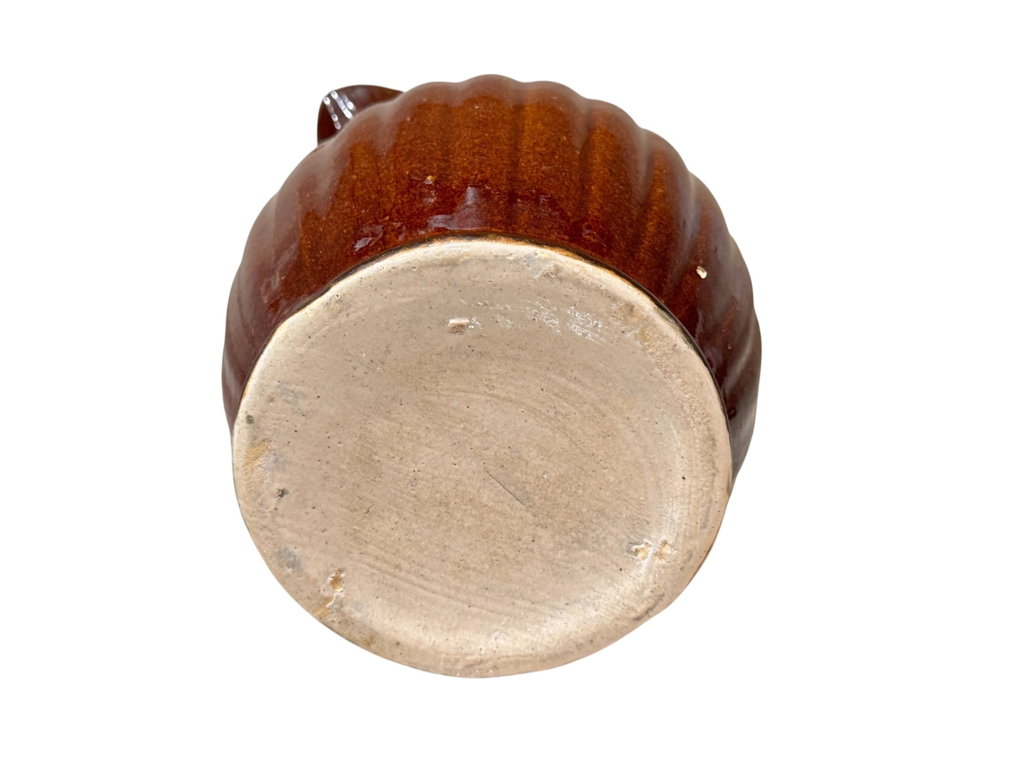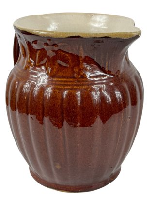 Brown glaze with cream interior 7 5/8 tall stoneware pitcher with leaf and berry band at shoulder and ribbed/fluted body.